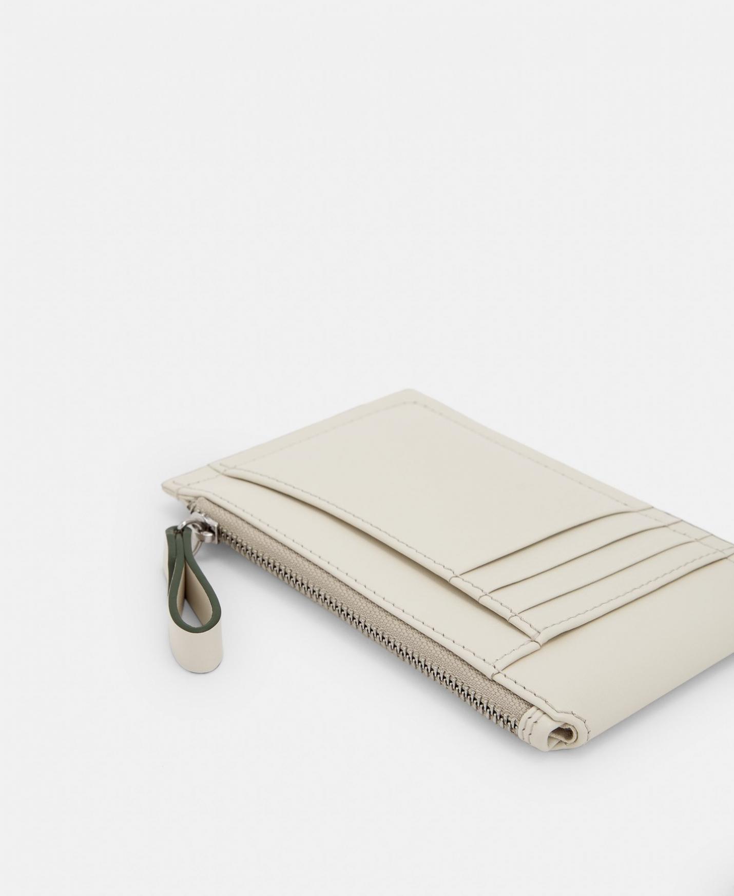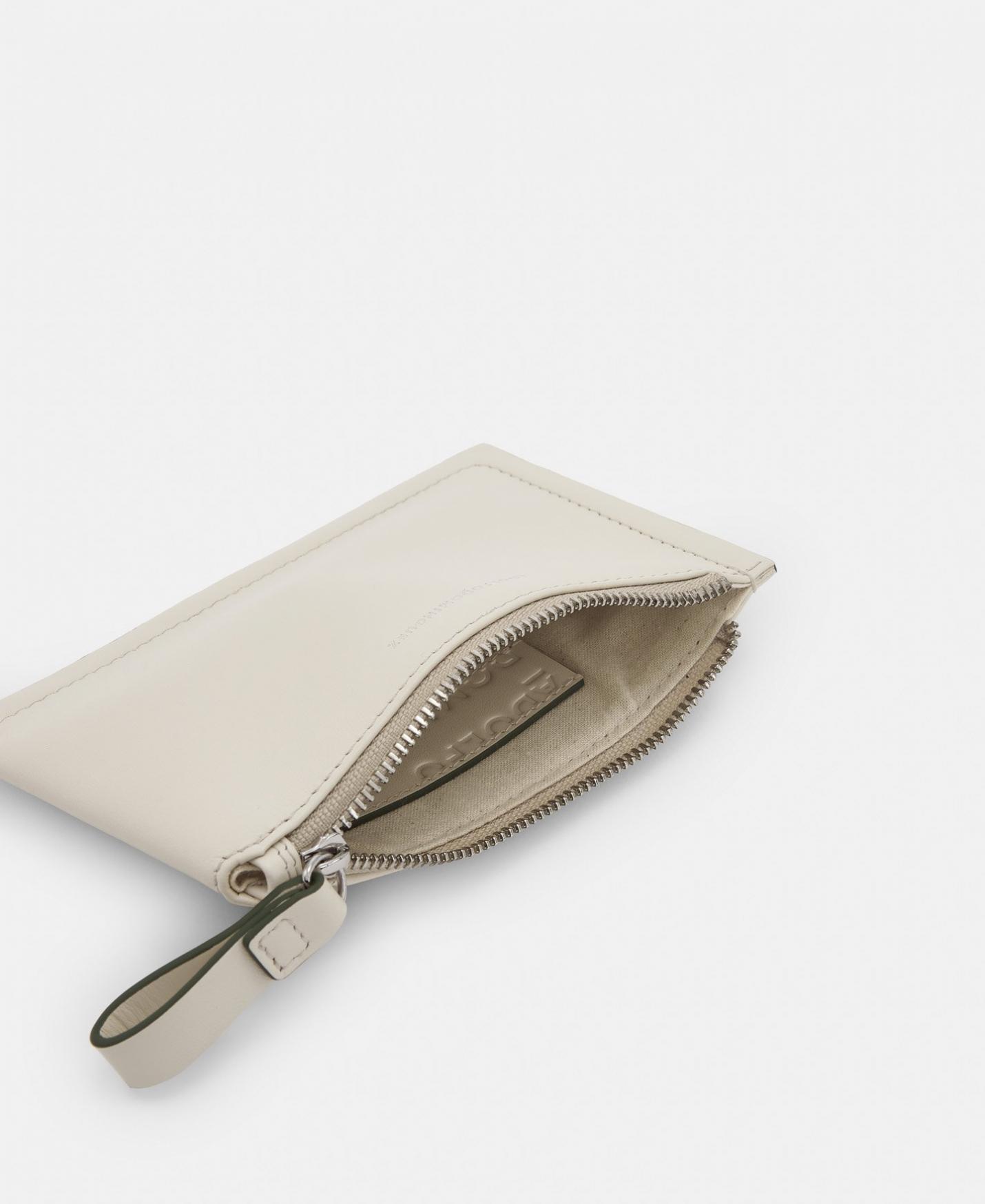 Cartera pequeña en piel. Con interior de algodón orgánico, un único compartimento, cierre cremallera, logotipo delantero y espacio para tarjetas.