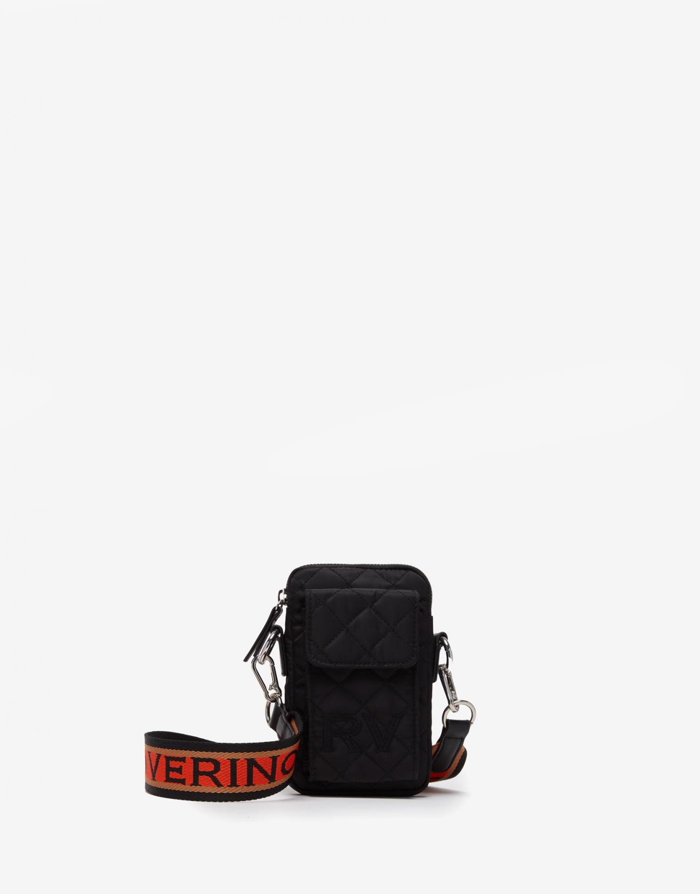 Bolso mini para móvil confeccionado en nailon acolchado color negro. Asa de hombro con cinta personalizada en naranja y negro. Cierre con cremallera superior, bolsillo de tapeta con broche y logo bordado a tono en la parte delantera y de cremallera plana en la parte trasera. Interior con bolsillo para tarjetas. Asa: 118 cm. Medidas aproximadas: 10,5 x 17 x 2 cm.