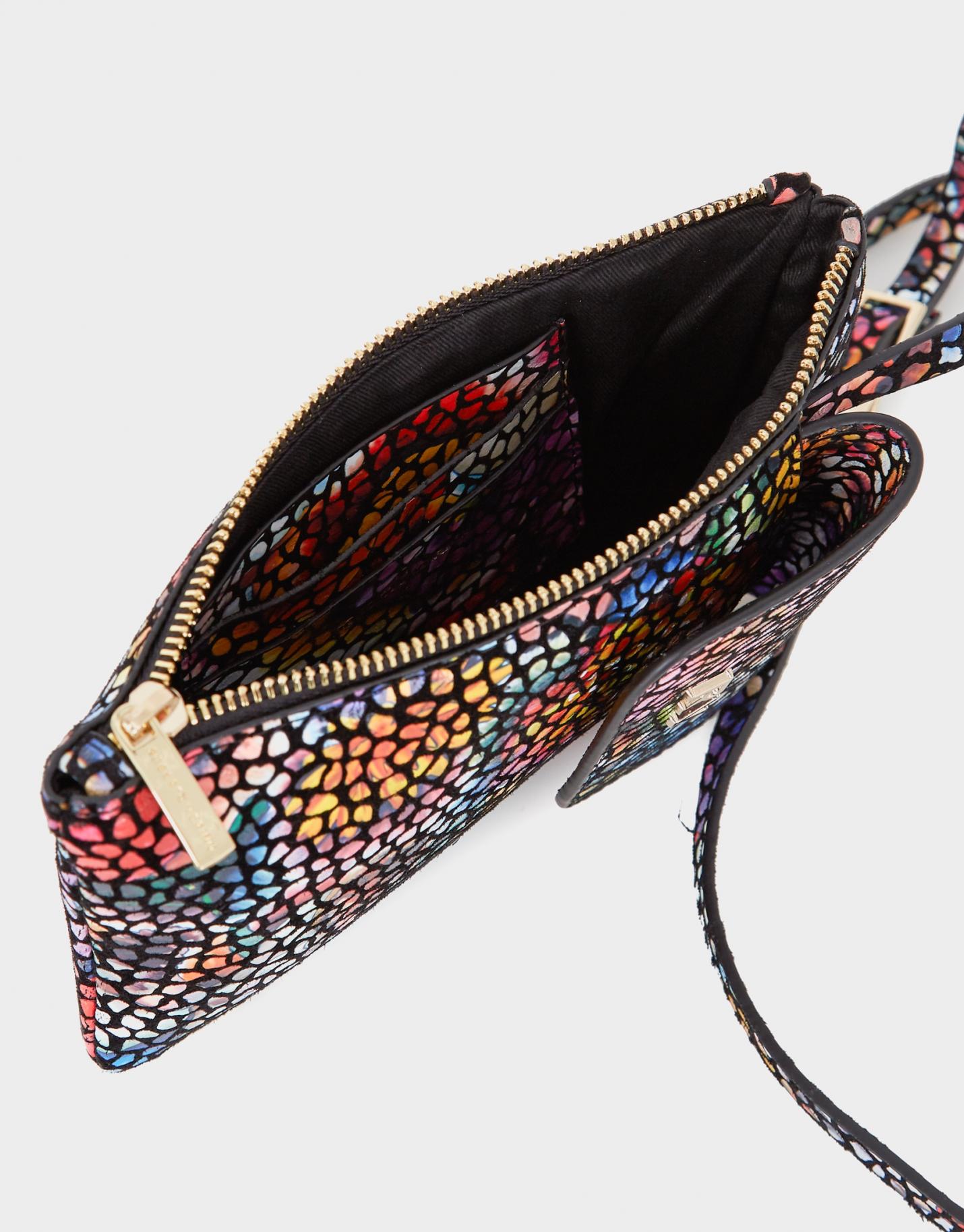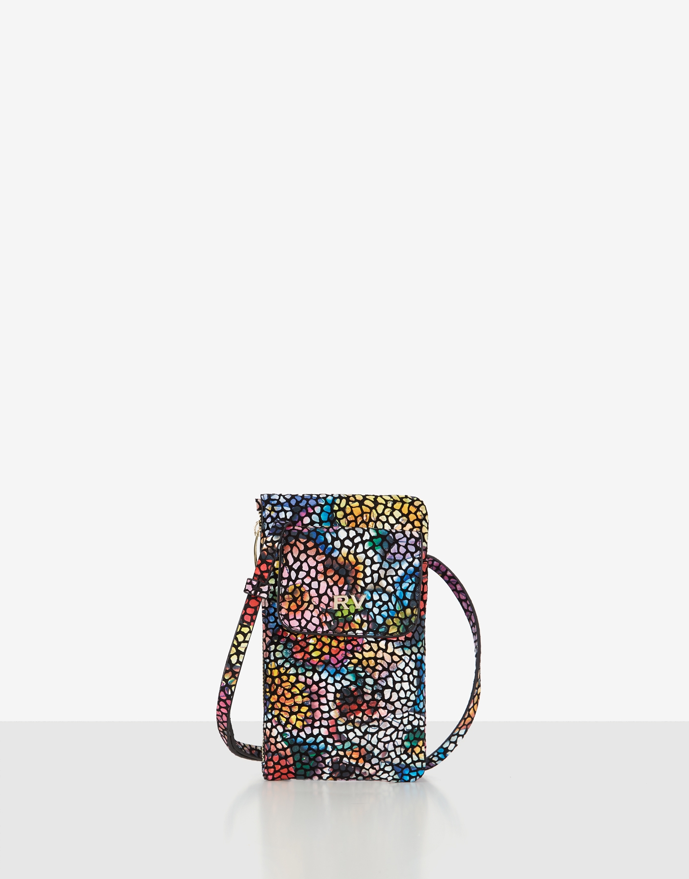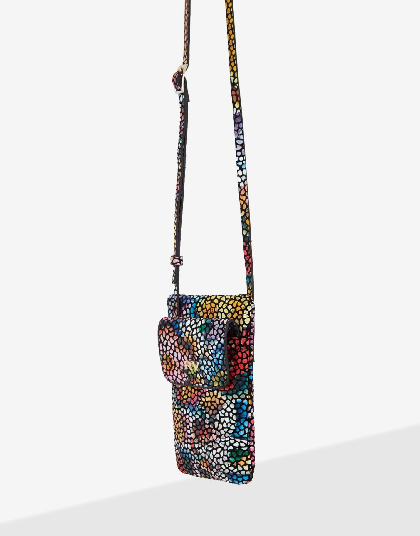Cartera portamóvil fabricada en piel con estampado floral multicolor. Compartimento exterior para móvil que cierra con tapeta e imán. Compartimento interior cerrado con cremallera y forrado con un bolsillo plano en piel para tarjetas. Logo metálico RV en la tapeta. Asa de hombro regulable de 118 cm. Medidas aproximadas: 12 x 20,5 cm