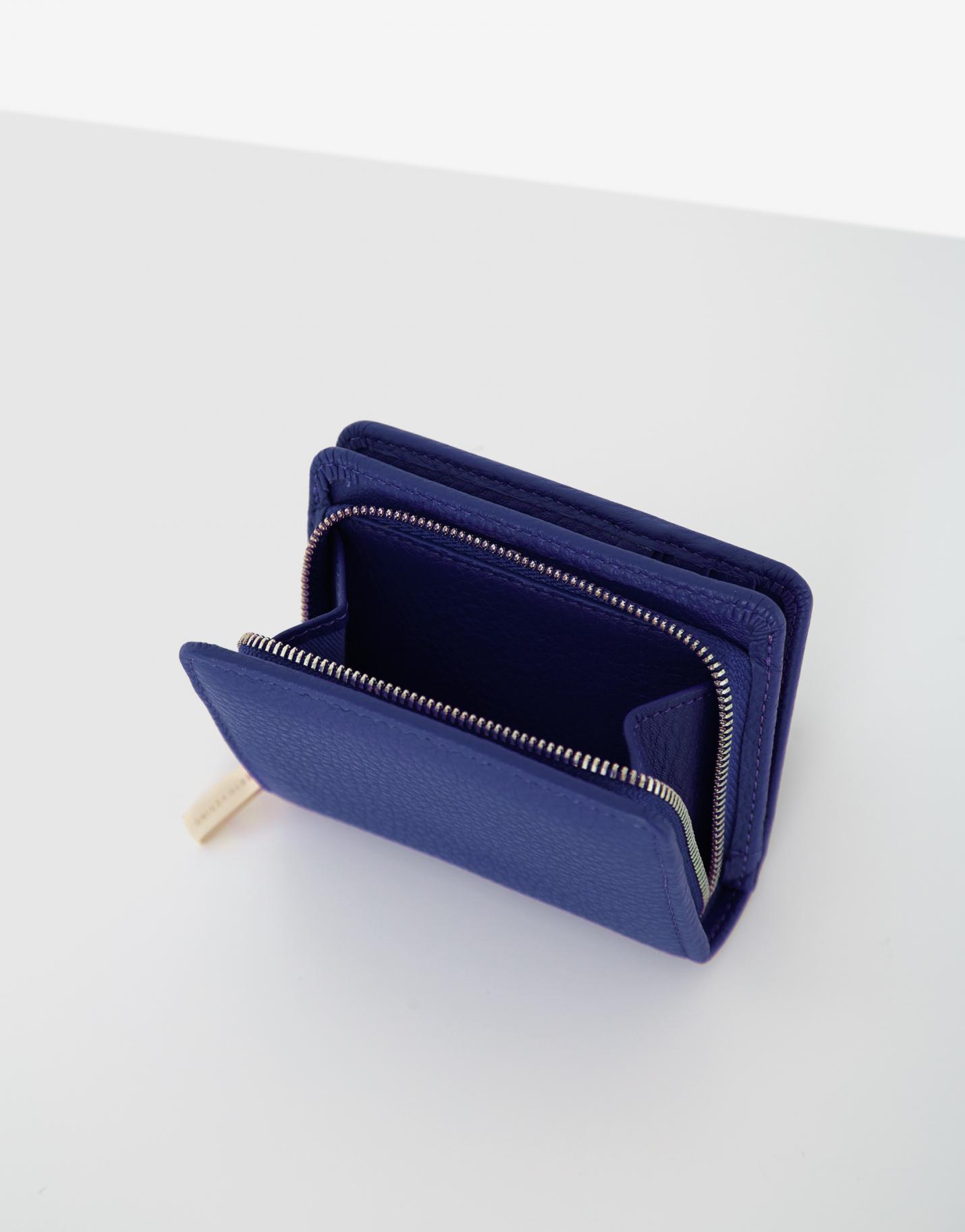 Cartera pequeña fabricada en piel granulada color azul con logo grabado en frontal. Dos cuerpos, uno con tapa compartimentada para tarjetas y cerrada con broche y otro para monedas cerrada con cremallera. Medidas: 8 x 10 x 3 cm