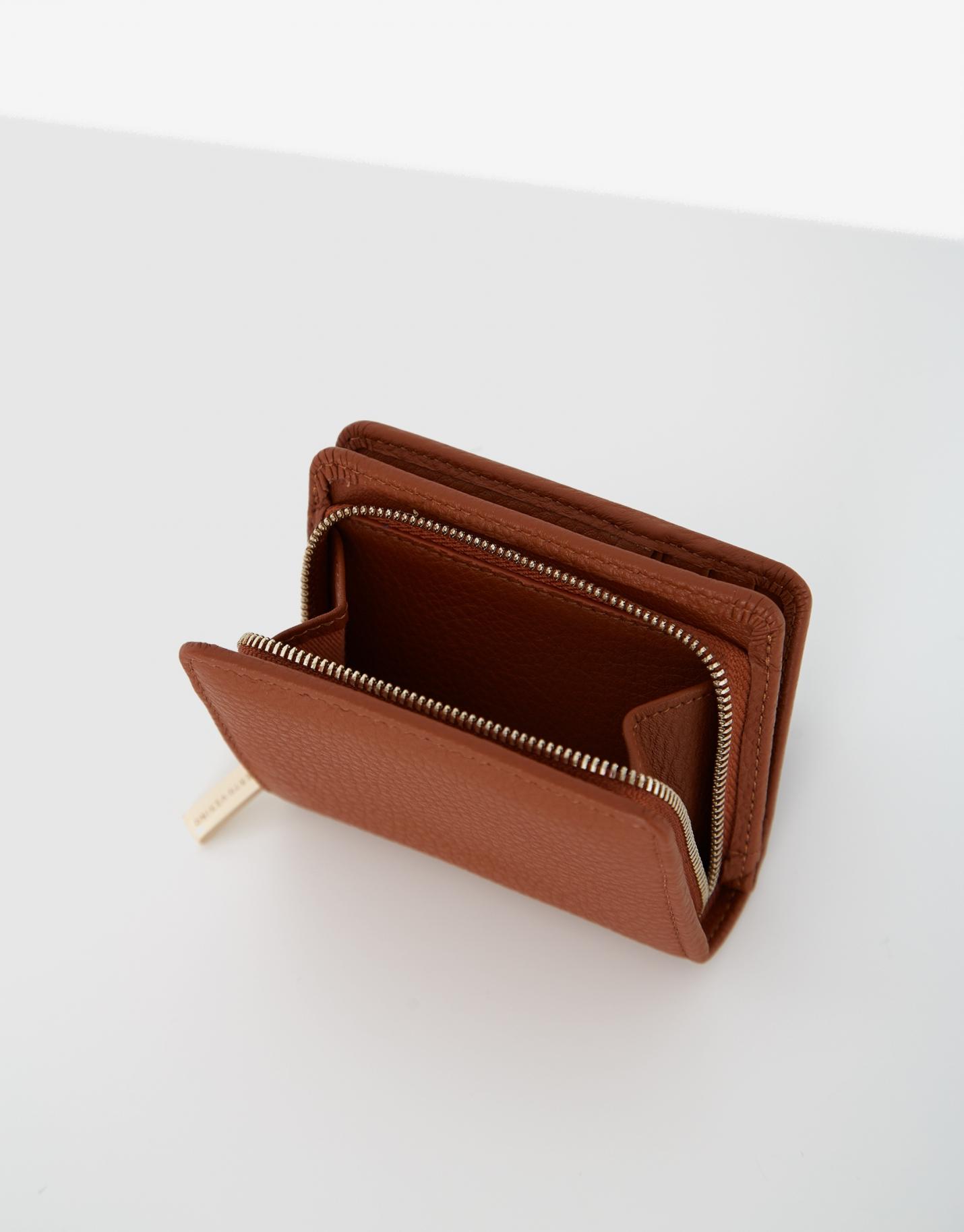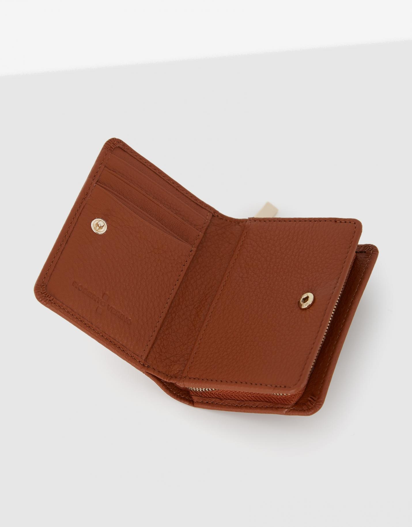 Cartera pequeña fabricada en piel granulada color cuero con logo grabado en frontal. Dos cuerpos, uno con tapa compartimentada para tarjetas y cerrada con broche y otro para monedas cerrada con cremallera. Medidas: 8 x 10 x 3 cm
