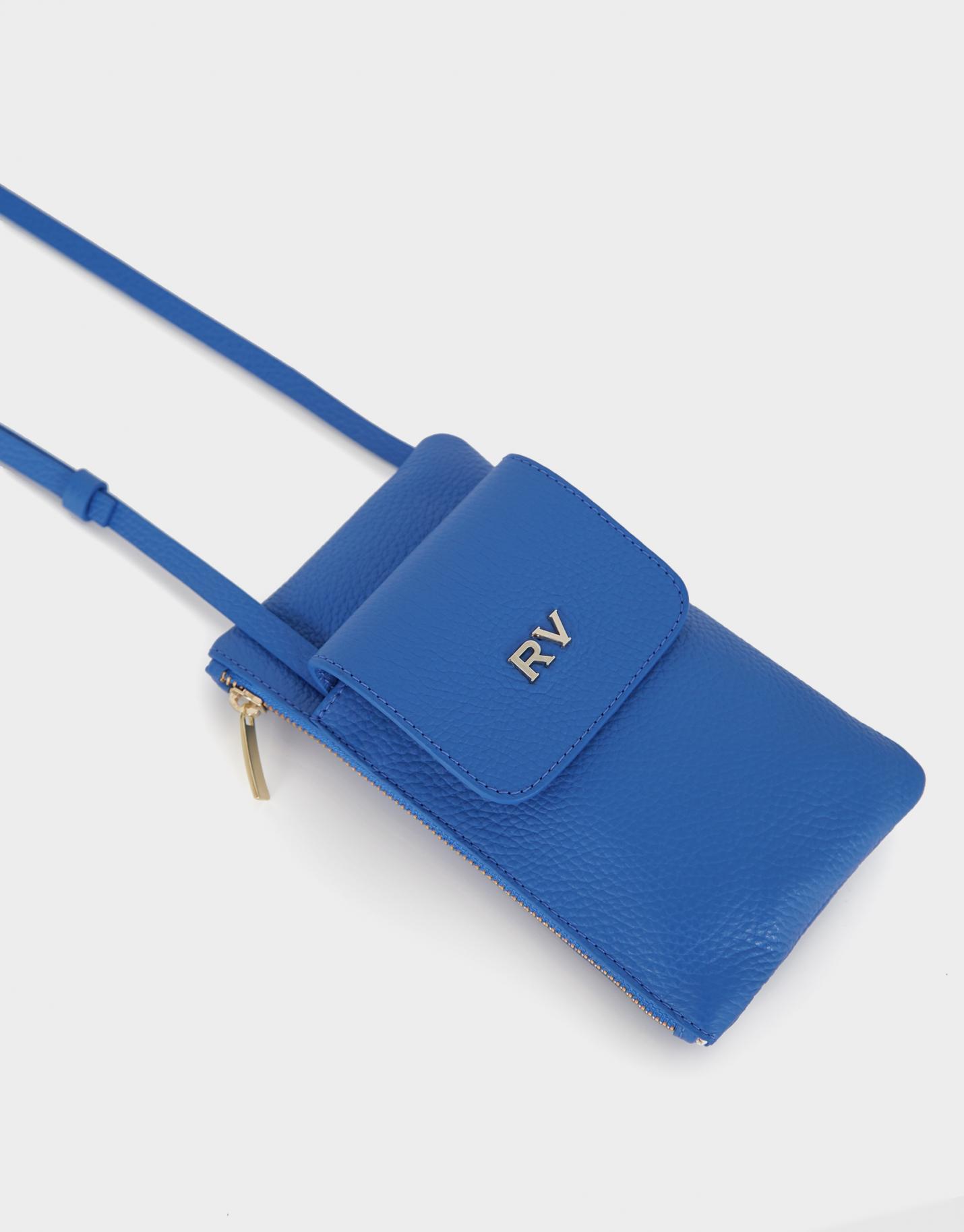 Cartera con asa fabricada en piel de acabado granulado color azul. Compartimento exterior para móvil cerrado con tapeta y dos compartimentos interiores cerrados con cremallera. Interior forrado y compartimentado y exterior personalizado con logo estampado en oro quiaro. Asa de hombro regulable de 118 cts. Medidas aproximadas: 12 x 20,5 cm