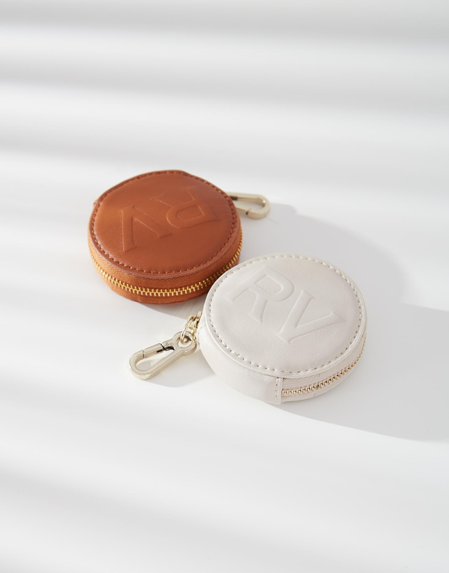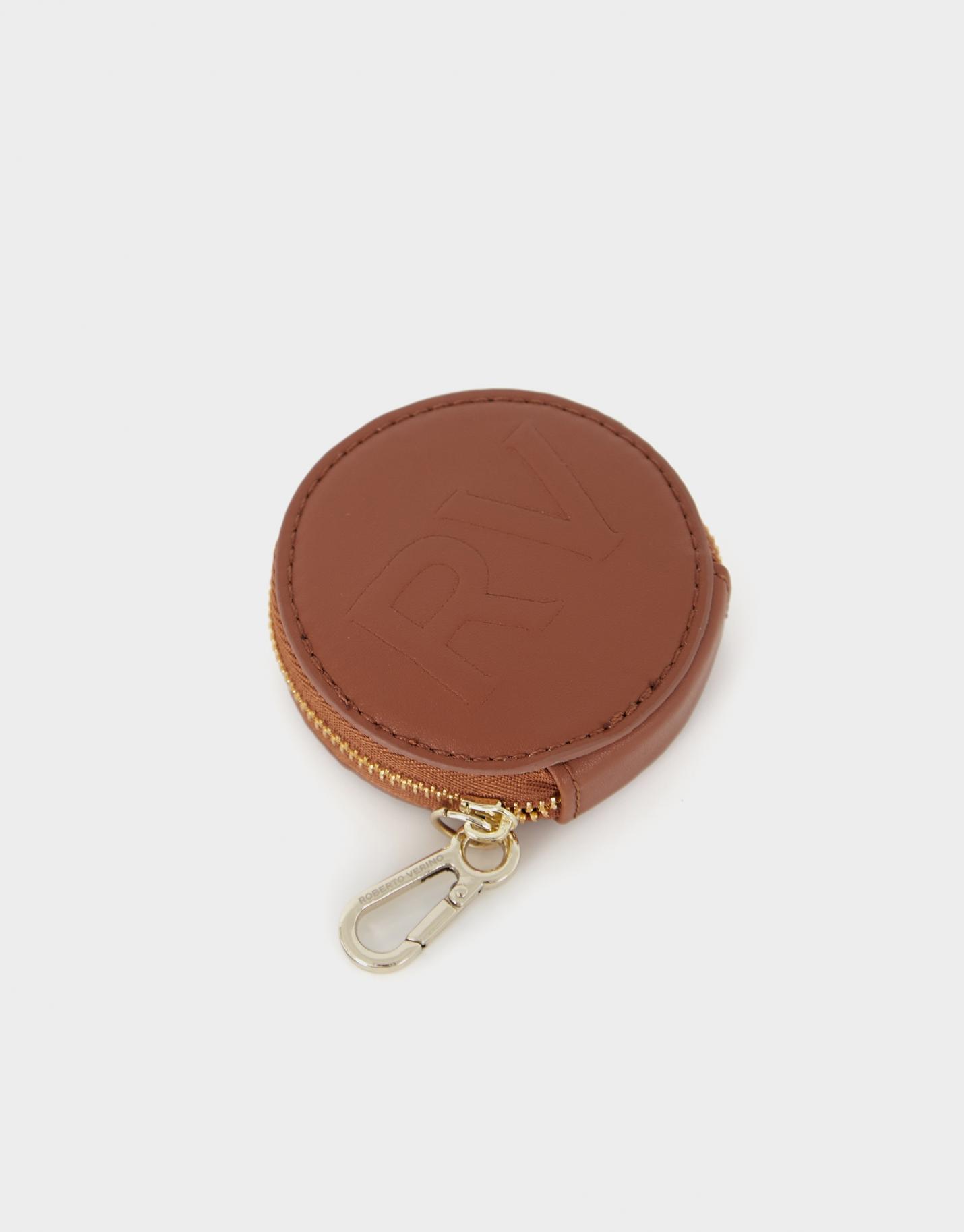 Estuche redondo multiusos como almacenamiento de cables o como monedero fabricado en piel color cuero con logo RV grabado en frontal. Cierre de cremallera con tirador. Medida aproximada diámetro: 7 cm.