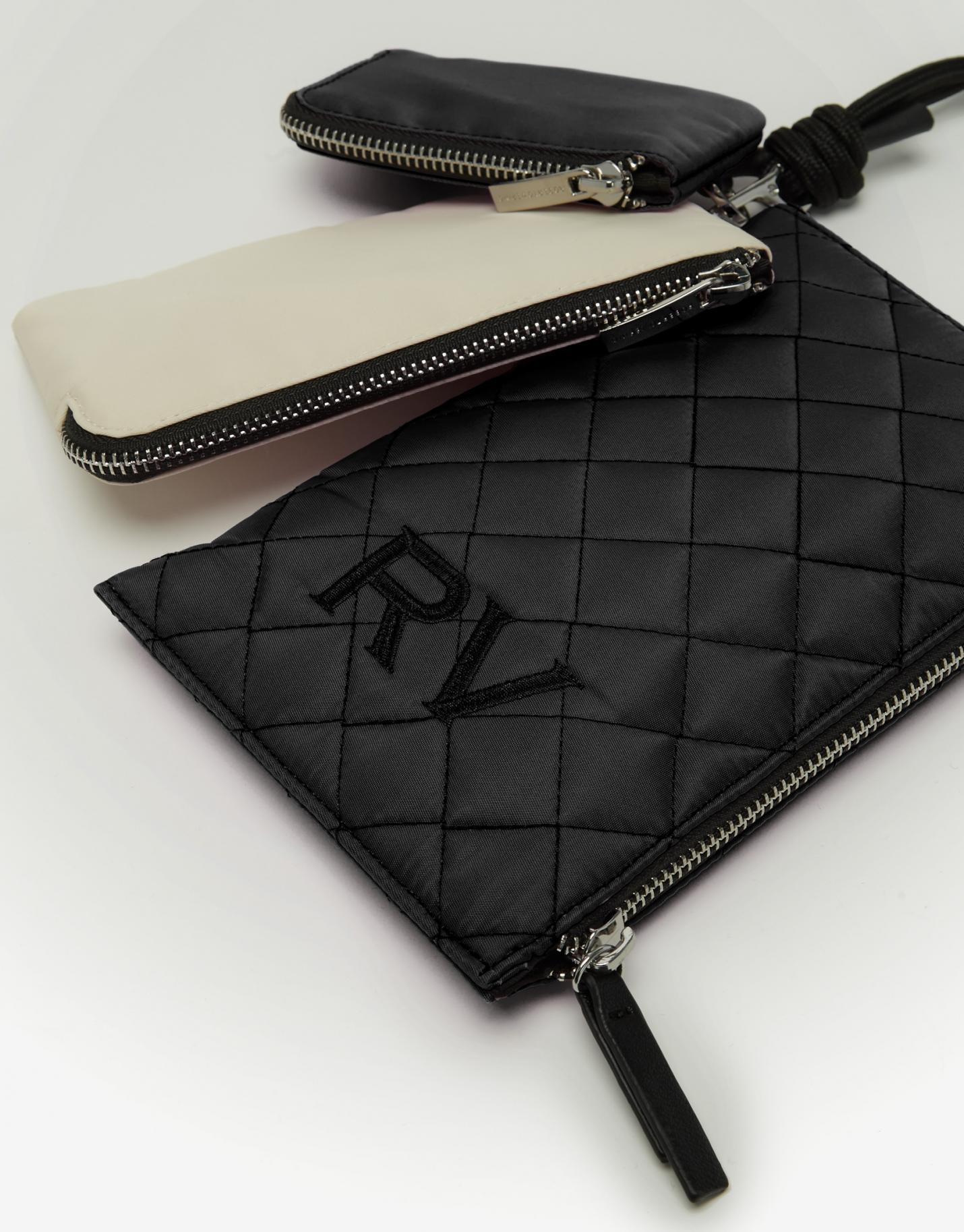 Set de piezas fabricado en nailon acolchado y sujetos con un mosquetón con cordón para colgar. El set está compuesto por un estuche maxi en negro con logo bordado e interior con bolsillo plano apto para guardar documentos de viaje o un libro electrónico de 21 x 13,5 cm; un estuche plano midi en beige de 17,5 x 9,5 cm y un monedero pequeño en negro de 12 x 8 cm. Medidas del cordón: 112 cm