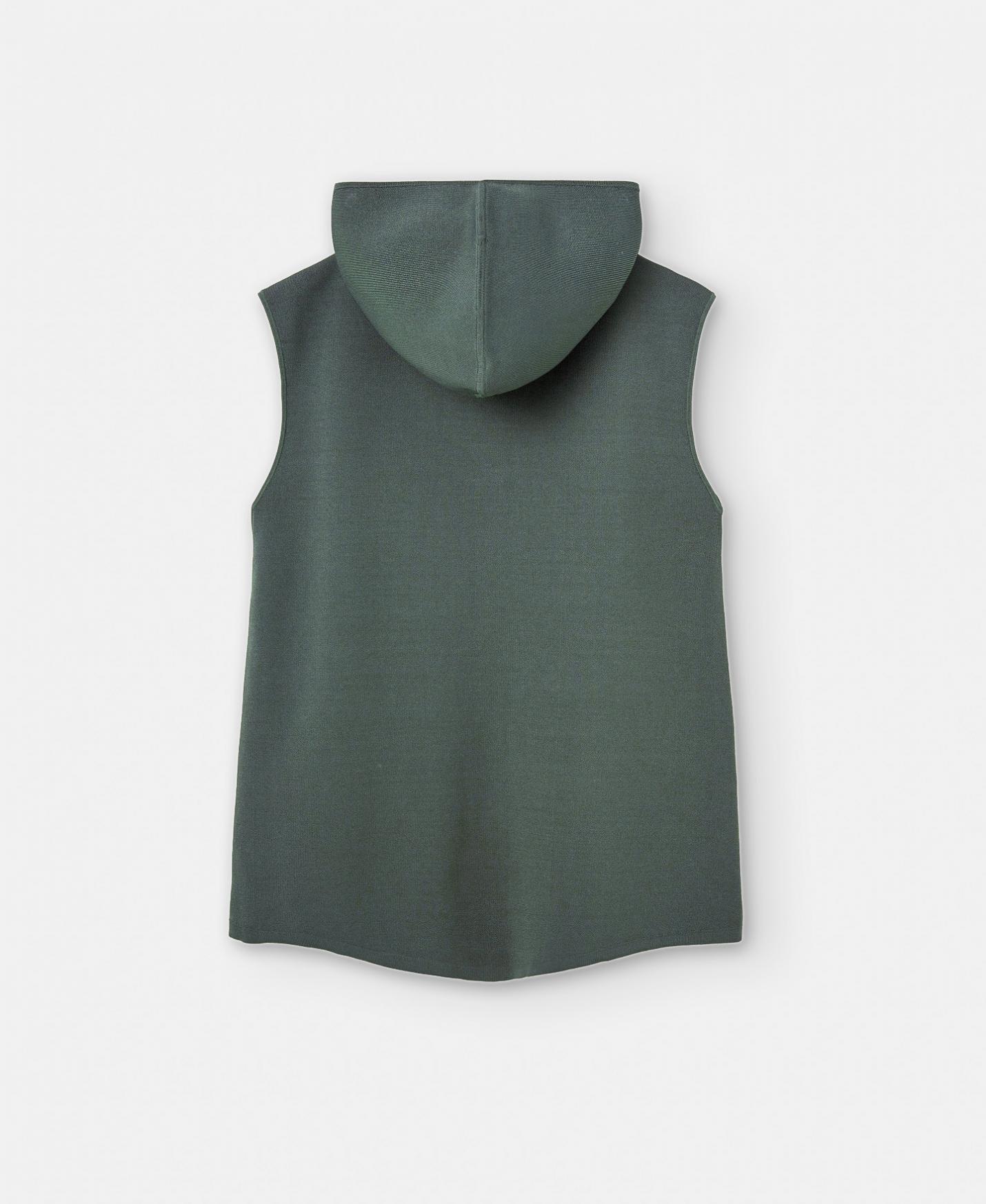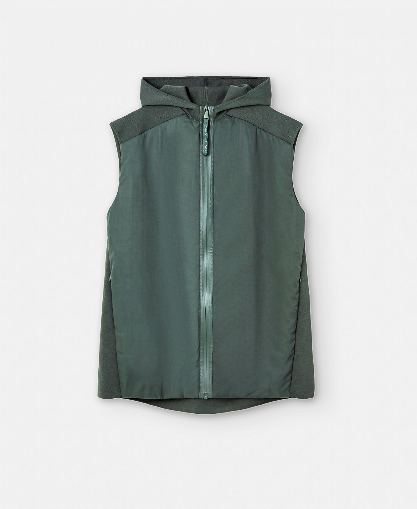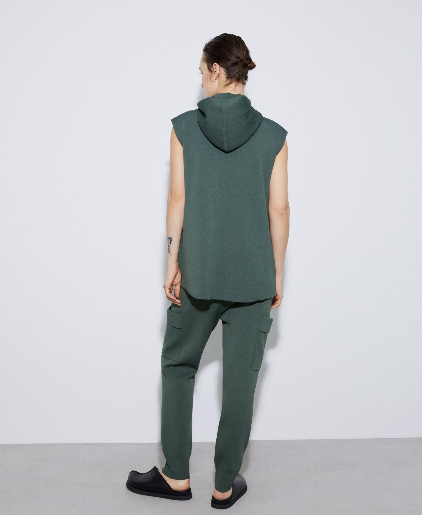 Chaleco en punto de viscosa y nylon responsable. Tiene capucha, cierre cremallera y elástico en bajo.