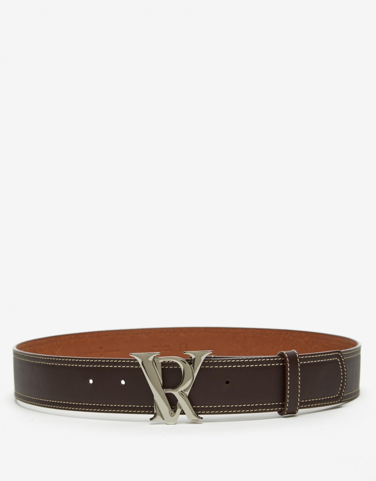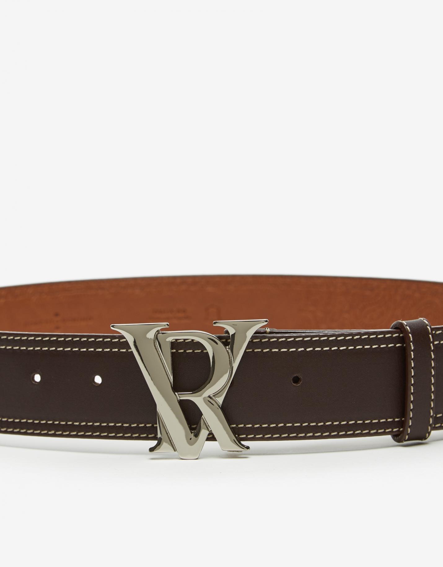 Cinturón ancho fabricado en piel color marrón con doble pespunte a contraste en crudo y hebilla personalizada RV en níquel. Ancho: 4 cm