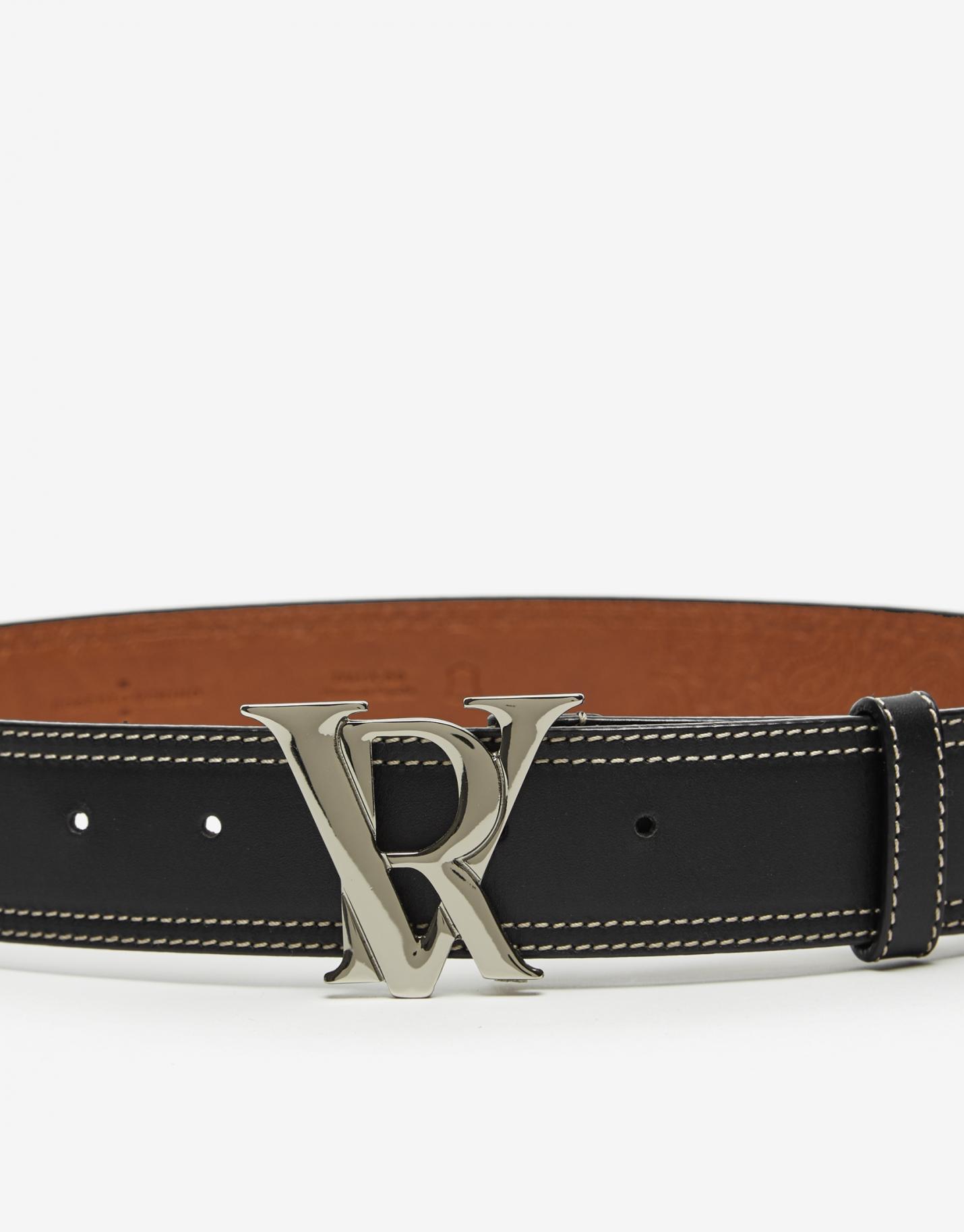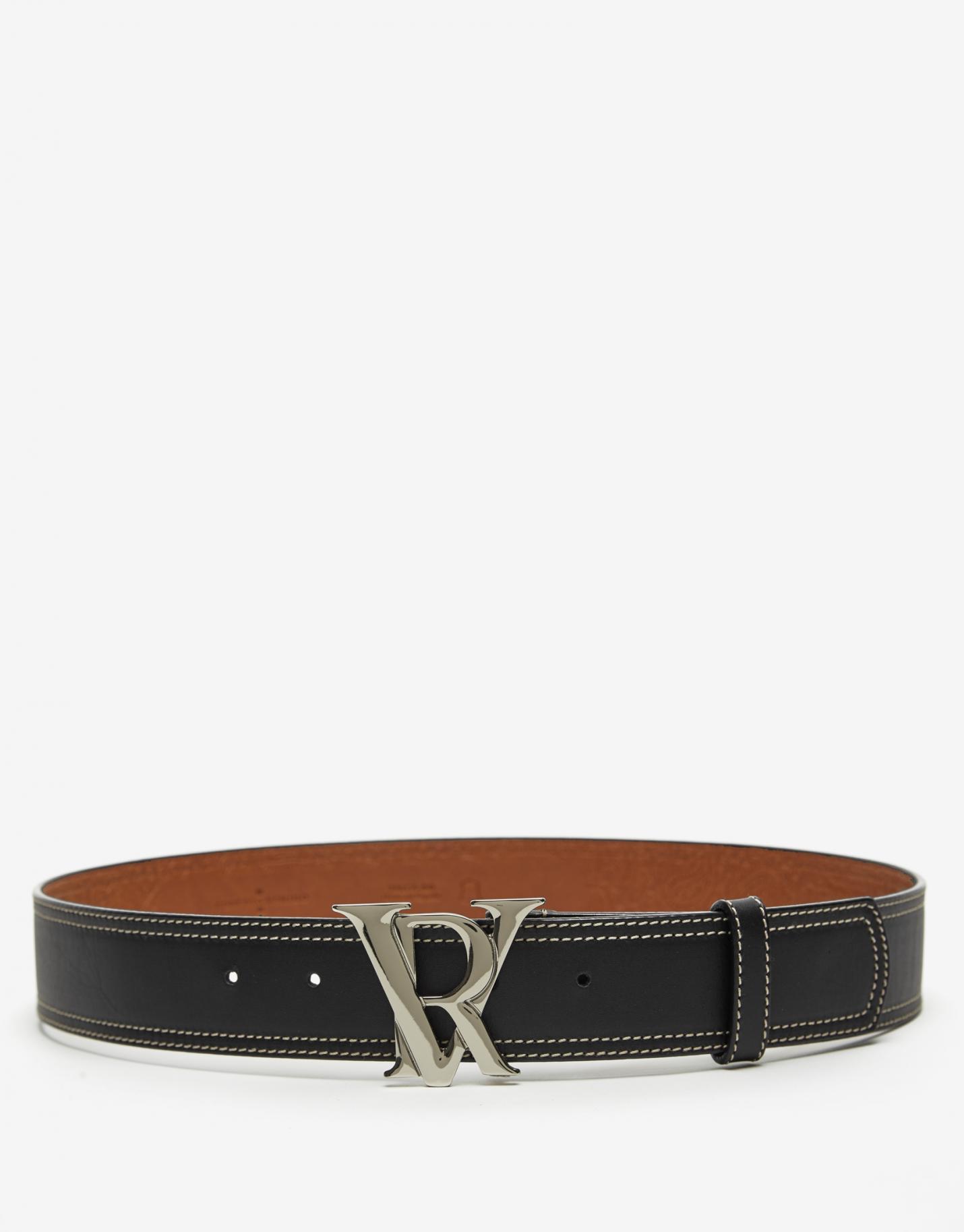 Cinturón ancho fabricado en piel color negro con doble pespunte a contraste en crudo y hebilla personalizada RV en níquel. Ancho: 4 cm