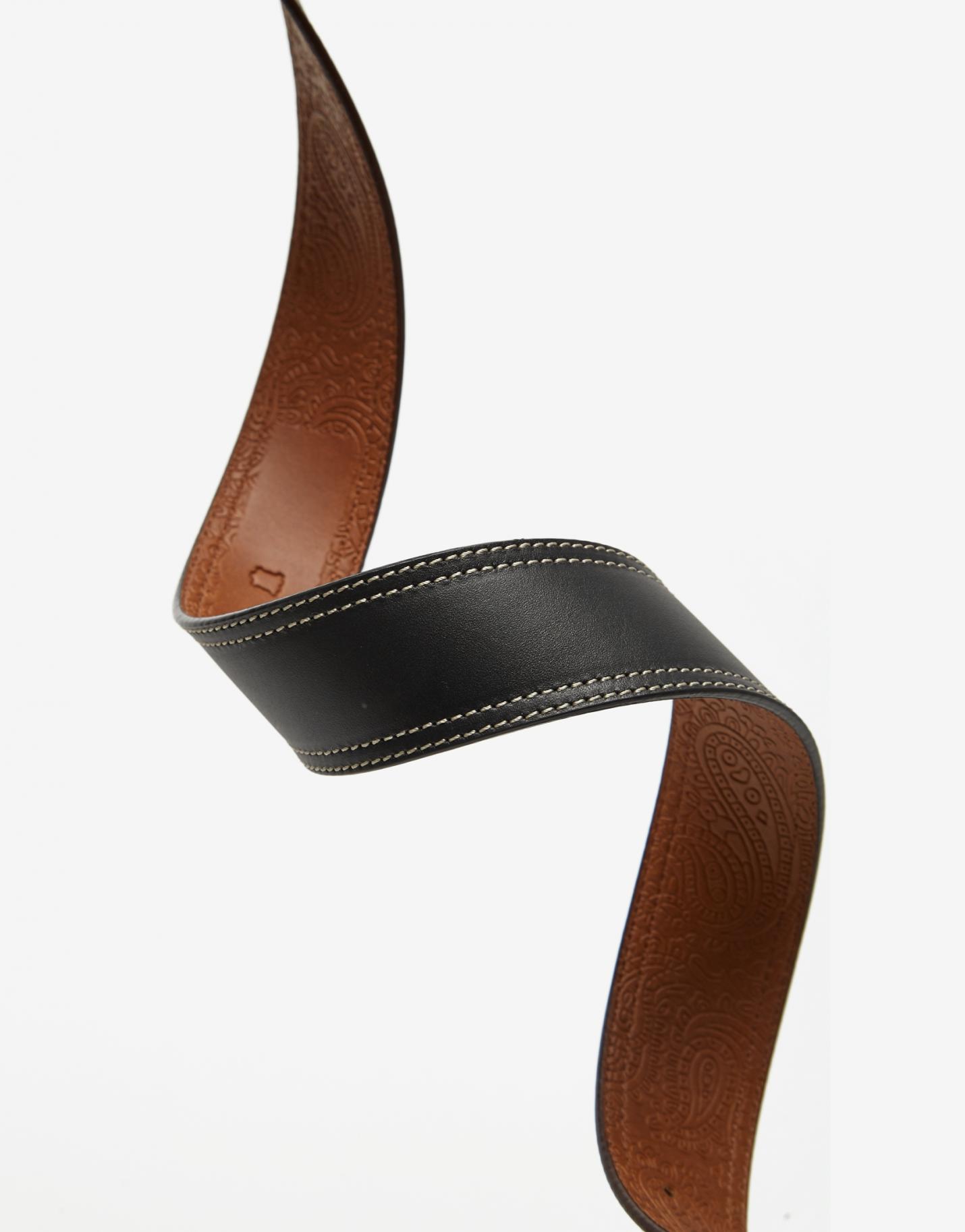 Cinturón ancho fabricado en piel color negro con doble pespunte a contraste en crudo y hebilla personalizada RV en níquel. Ancho: 4 cm …