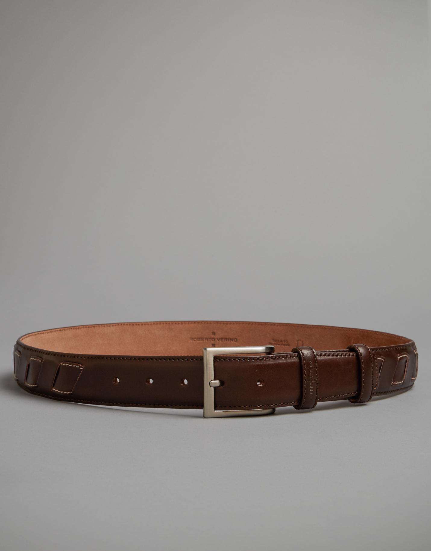 Cinturón fabricado en piel vacuna color marrón con trabajado entrelazado y pespunteado a contraste. Hebilla de zamac.