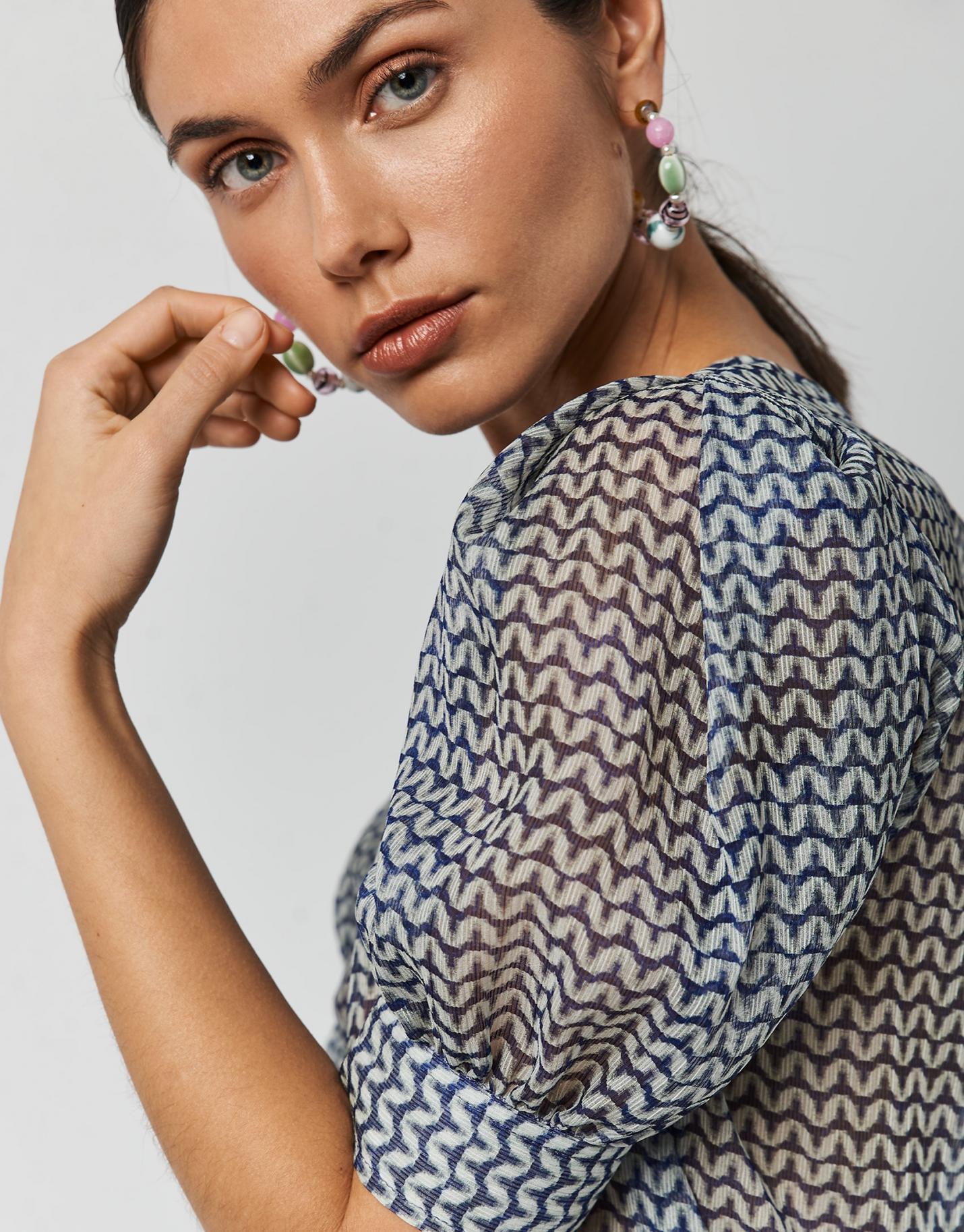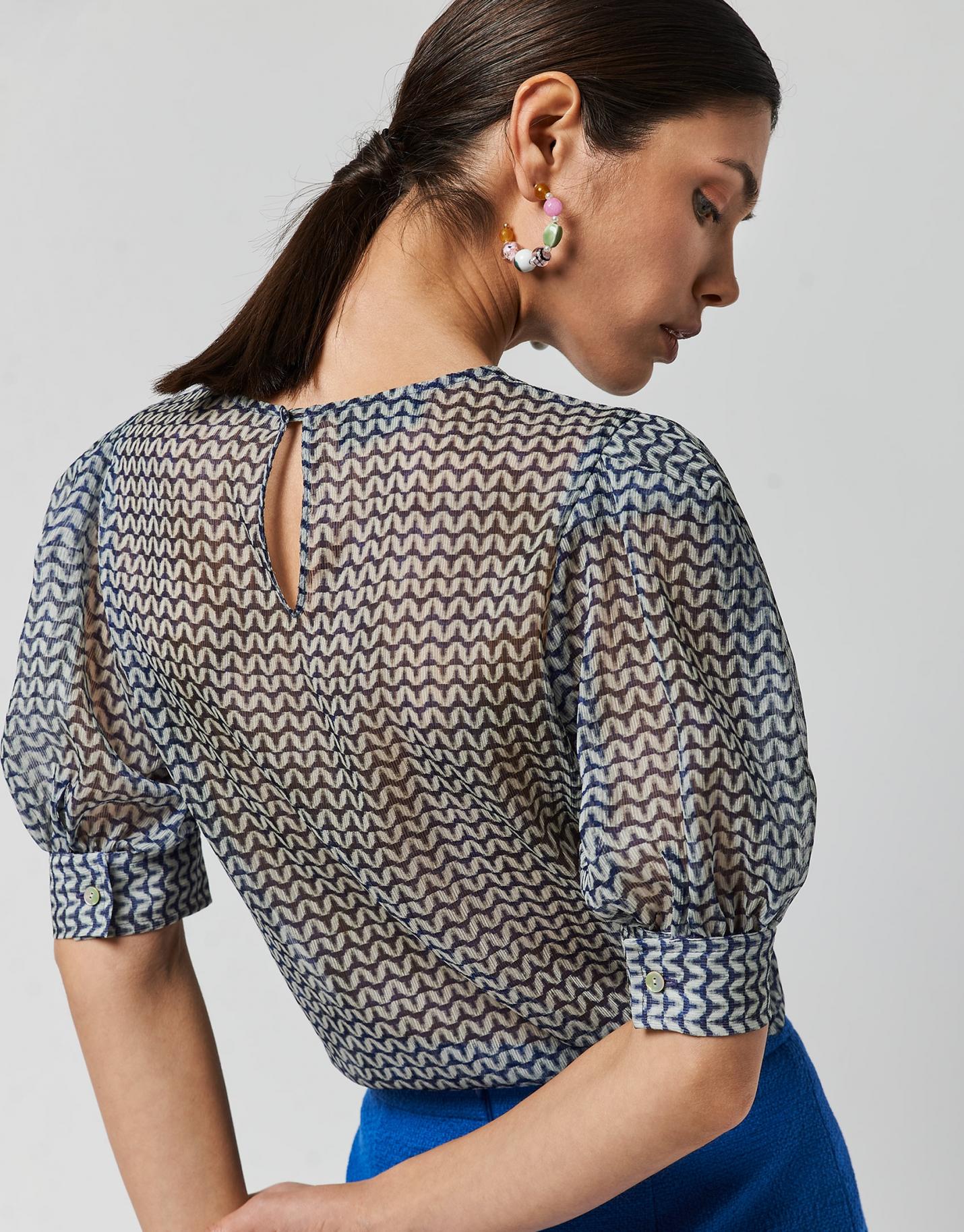 Blusa de manga corta en gasa estampada en tonos azules. Escote redondo con cierre de lágrima y botón en espalda. Manga abullonada con puño y botón.