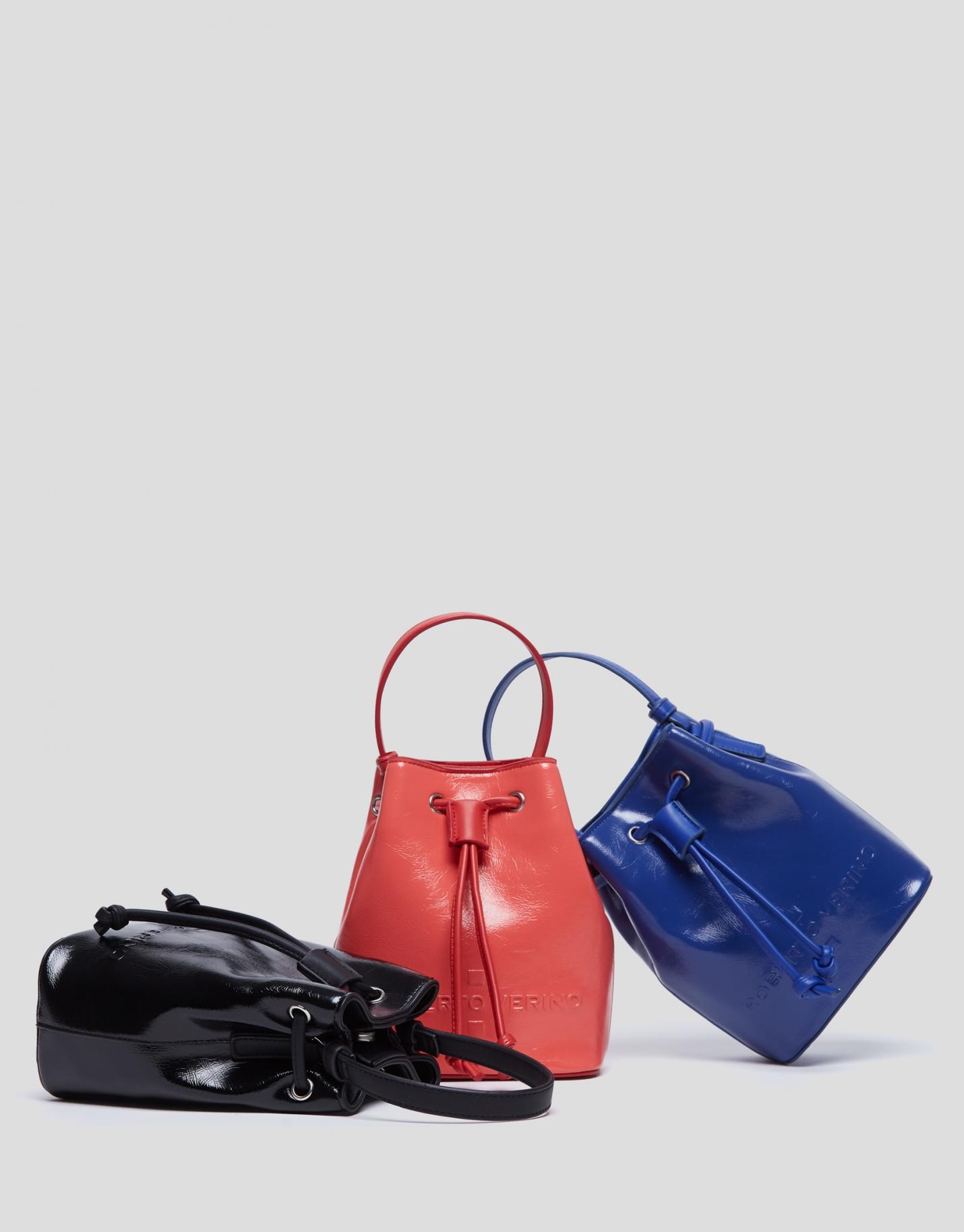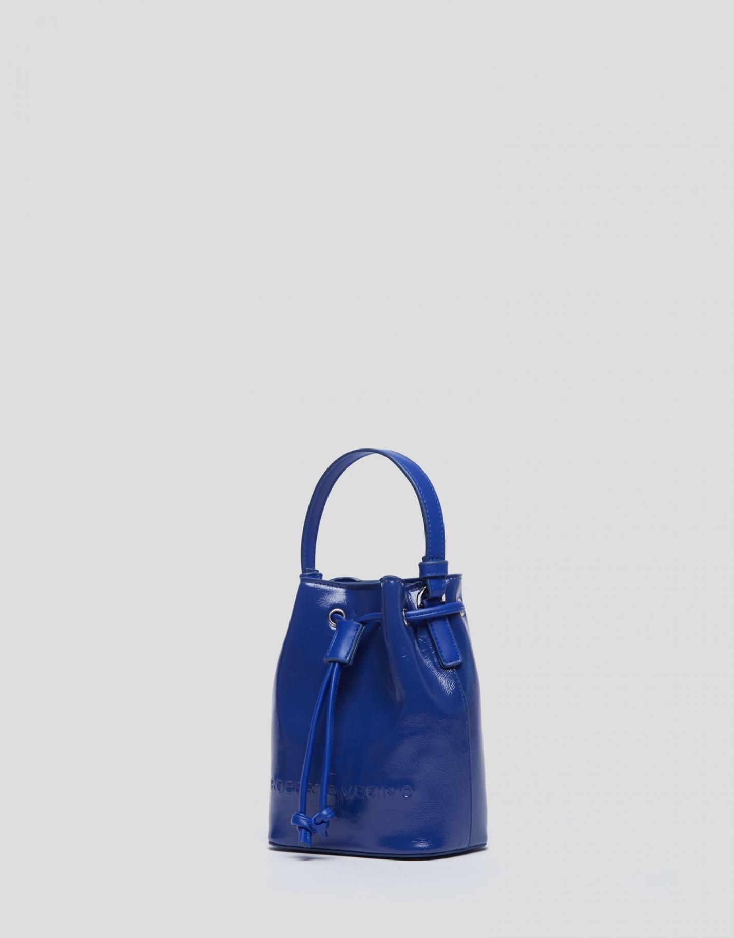 Bolso bombonera mini fabricado en material de acabado acharolado color azul con maxilogo grabado en el panel frontal. Asa…