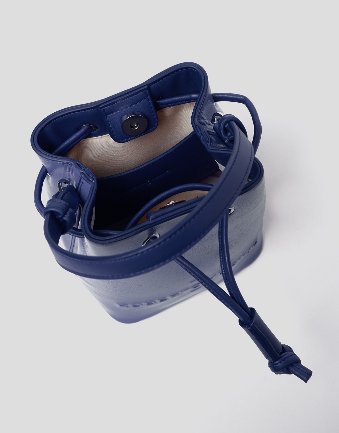 Bolso bombonera mini fabricado en material de acabado acharolado color azul con maxilogo grabado en el panel frontal. Asa de mano y asa bandolera regulable de 116 a 124 cm. Acabados metálicos en plateado. Cierre con broche de imán y cordón ajustable. Interior forrado y compartimentado. Medidas aproximadas:15 x 19 x 9 cm