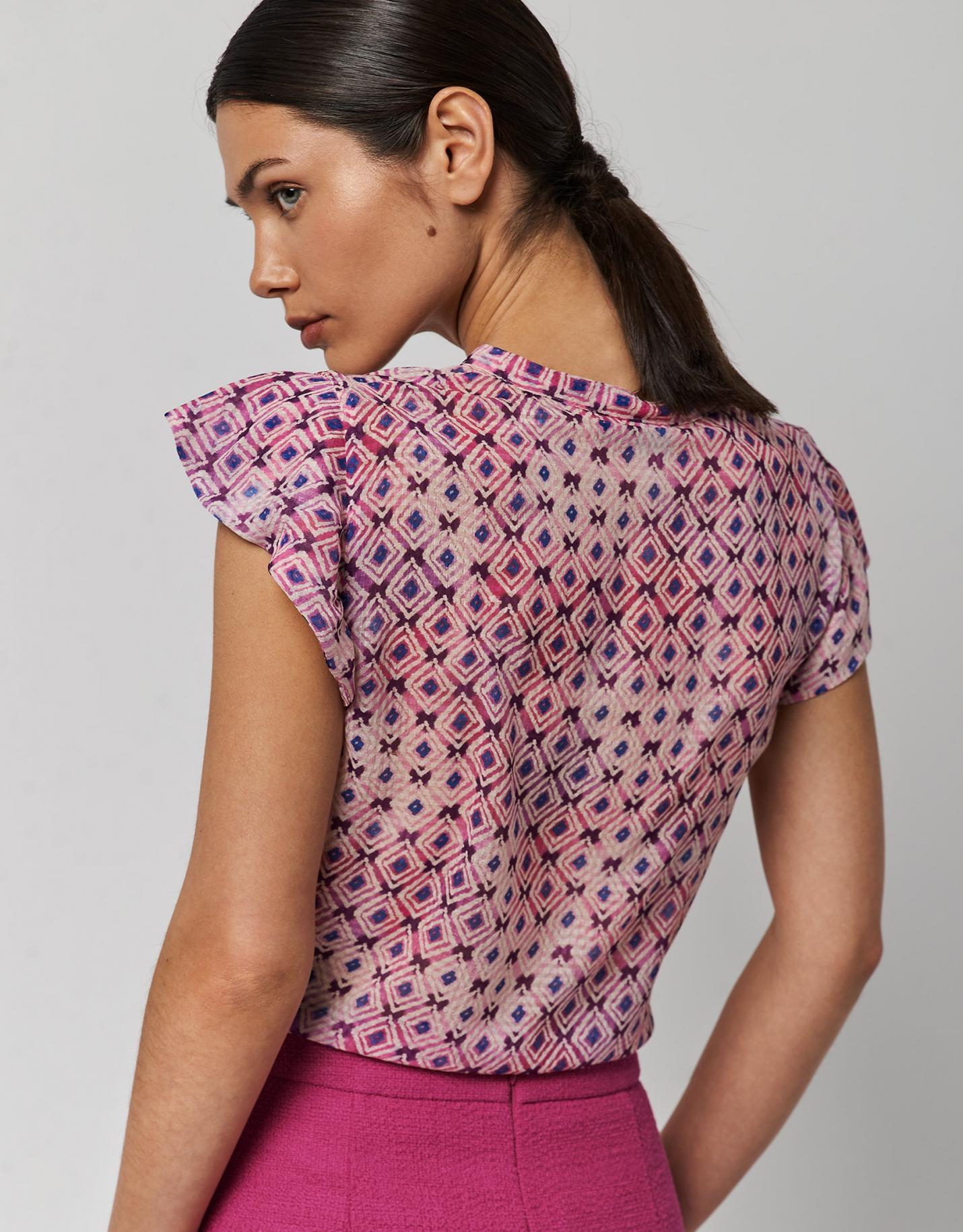 Top de manga corta con un ligero volante en gasa con estampado geométrico en rosa, crudo y azul. Escote redondo con abertura y cierre con lazada y bajo con pequeñas aberturas laterales.