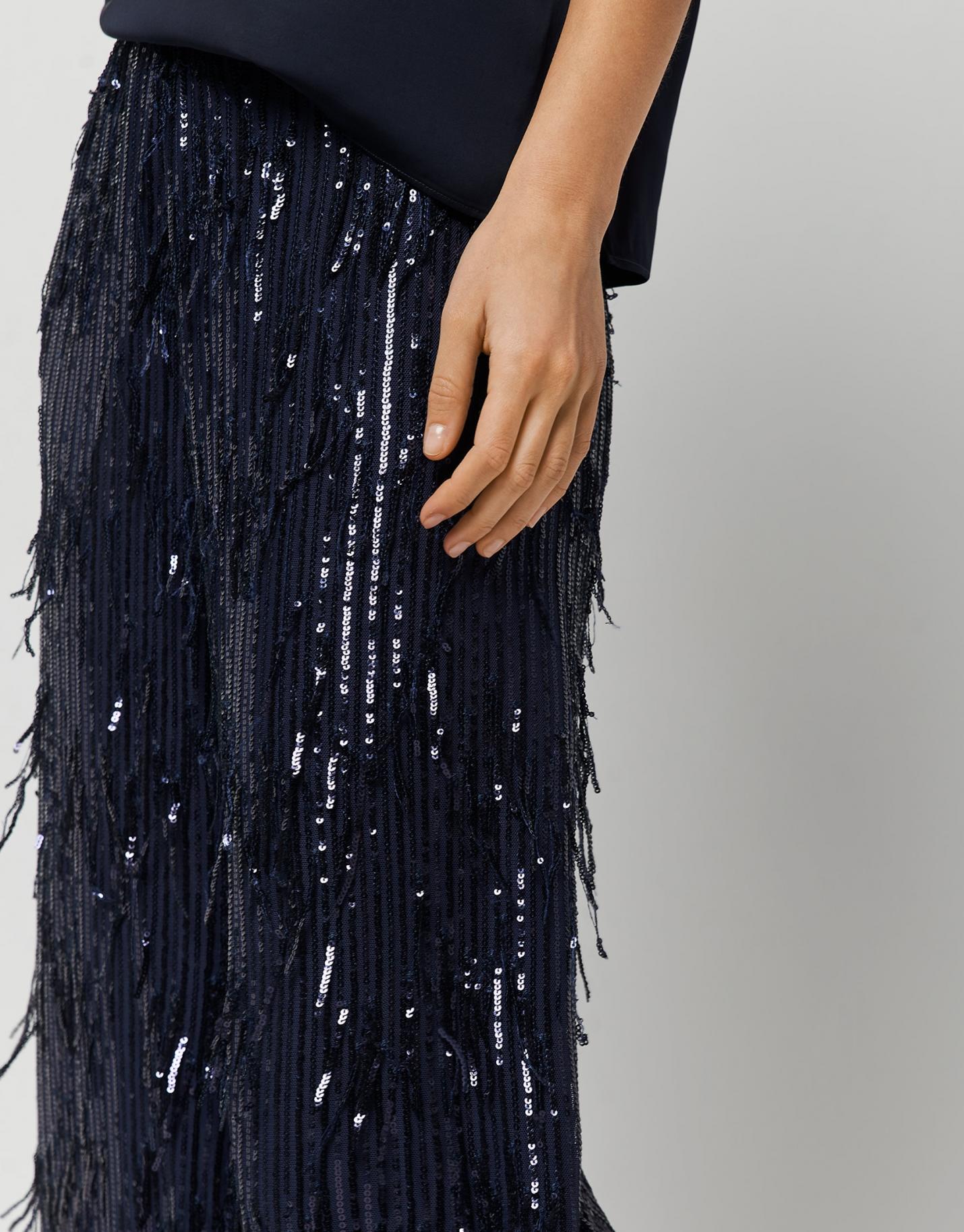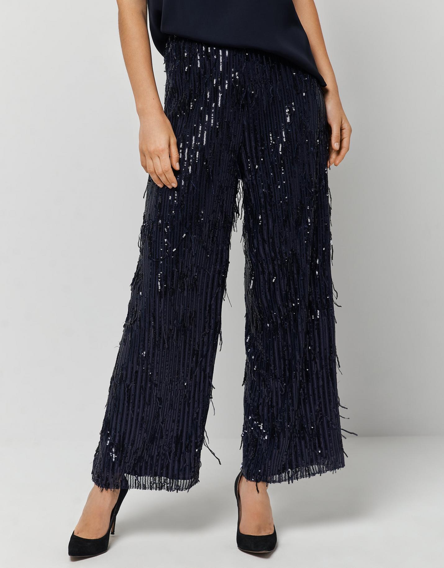 Pantalón palazzo en un tul elástico azul noche con cintas de lentejuelas colgando y forro a tono. Cierre con cremallera en lateral.
