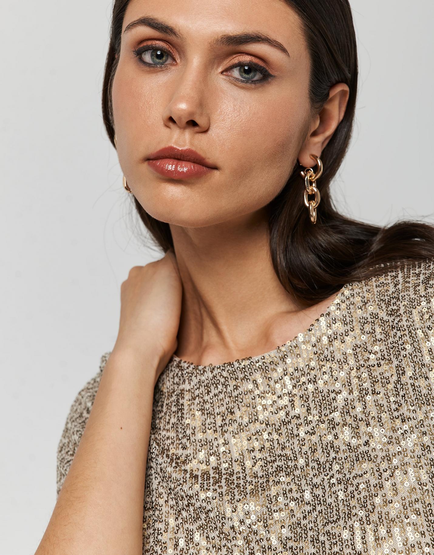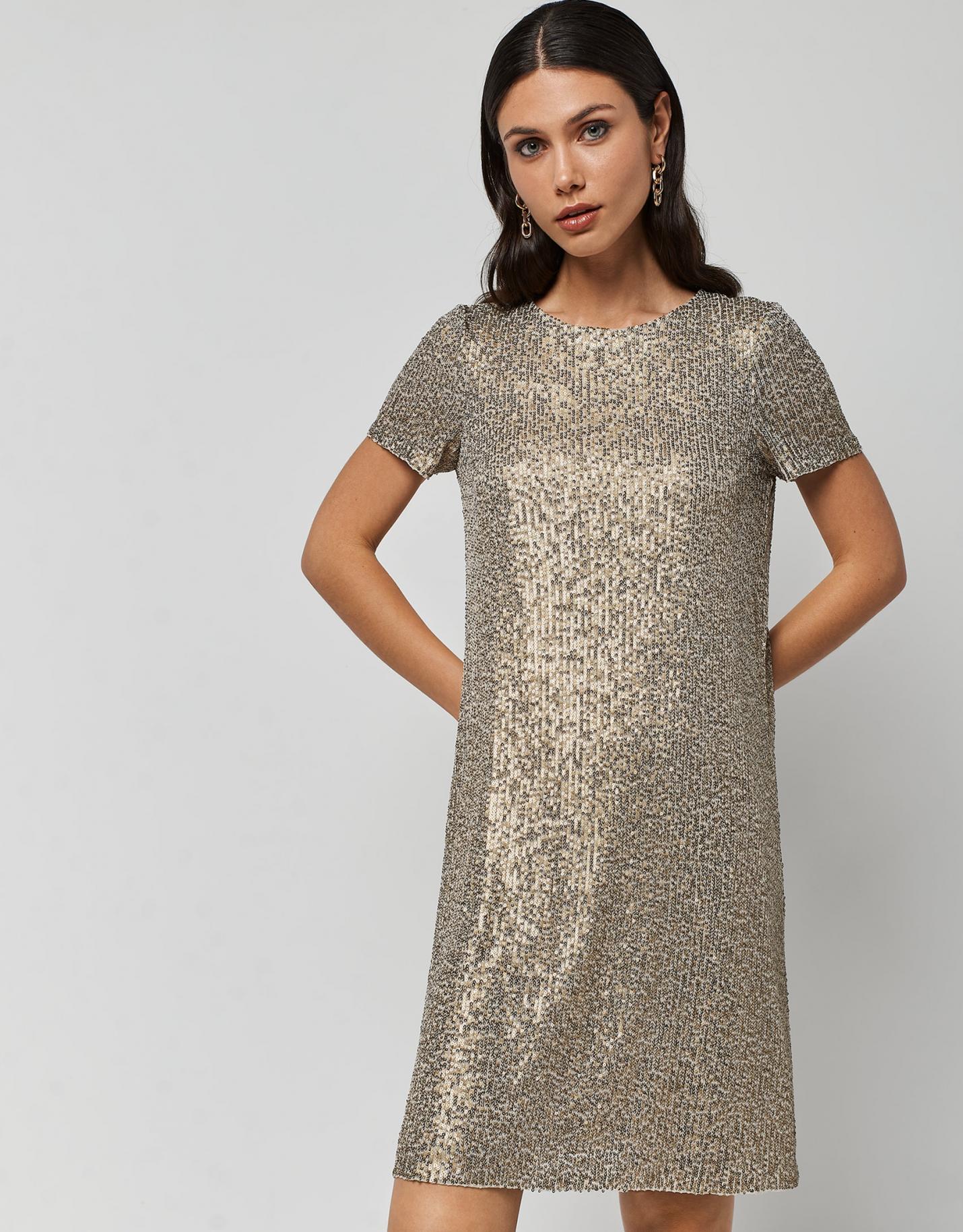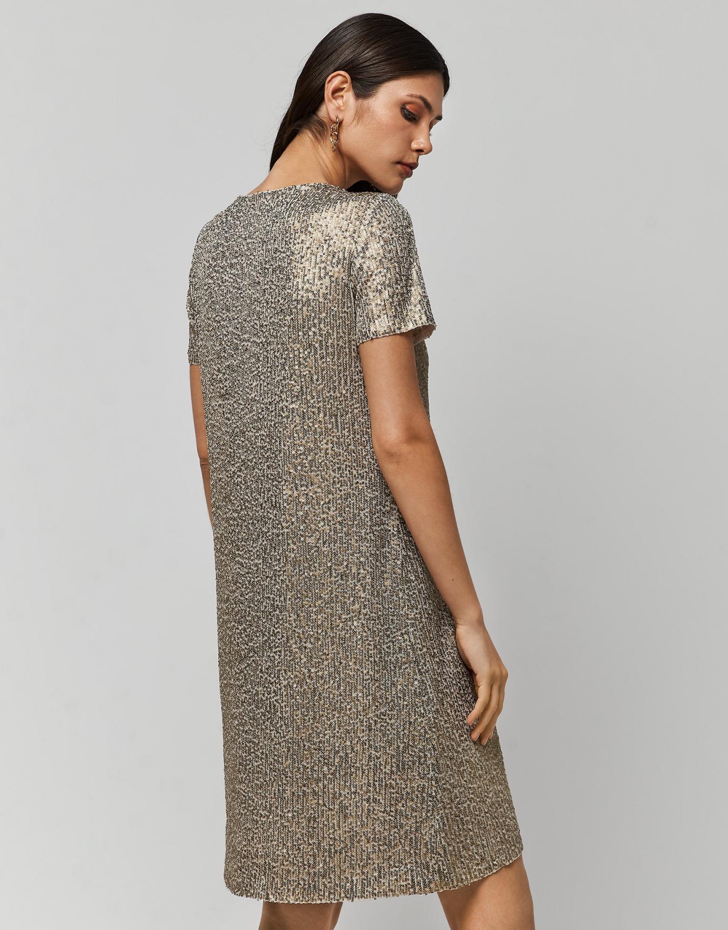 Vestido de manga corta en lentejuelas doradas con forro a tono. Corte recto y escote redondo.