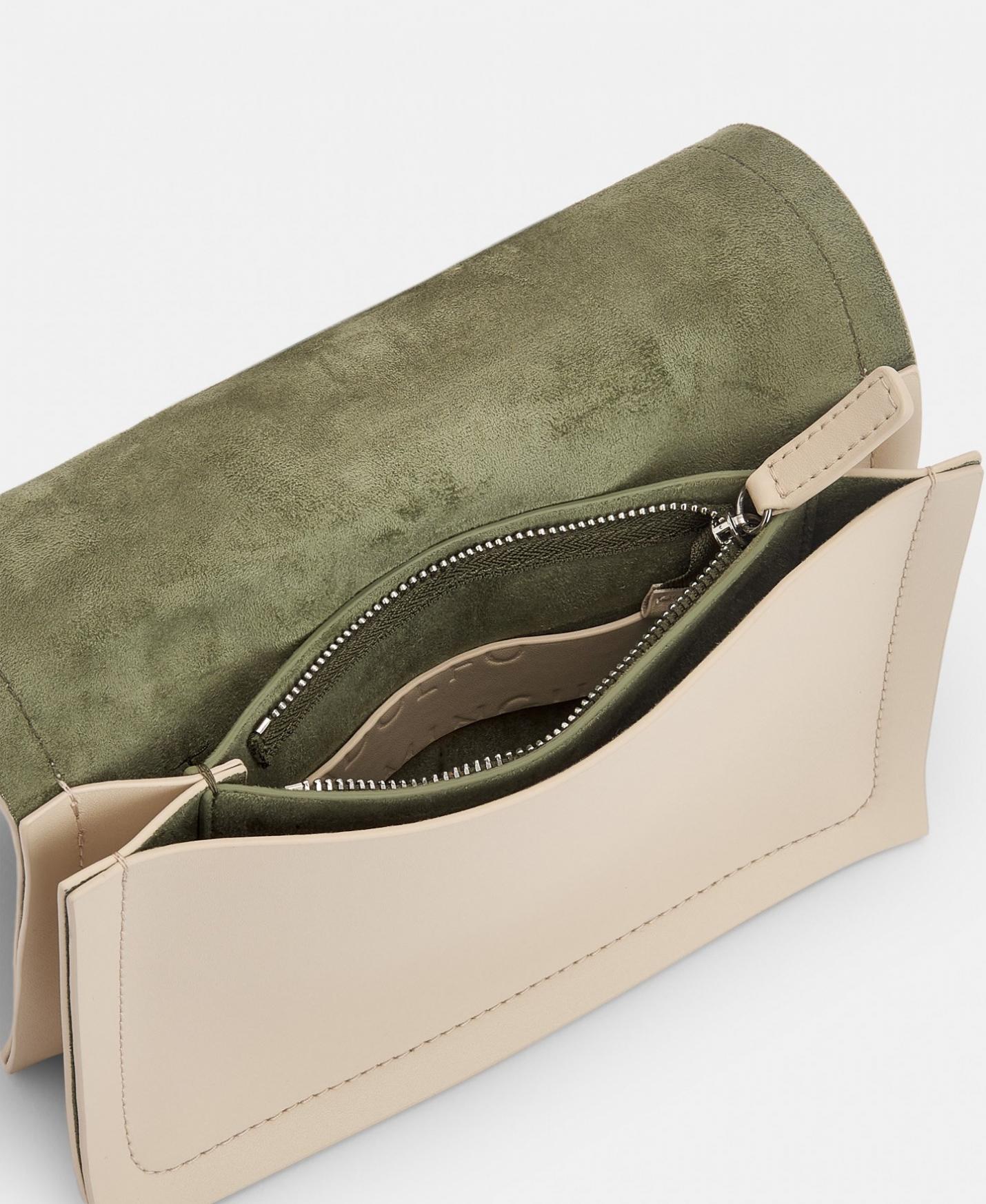 Bandolera en piel responsable con cierre solapa y pespuntes con fuelles a color. En su interior, serraje a contraste y dos compartimentos.