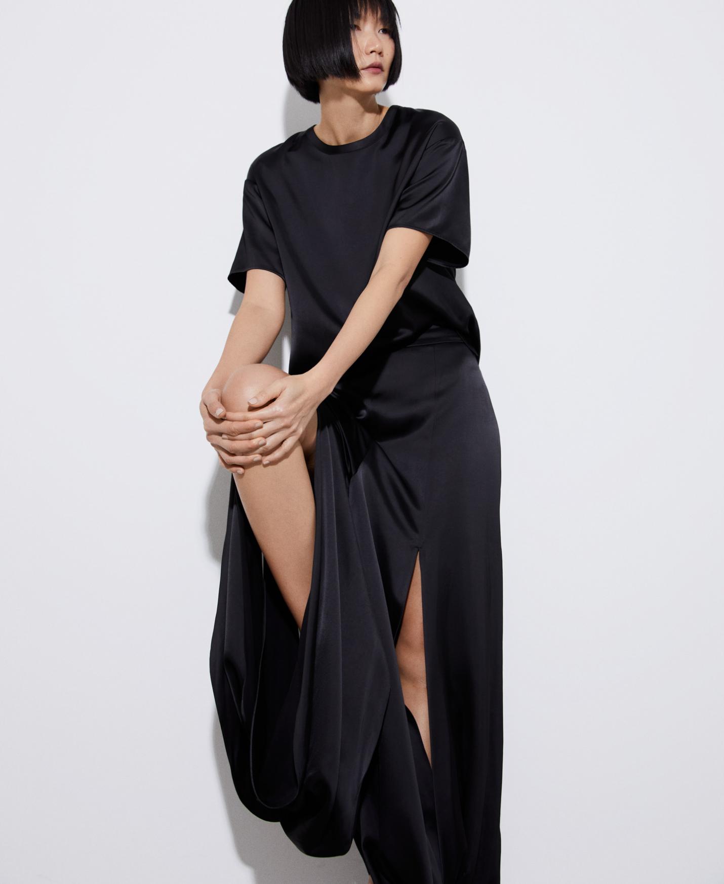 Pantalón fluido en viscosa. Corte irregular. Tiro alto y cinturilla ancha.