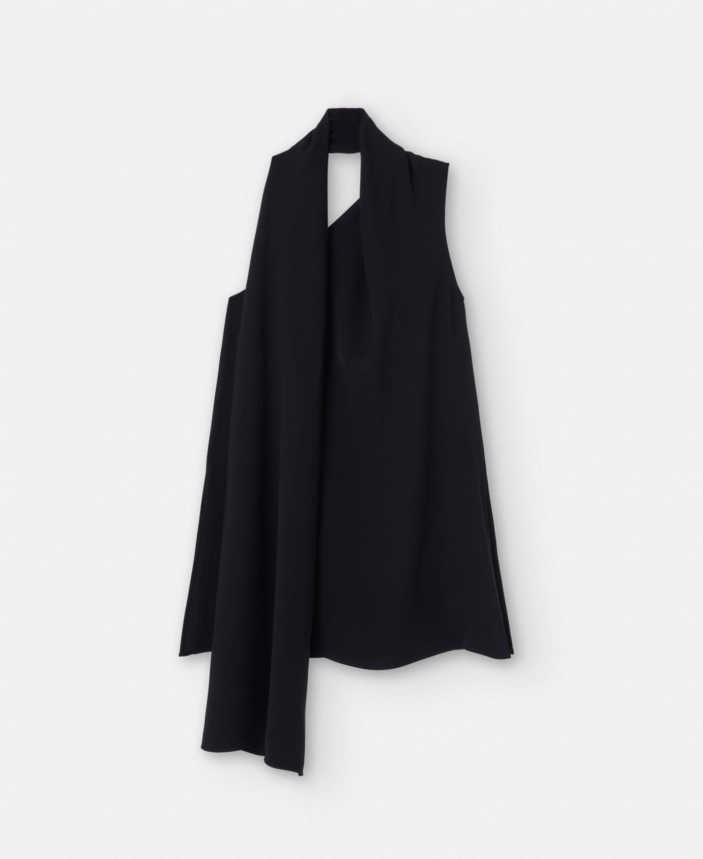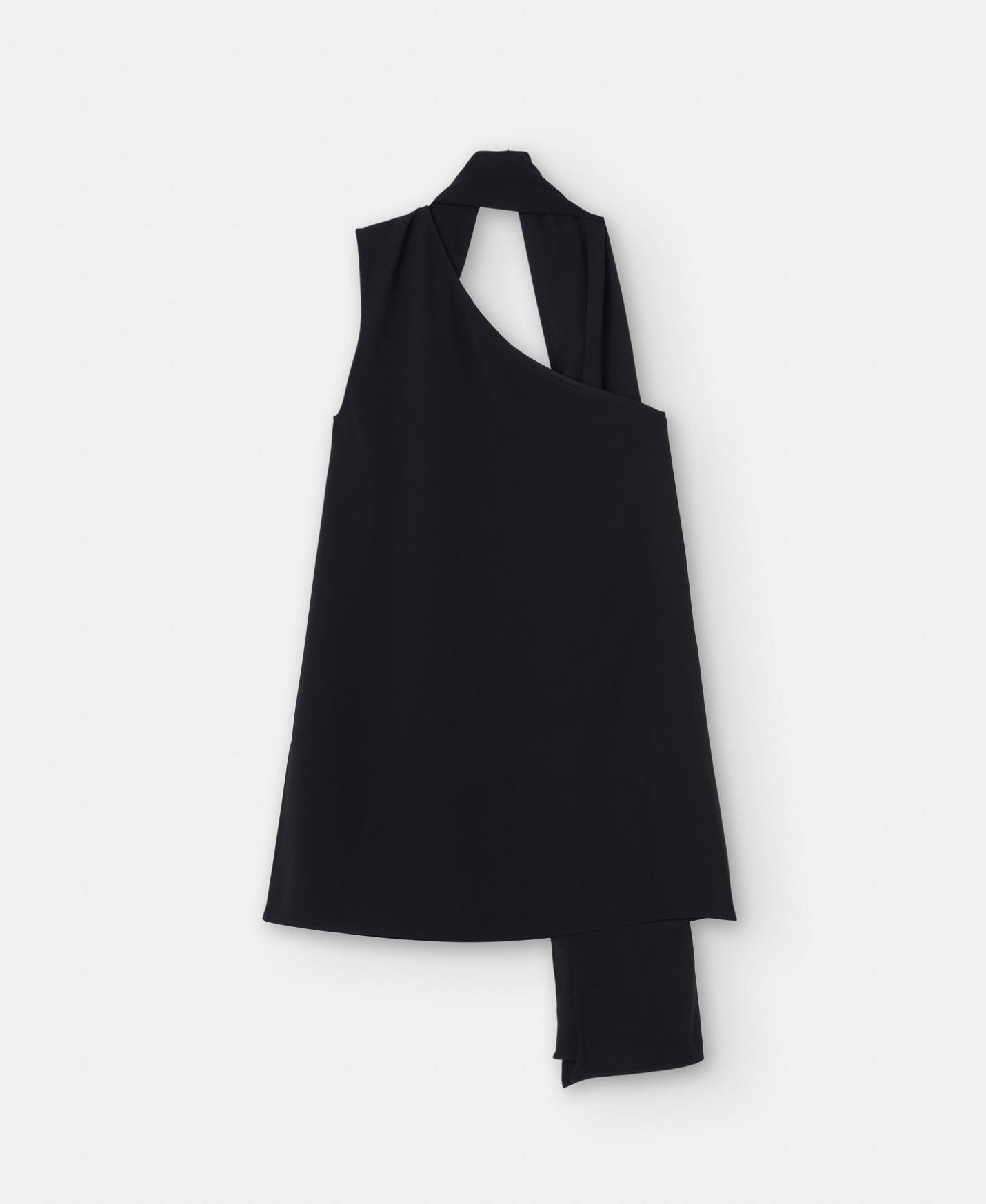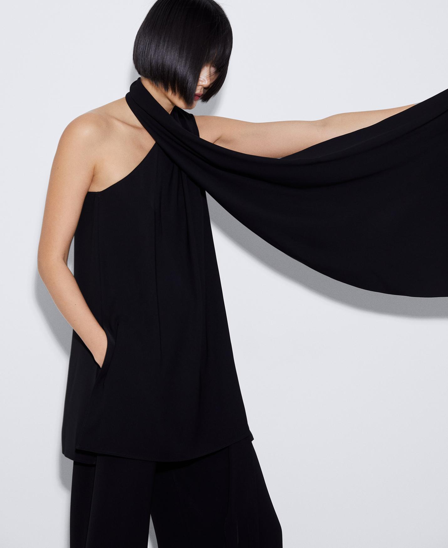 Top asimétrico en poliéster reciclado. Con bufanda de tiras cortadas a láser.
