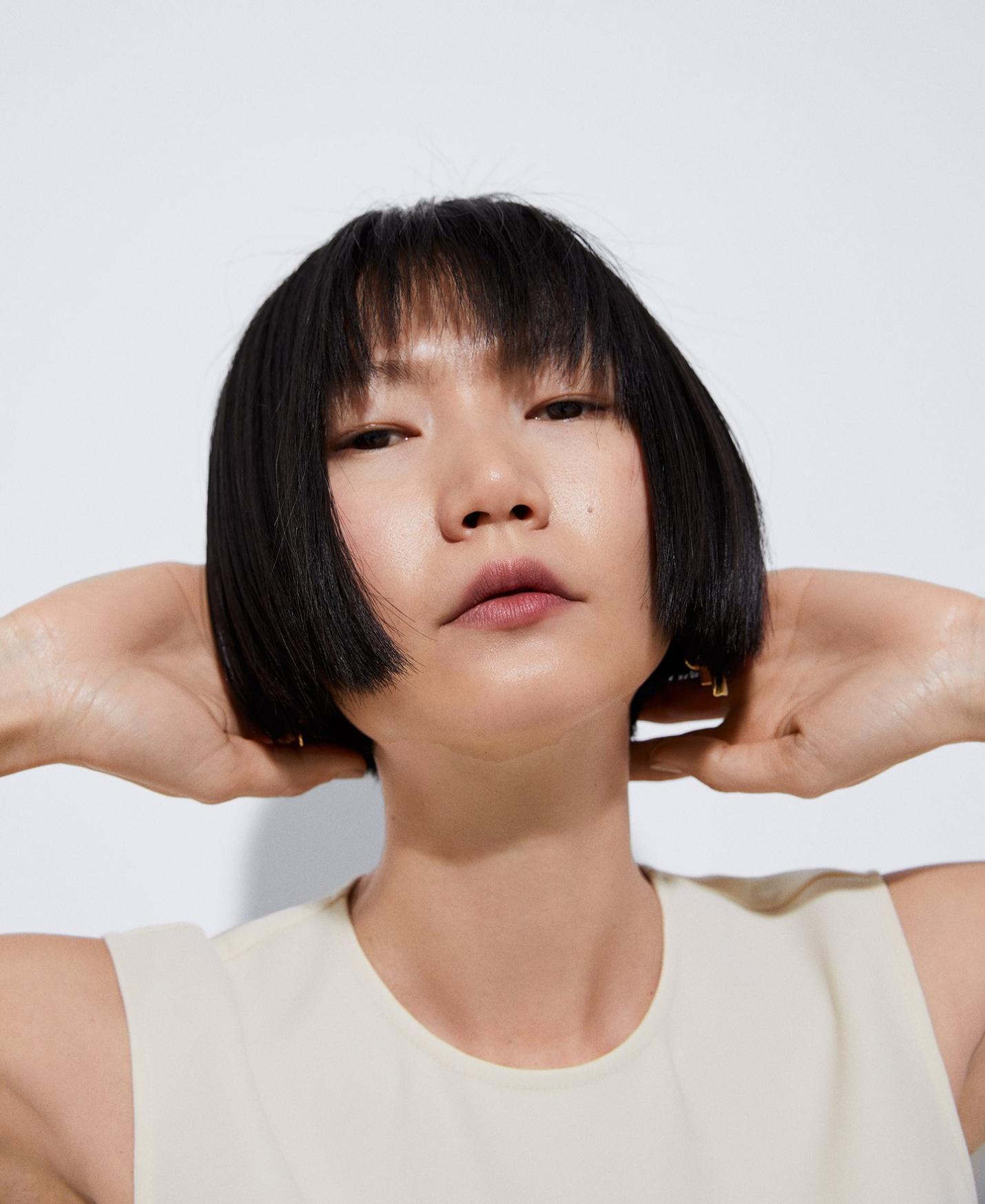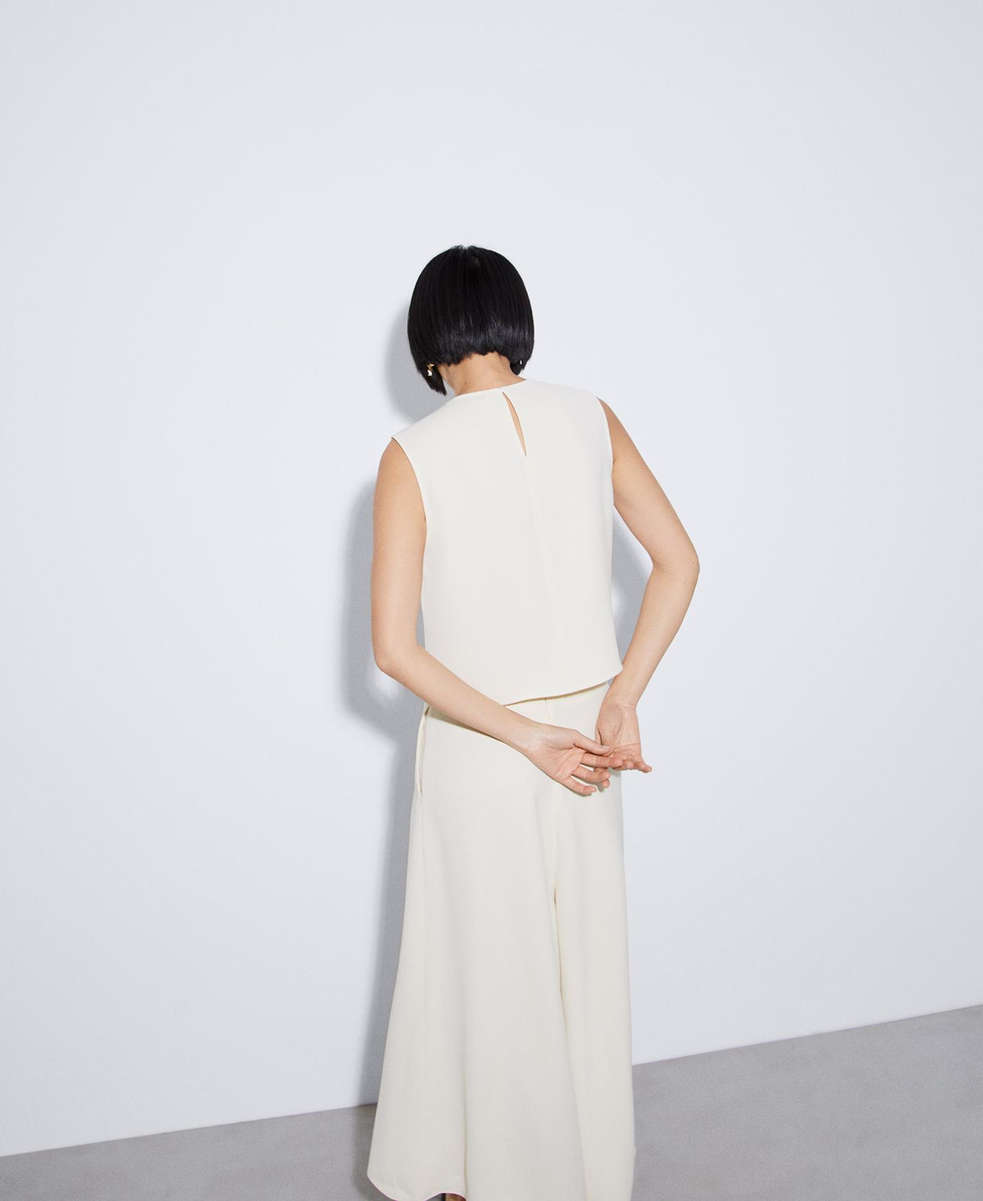 Top recto en poliéster reciclado. Tiene escote caja, con pestaña y botón oculto en espalda.