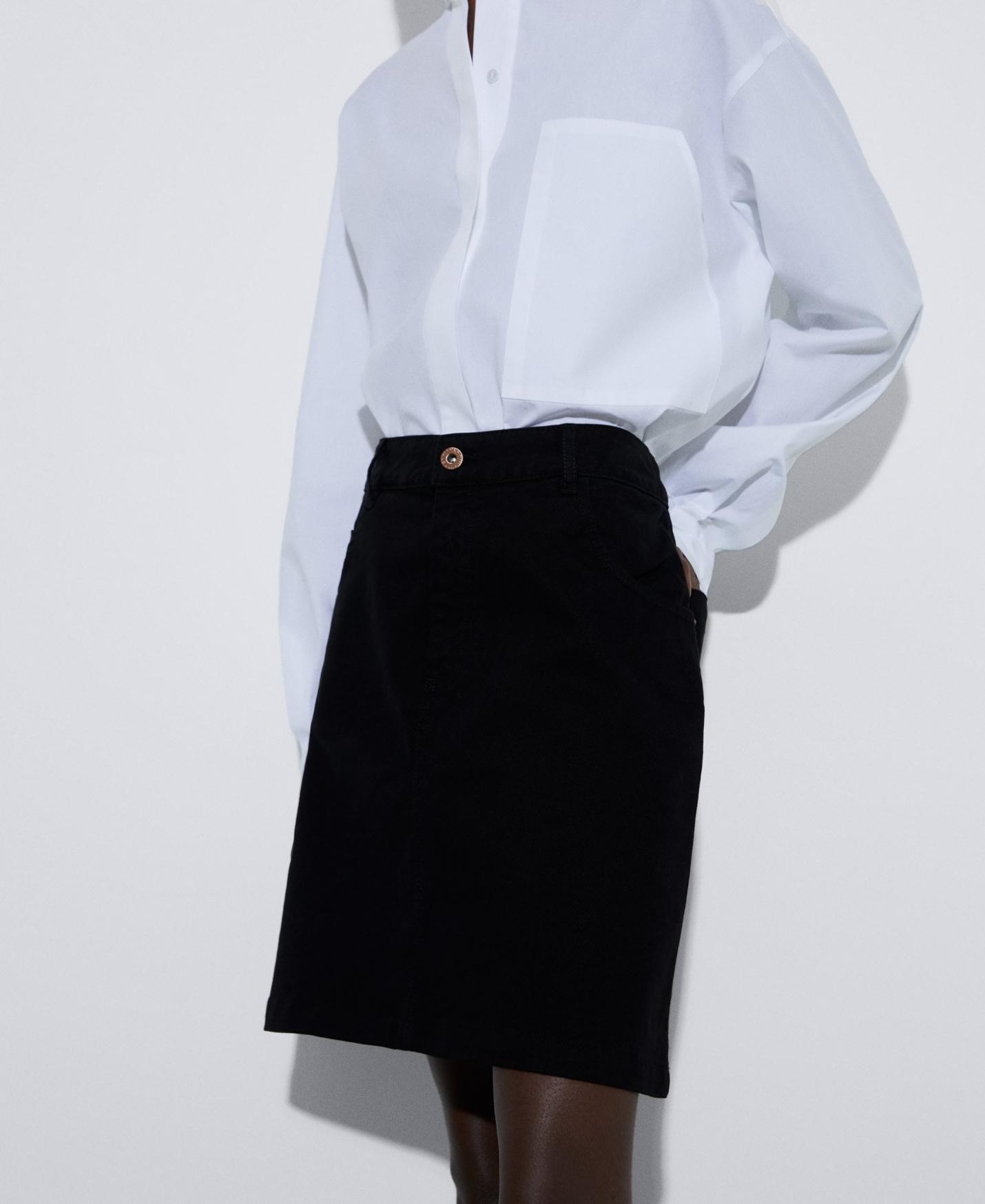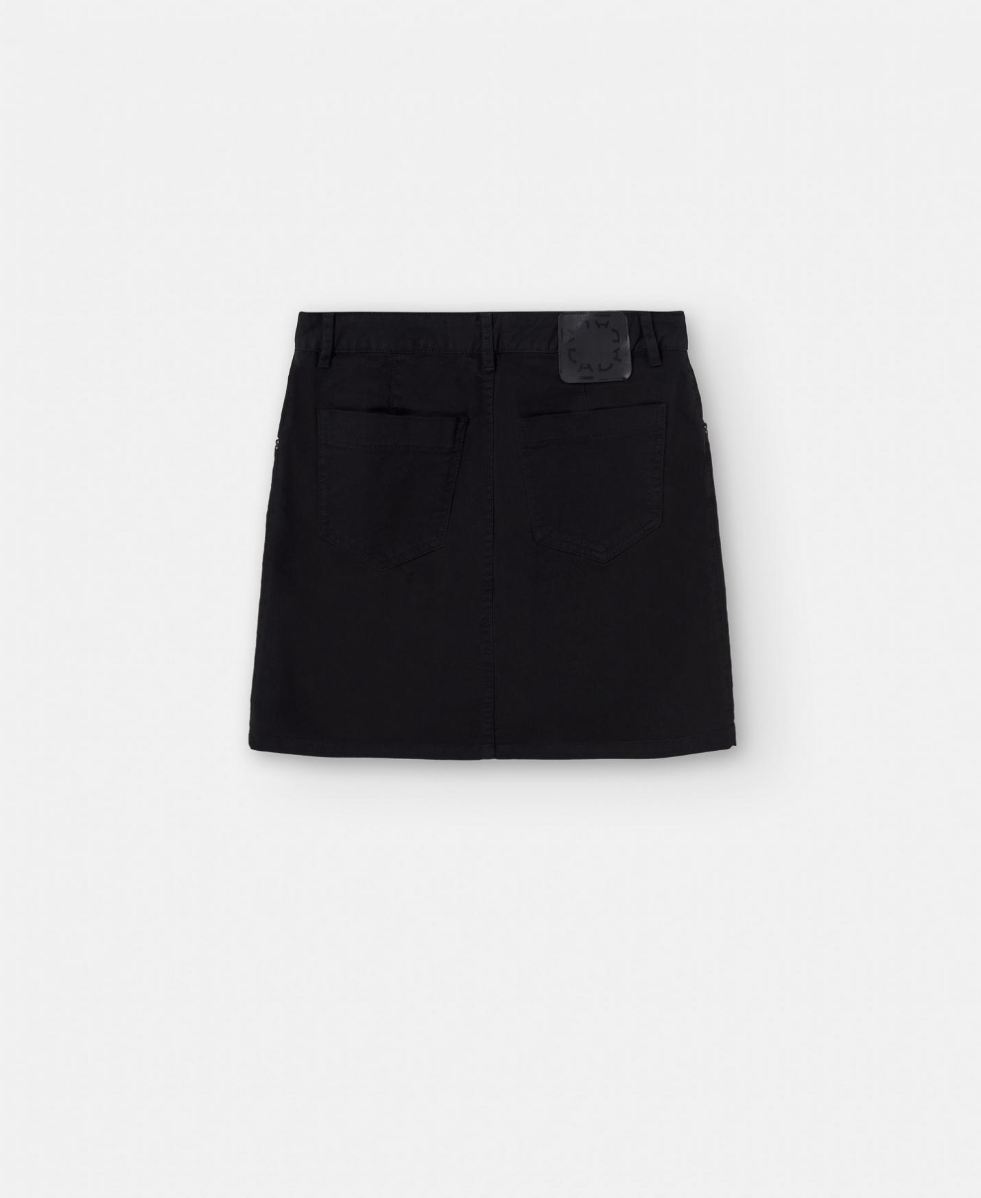 Falda corta en algodón orgánico. Tiene cinco bolsillos y cierre botón y cremallera.