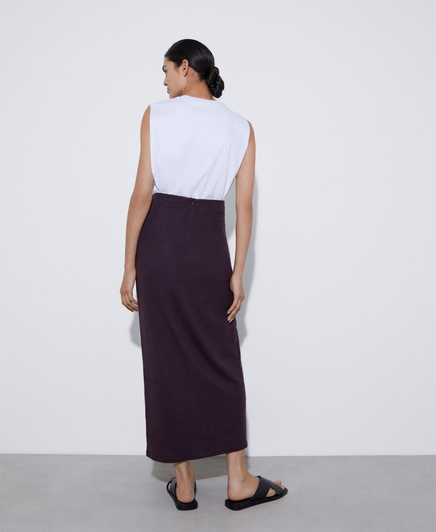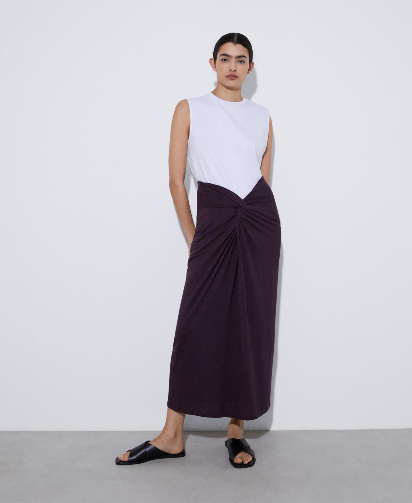 DescripciónRef.242072040221 Falda larga en lino. Dispone de dos piezas que se atan, creando el detalle de nudo en delantero. Tiro alto. lino detalle nudo tiro alto …