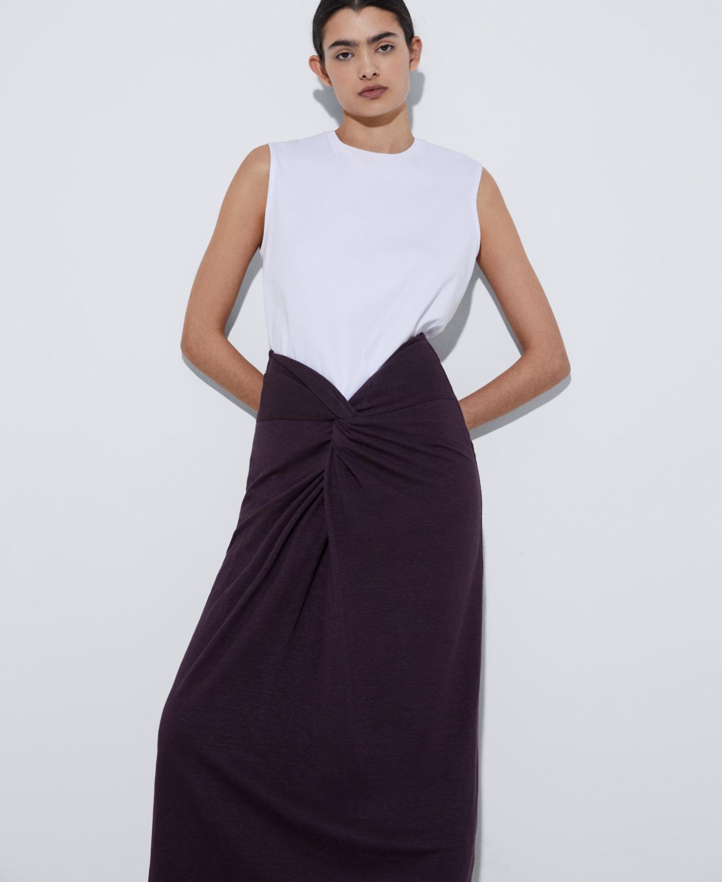 Falda larga en lino. Dispone de dos piezas que se atan, creando el detalle de nudo en delantero. Tiro alto.