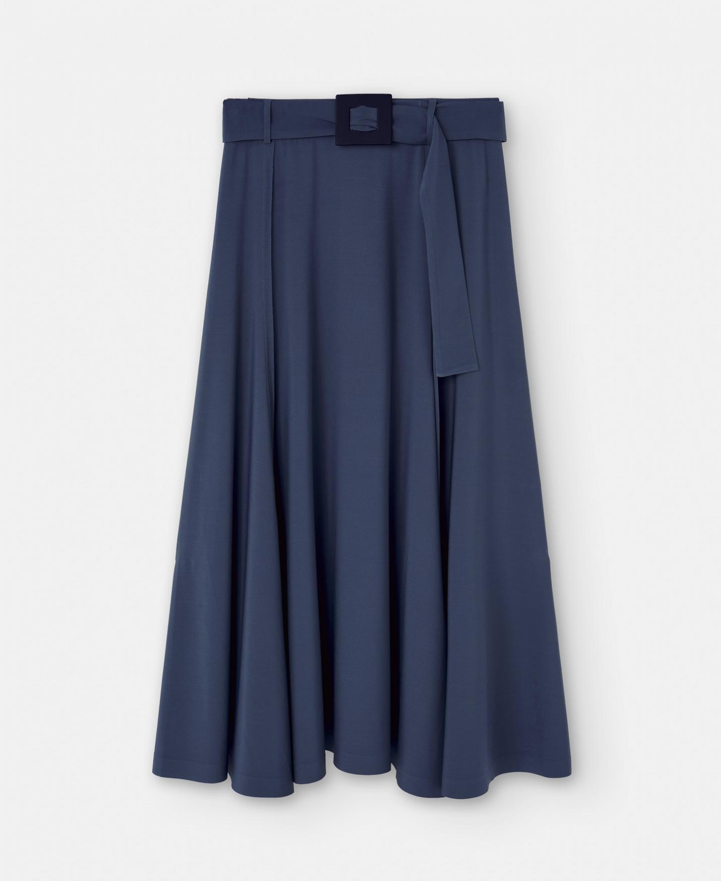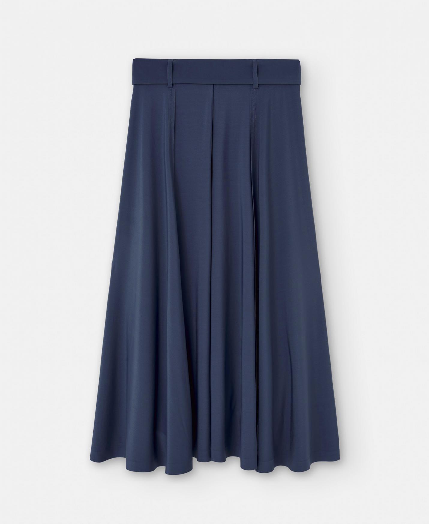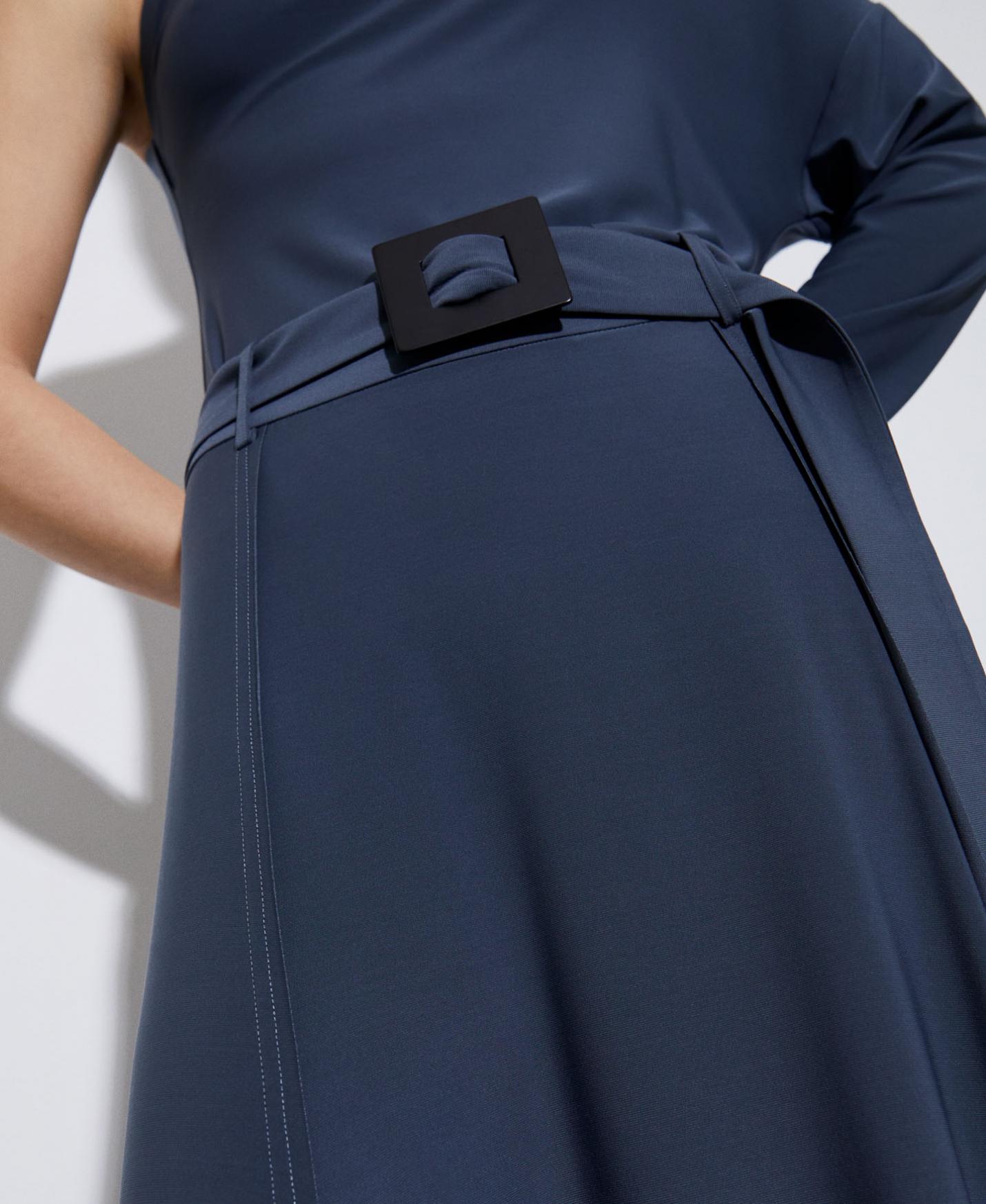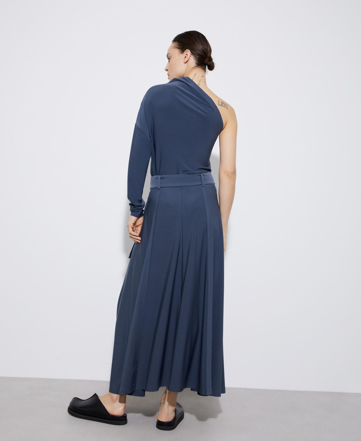 Falda larga en tejido de punto. Con vuelo, tiro alto y acabados cortados al laser.