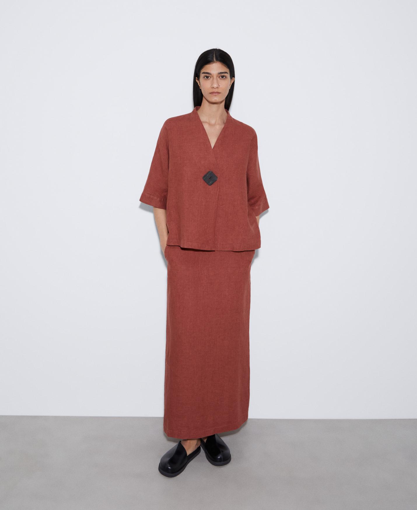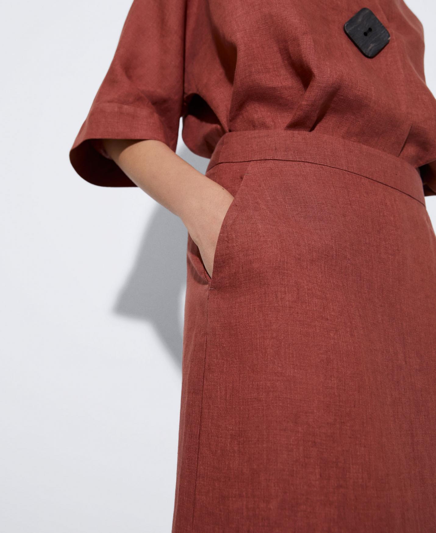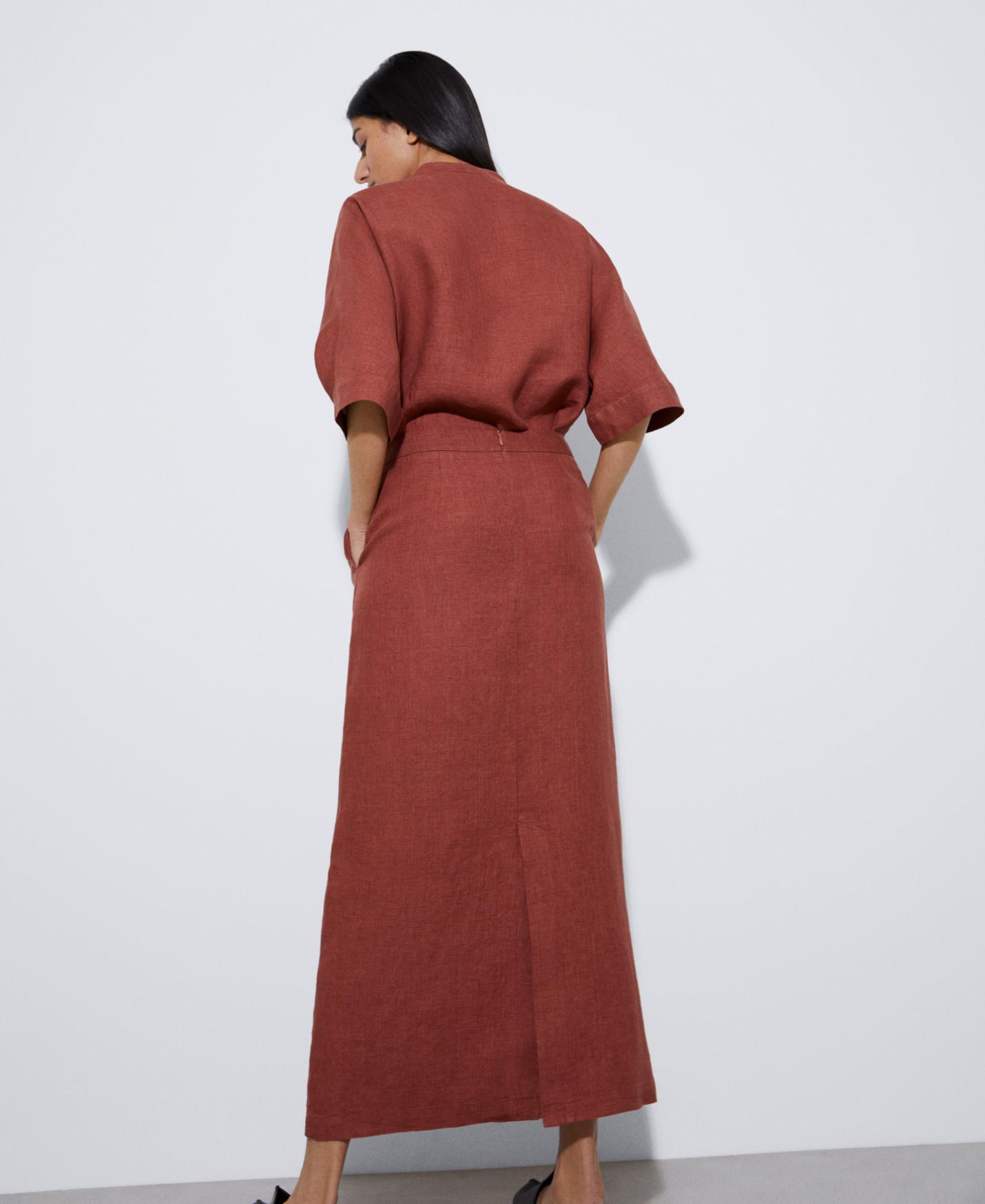 Falda en lino responsable europeo. Ligeramente evasé, de tiro alto, abertura en espalda y corte largo.