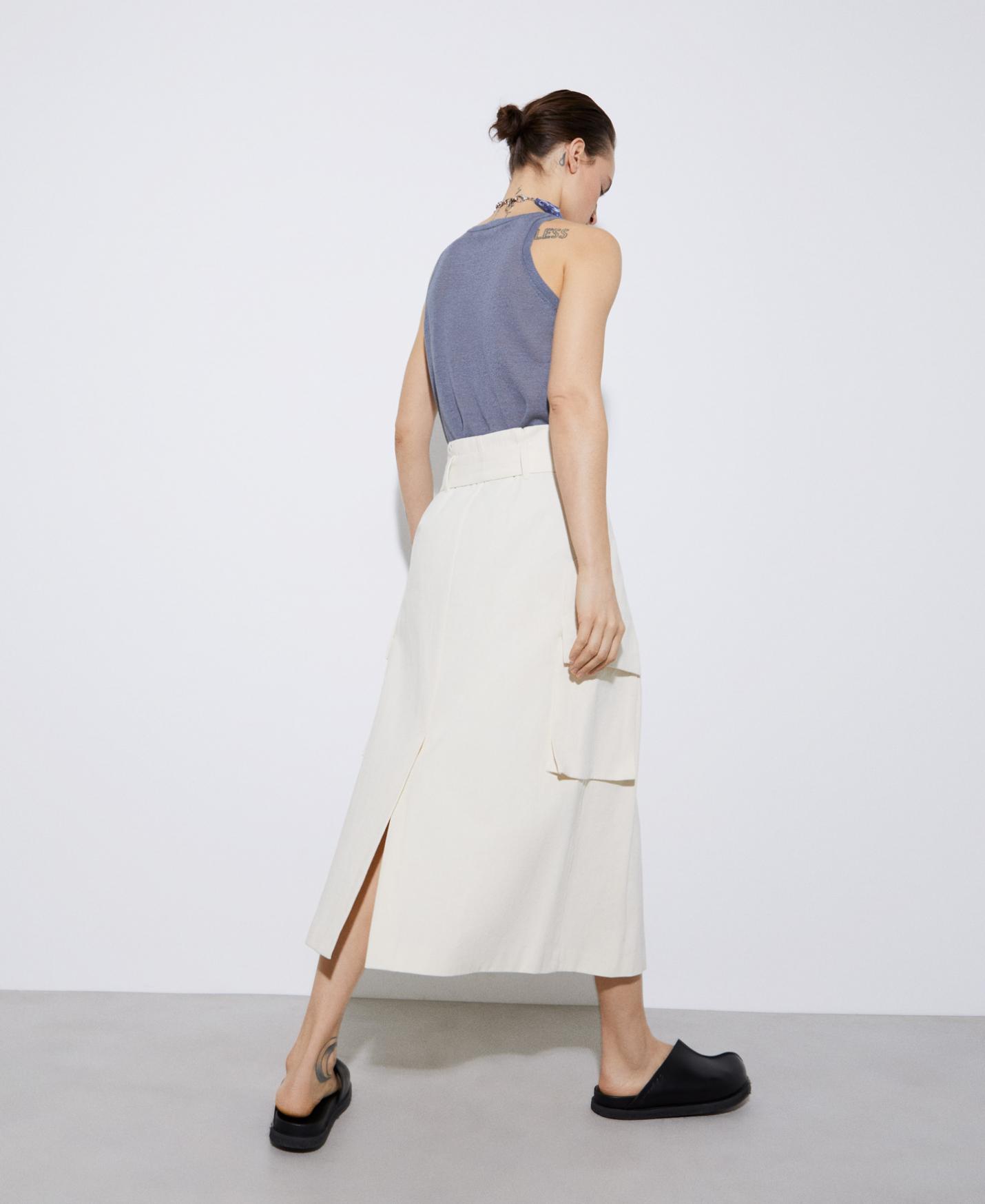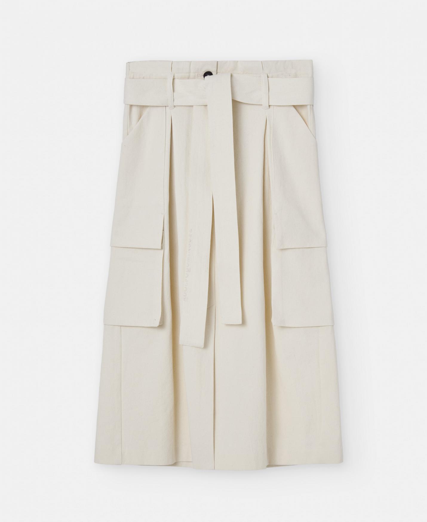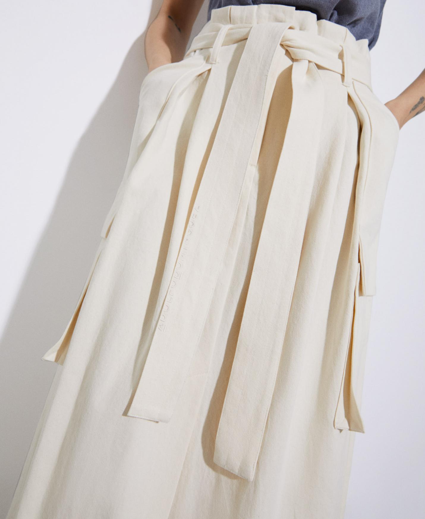 Falda recta en sarga de 100% algodón. De tiro alto, cintura marcada, detalle de lazo, bolsillos frontales con plastron y cierre cremallera.