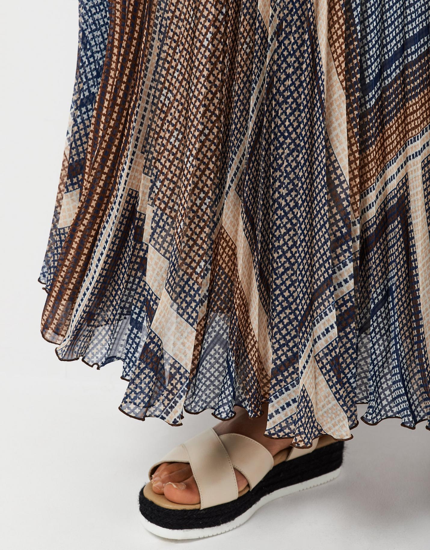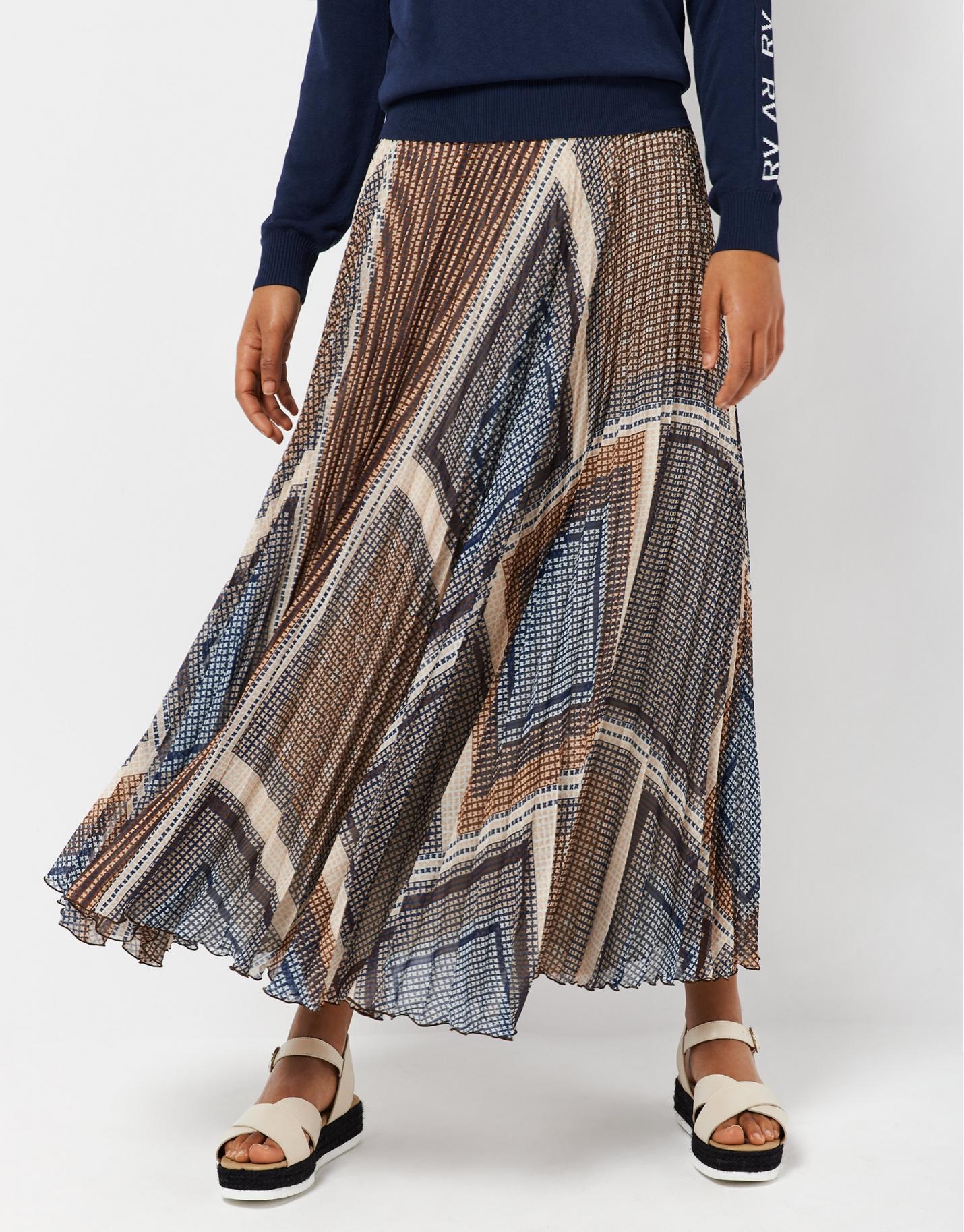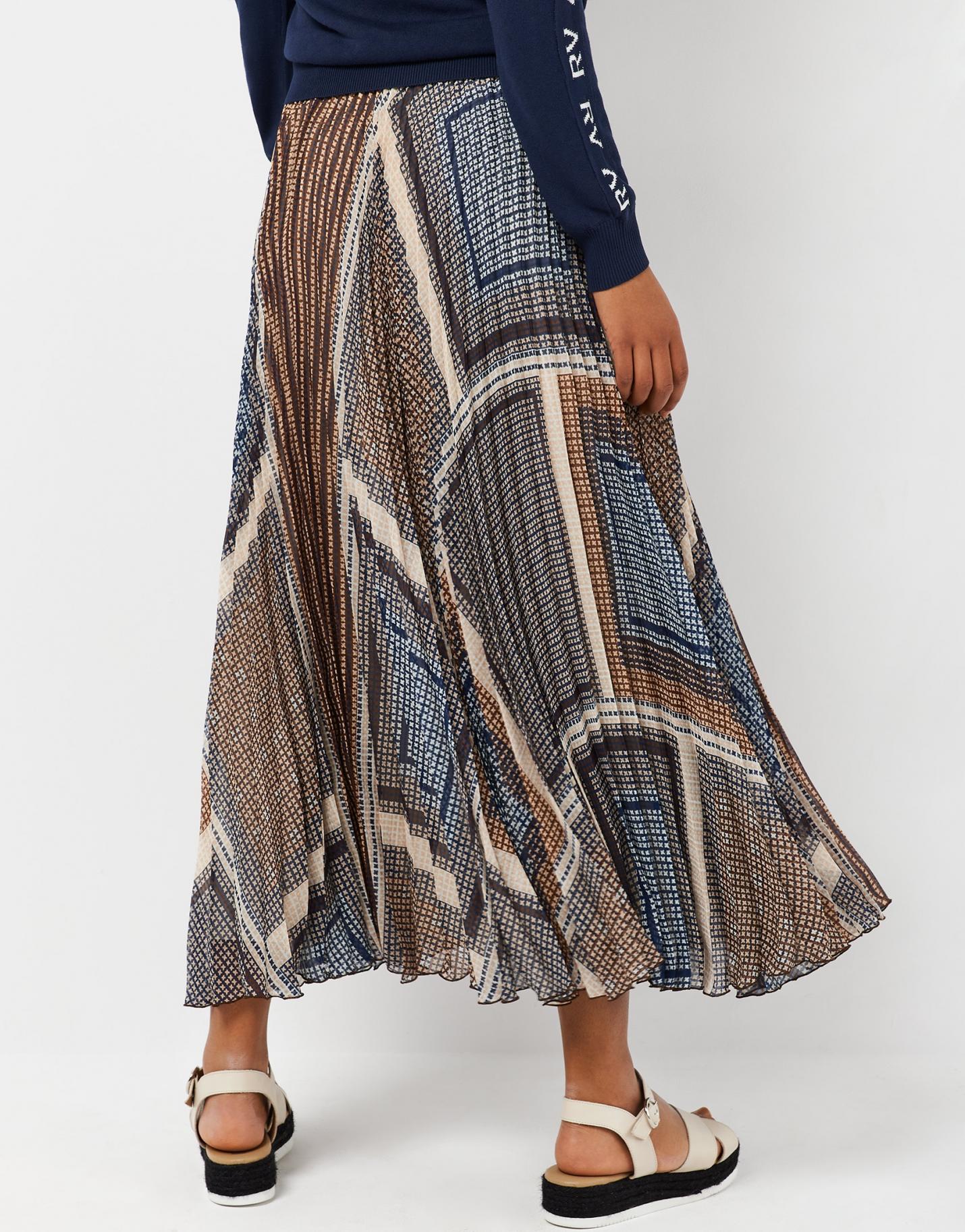 Falda midi plisada confeccionada en un tejido estampado geométrico en tonos ocres y marrones. Cintura rematada con goma.