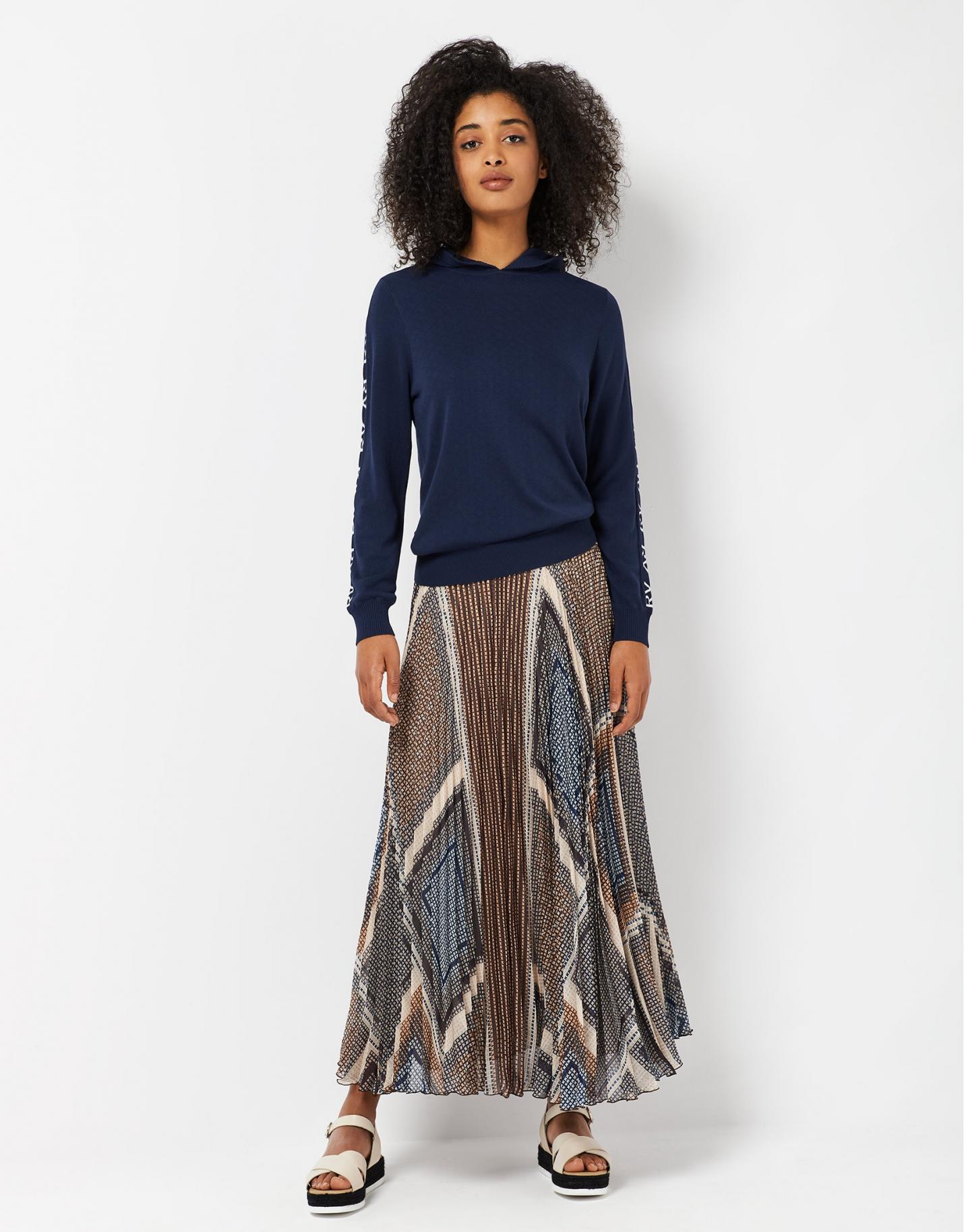 Falda midi plisada confeccionada en un tejido estampado geométrico en tonos ocres y marrones. Cintura rematada con goma. …
