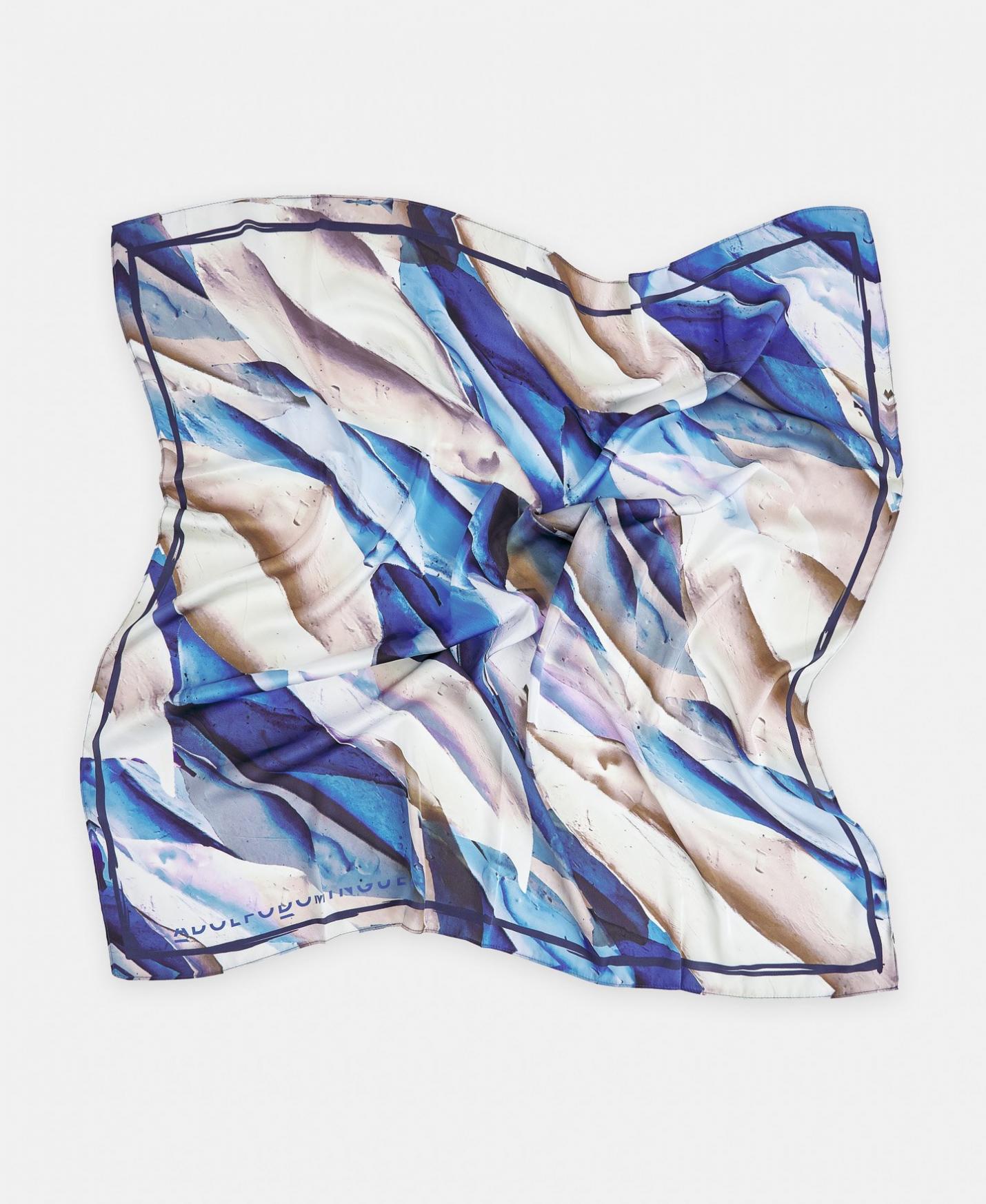 Pañuelo cuadro en poliéster. Con print de hojas superpuestas y tonos azules.