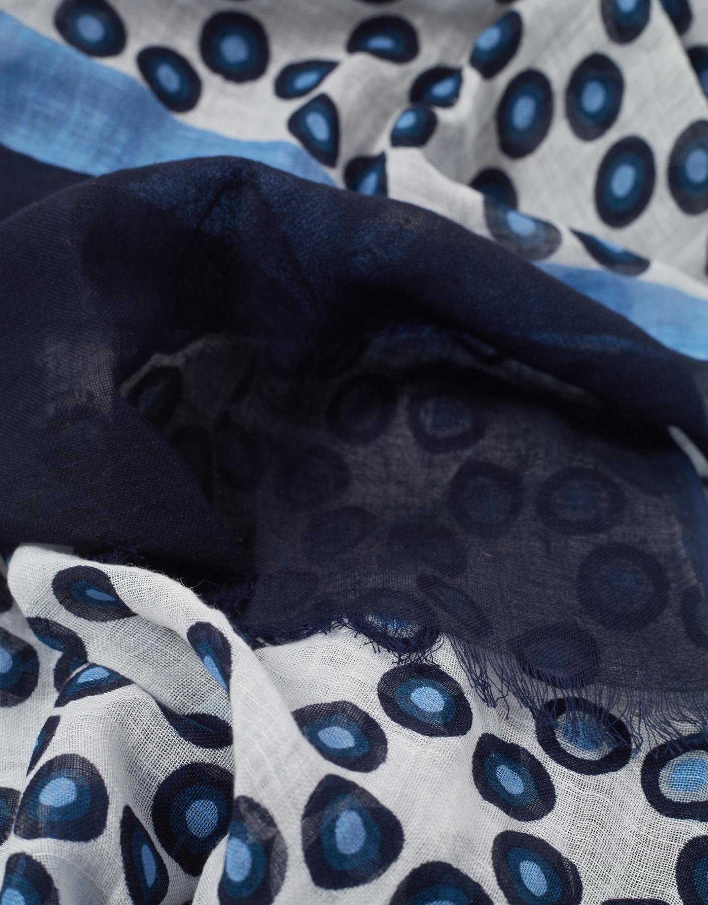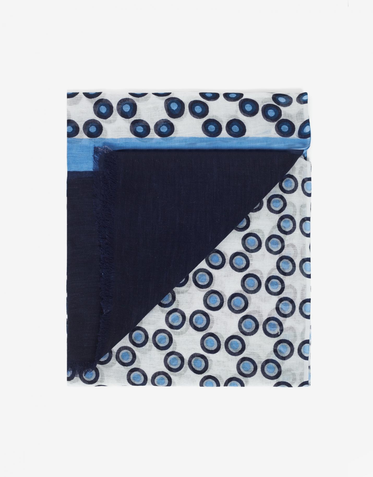Fular confeccionado en un tejido de lino y algodón color blanco con estampado de círculos en color marino, crudo y celeste y franjas en los extremos.