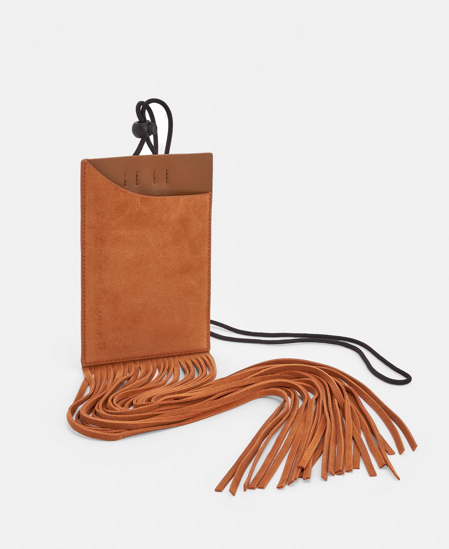 Funda de móvil en serraje y vaqueta interior. Detalle de flecos extralargos. Cordón regulable.