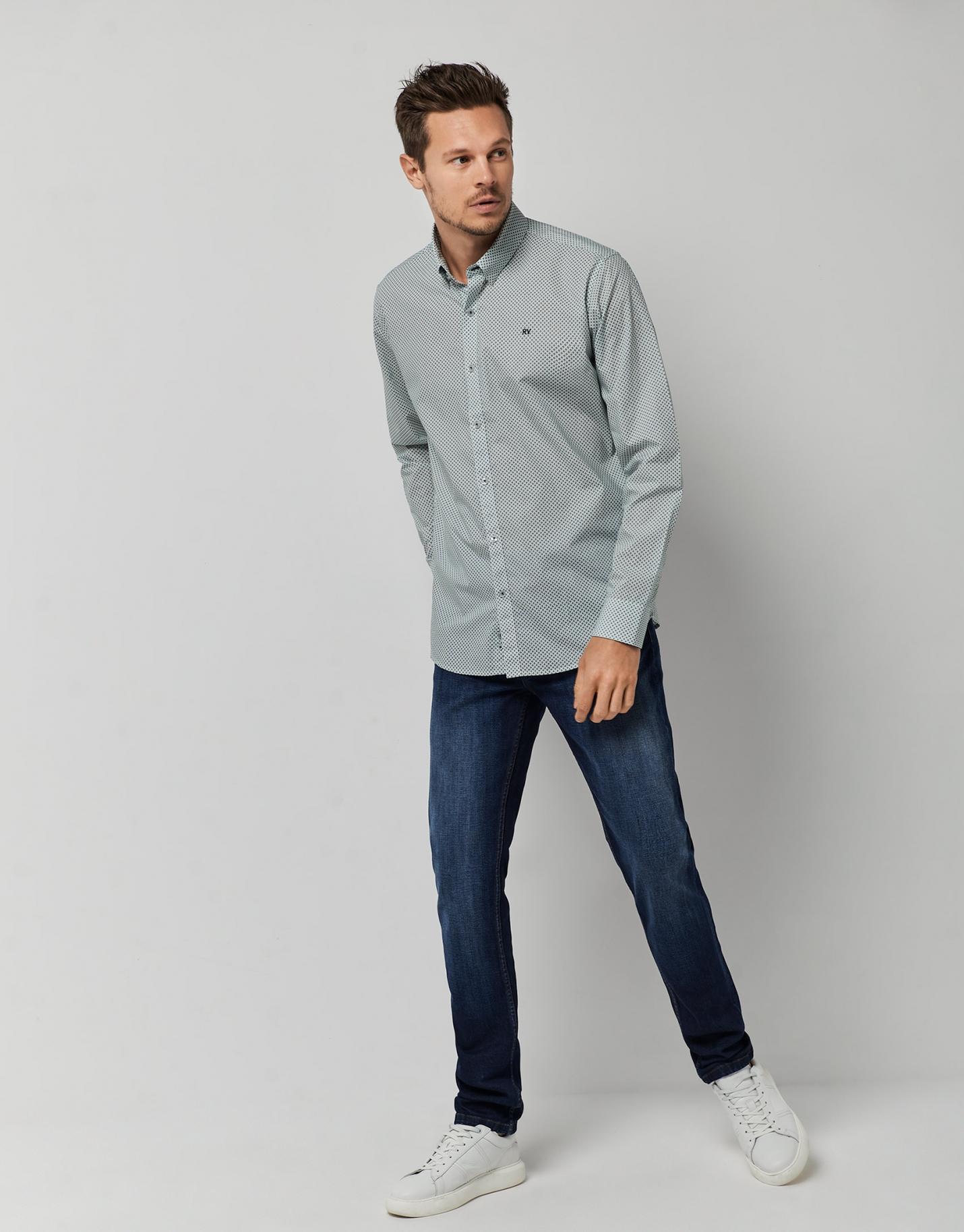 Camisa sport en algodón estampado geométrico en tonos verde y marino. Corte regular fit, cuello pico con botón oculto, cierre mediante botonadura frontal y manga larga terminada en puñ…