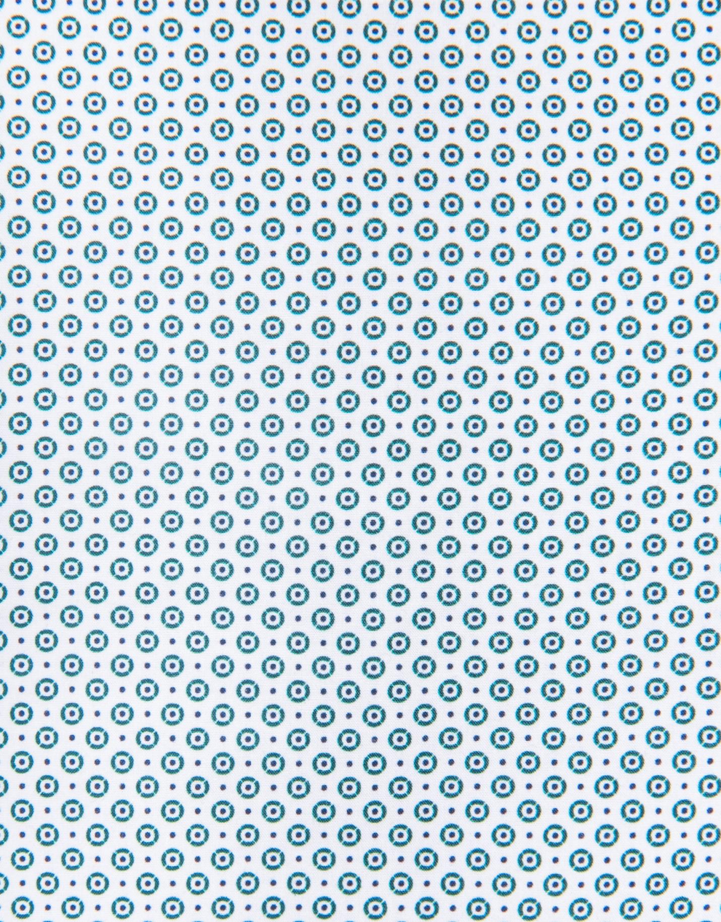 Camisa sport en algodón estampado geométrico en tonos verde y marino. Corte regular fit, cuello pico con botón oculto, cierre mediante botonadura frontal y manga larga terminada en puño redondeado. Bordado RV en pecho.