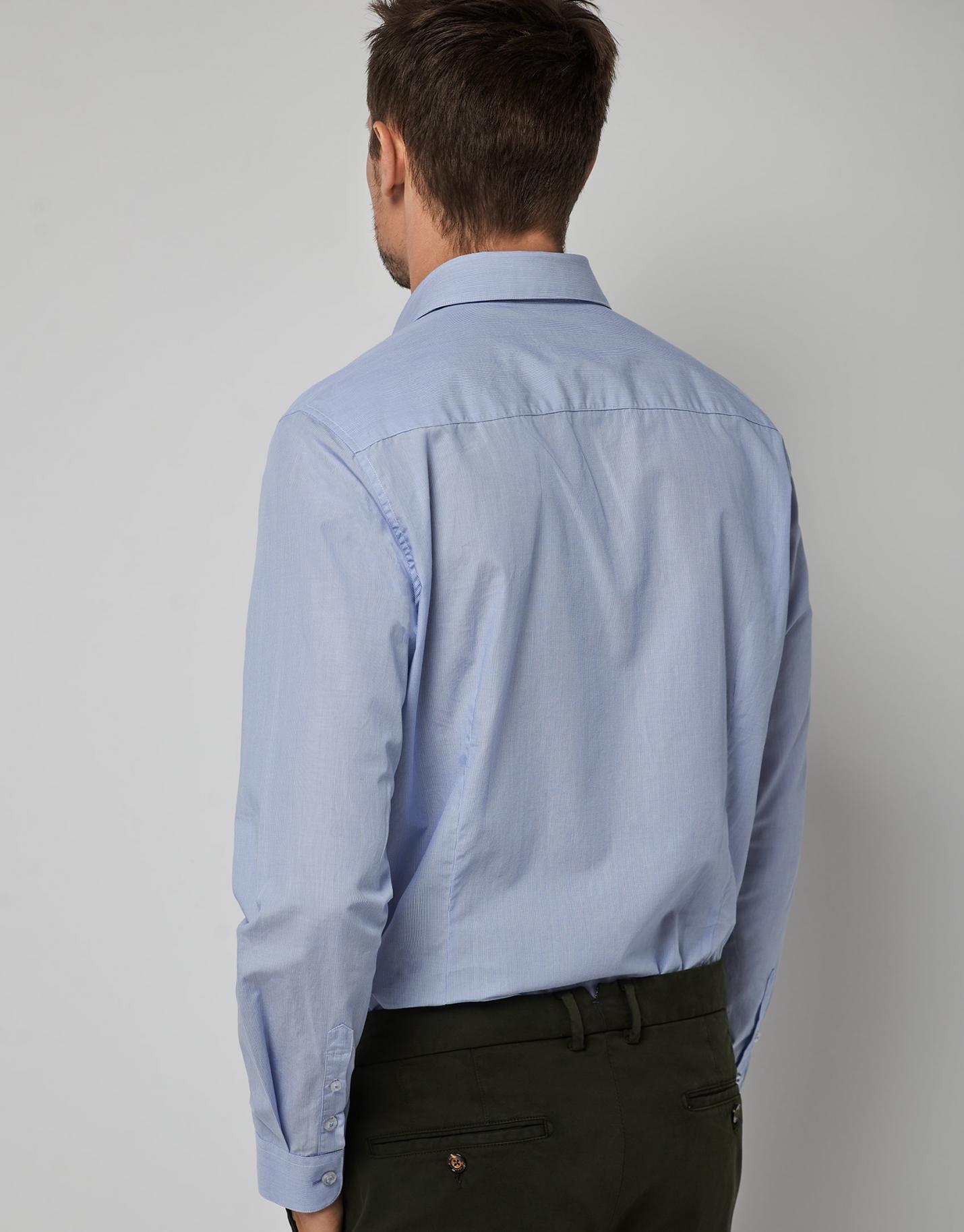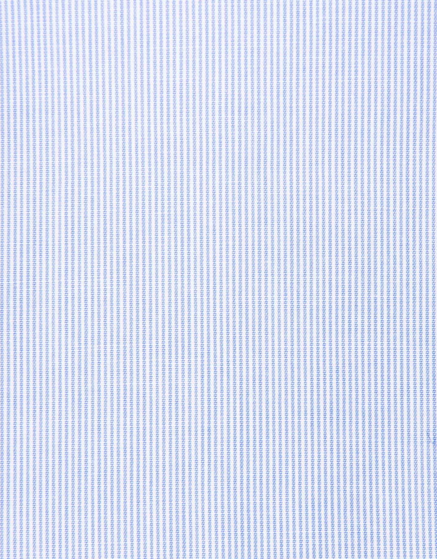 Camisa sport en algodón milrayas blanco y celeste. Corte slim, cuello italiano, manga larga y bordado RV en pecho.