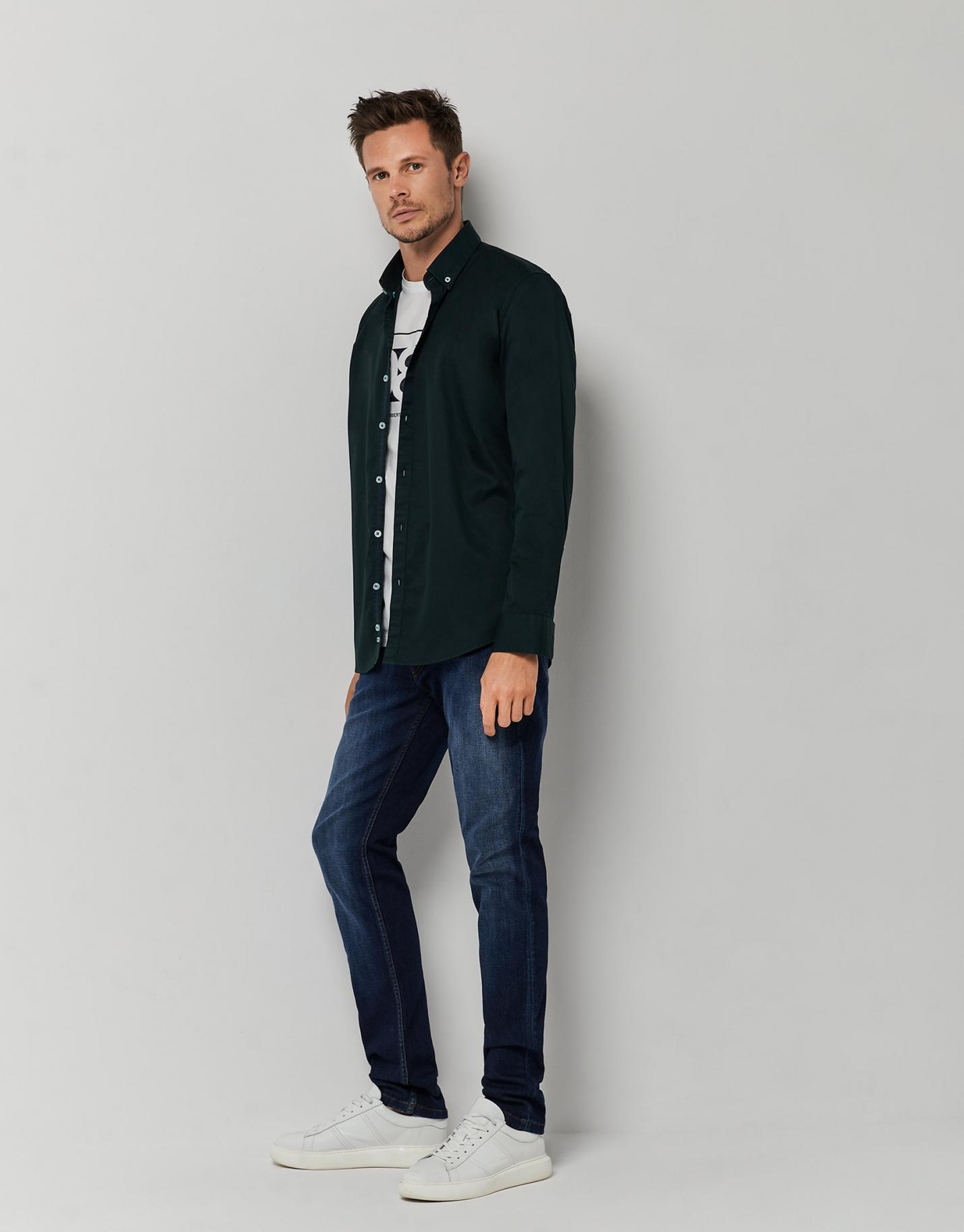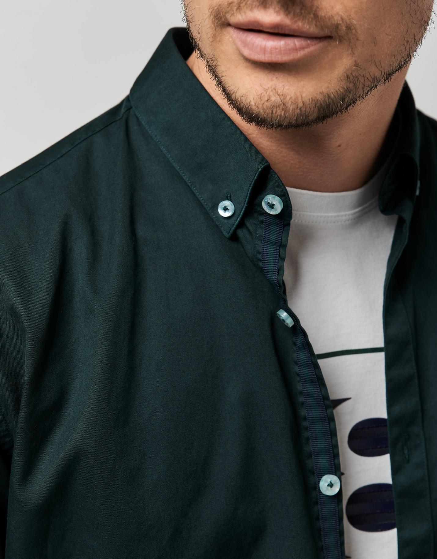 Camisa sport en twill de algodón tintado en color verde. Corte regular fit, cuello pico con botón, cierre mediante botonadura frontal y manga larga terminada en puño abotonado. Bordado RV en pecho.