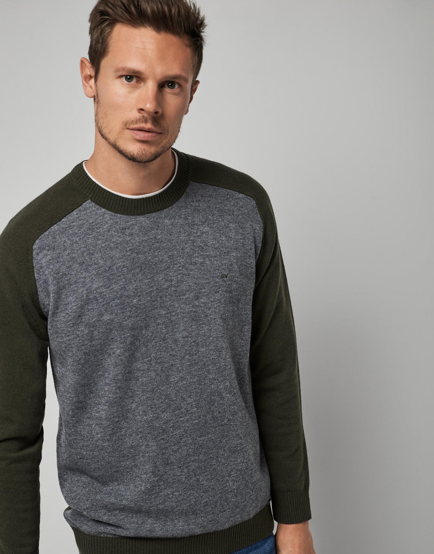 Jersey en mezcla de lana y cachemira a dos colores, gris en cuerpo y verde caqui en mangas, hombros, bajos y cuello. Cuello redondo y logo bordado en pecho.
