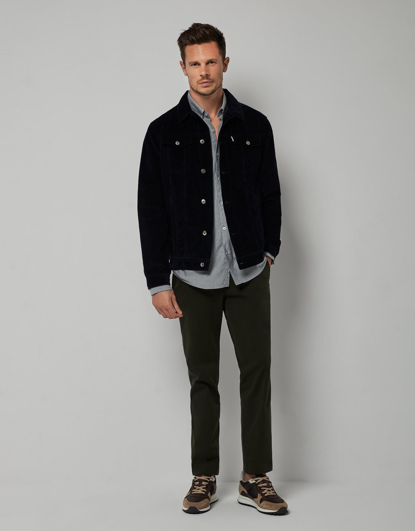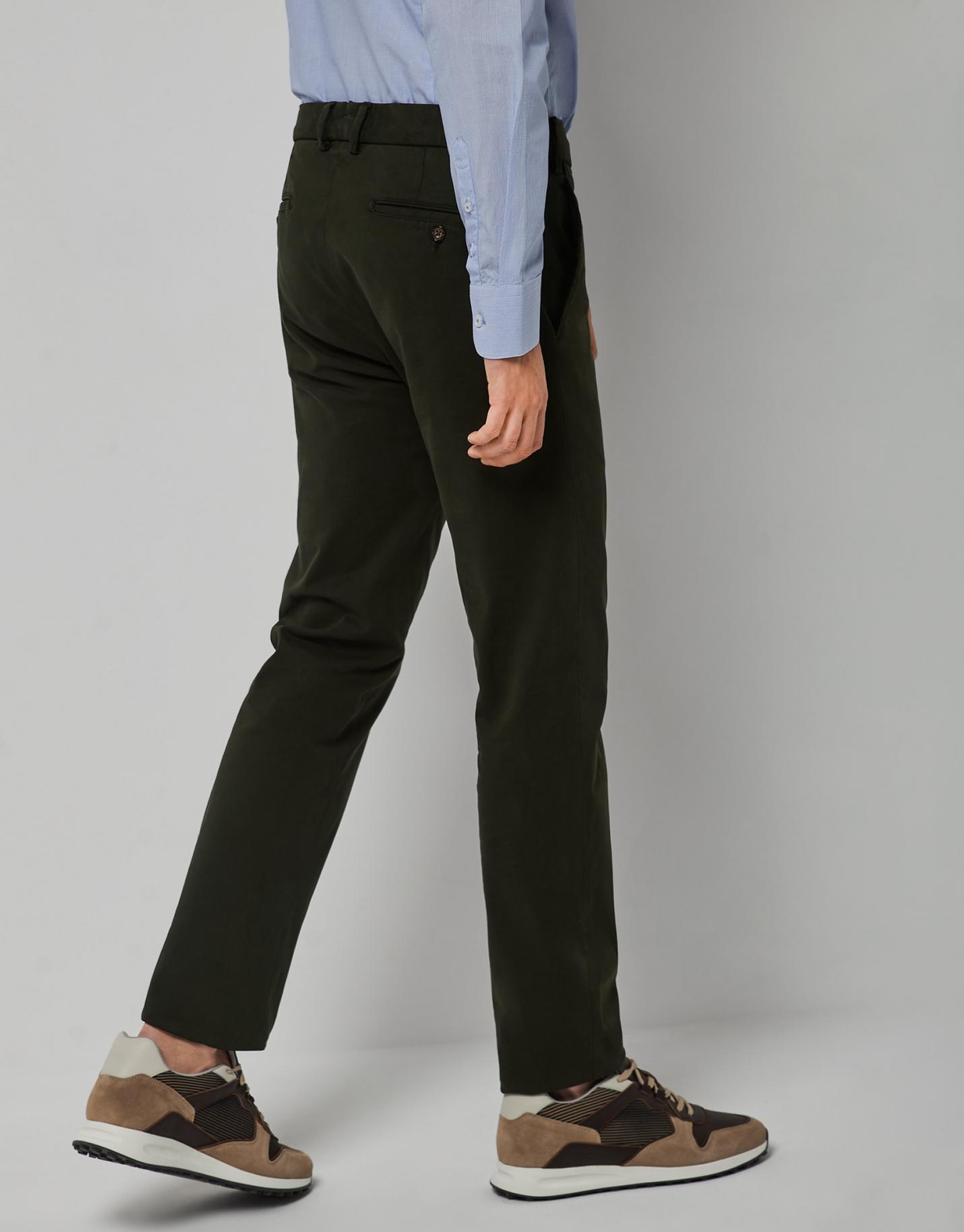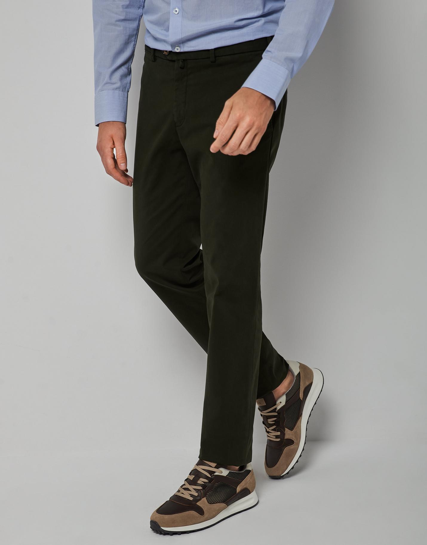 Pantalón chino regular fit en algodón ligeramente elástico tintado en color verde caqui. Bolsillo francés en delantero y bolsillo de vivo con botón en espalda.