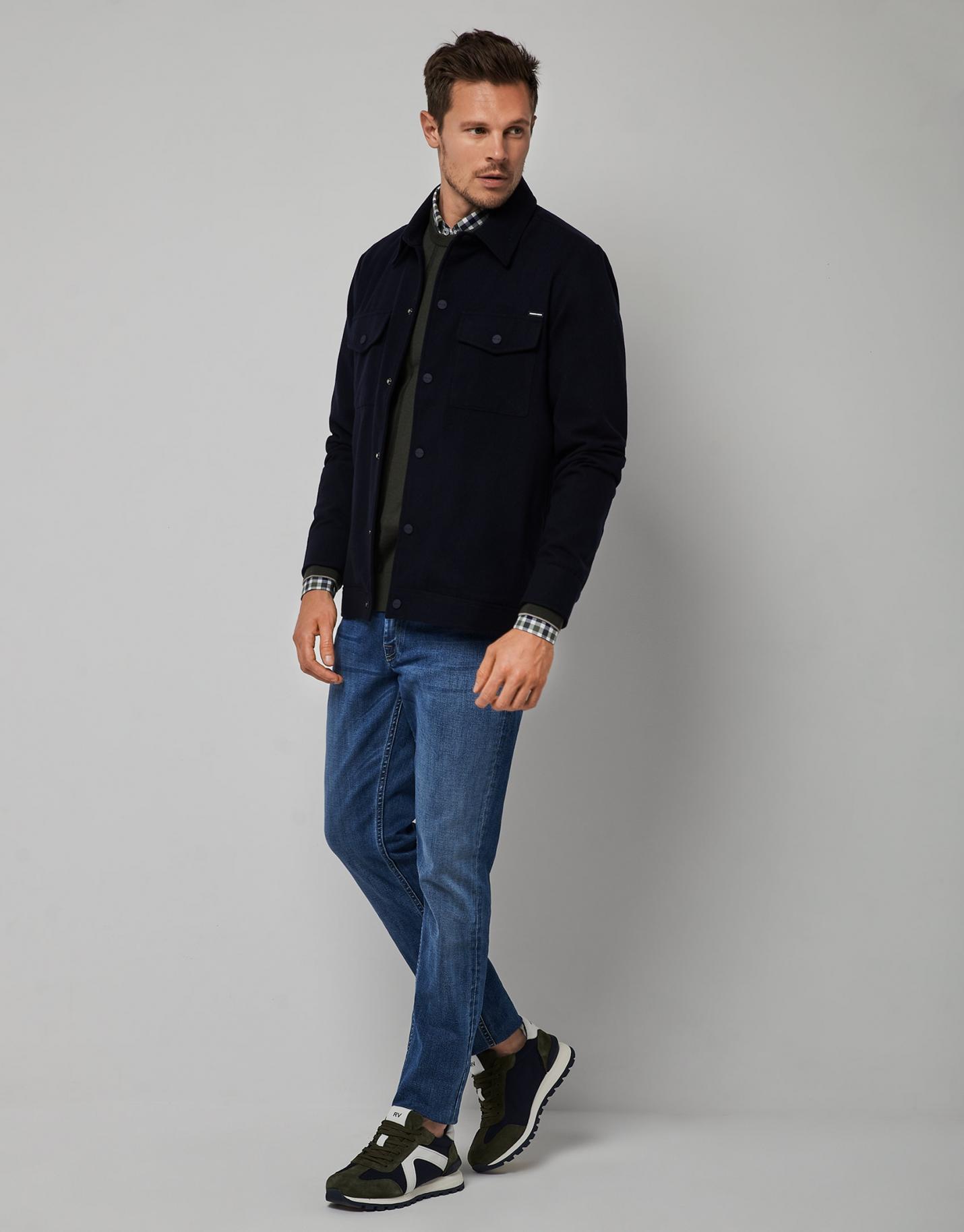 Chaqueta estilo sobrecamisa en tejido mezcla con lana en color azul marino. Cuello camisero, cierre con broches en delantero, dos bolsillos de tapeta con broche en pecho y dos insertados en costuras laterales. Manga larga rematada en puño con broche.
