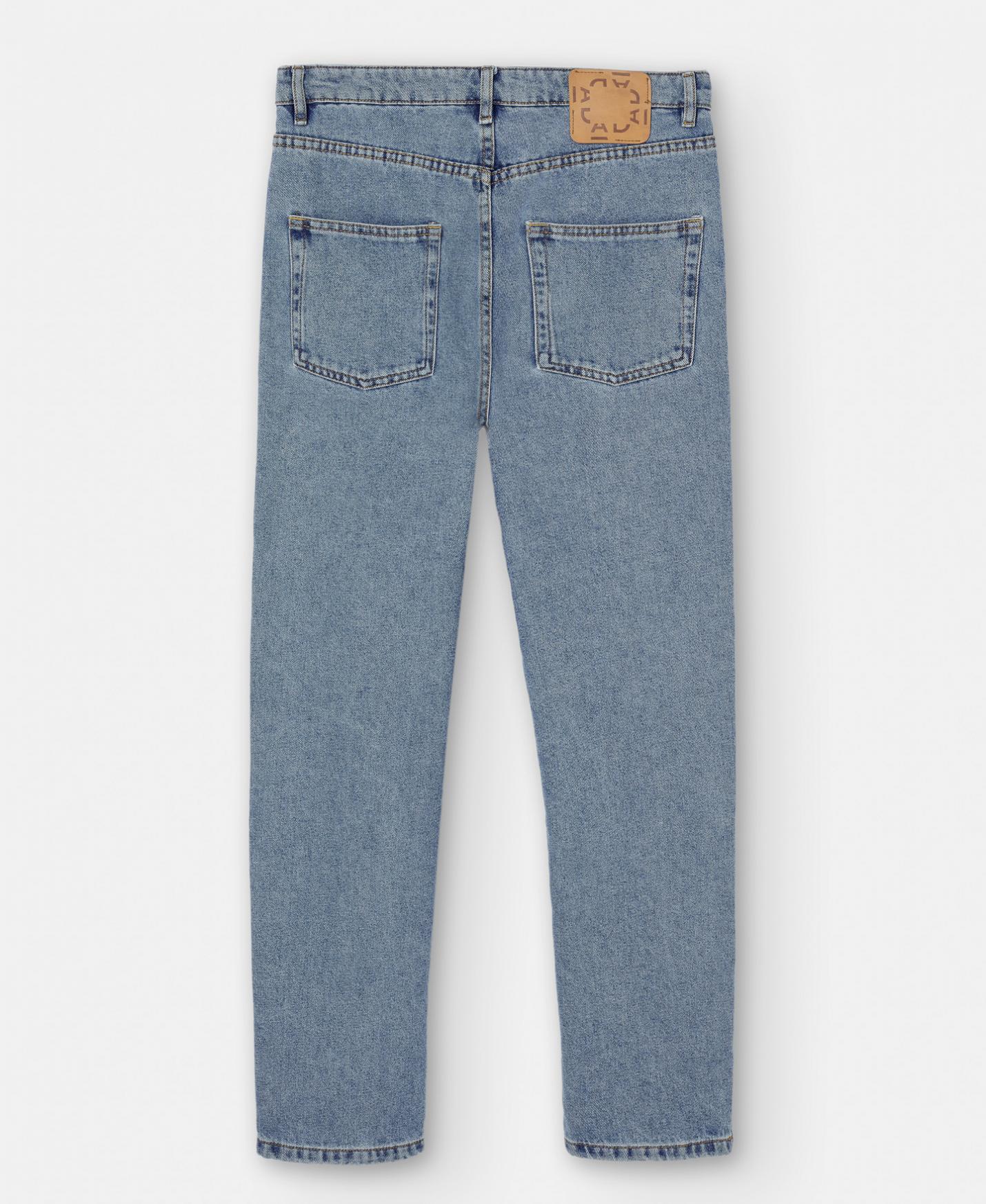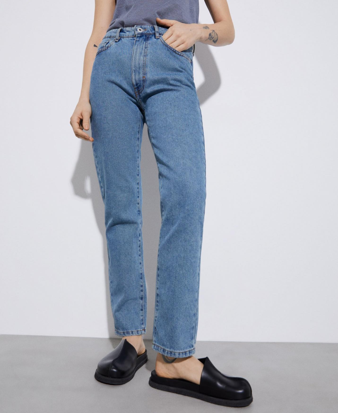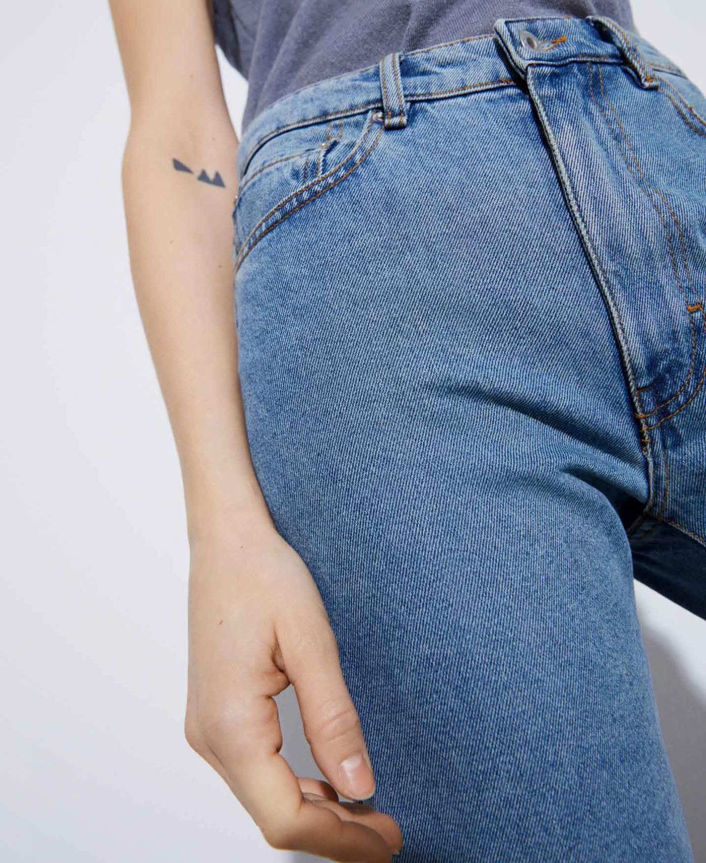 Pantalón vaquero en algodón reciclado. Tiene cintura alta y pernera recta y ancha. Cierre frontal con cremallera y botón y cinco bolsillos.