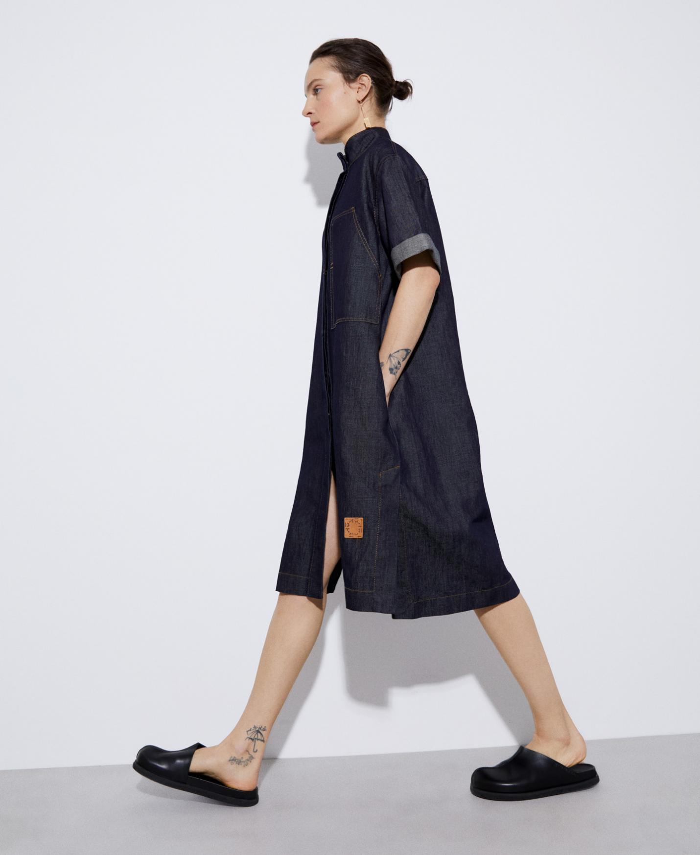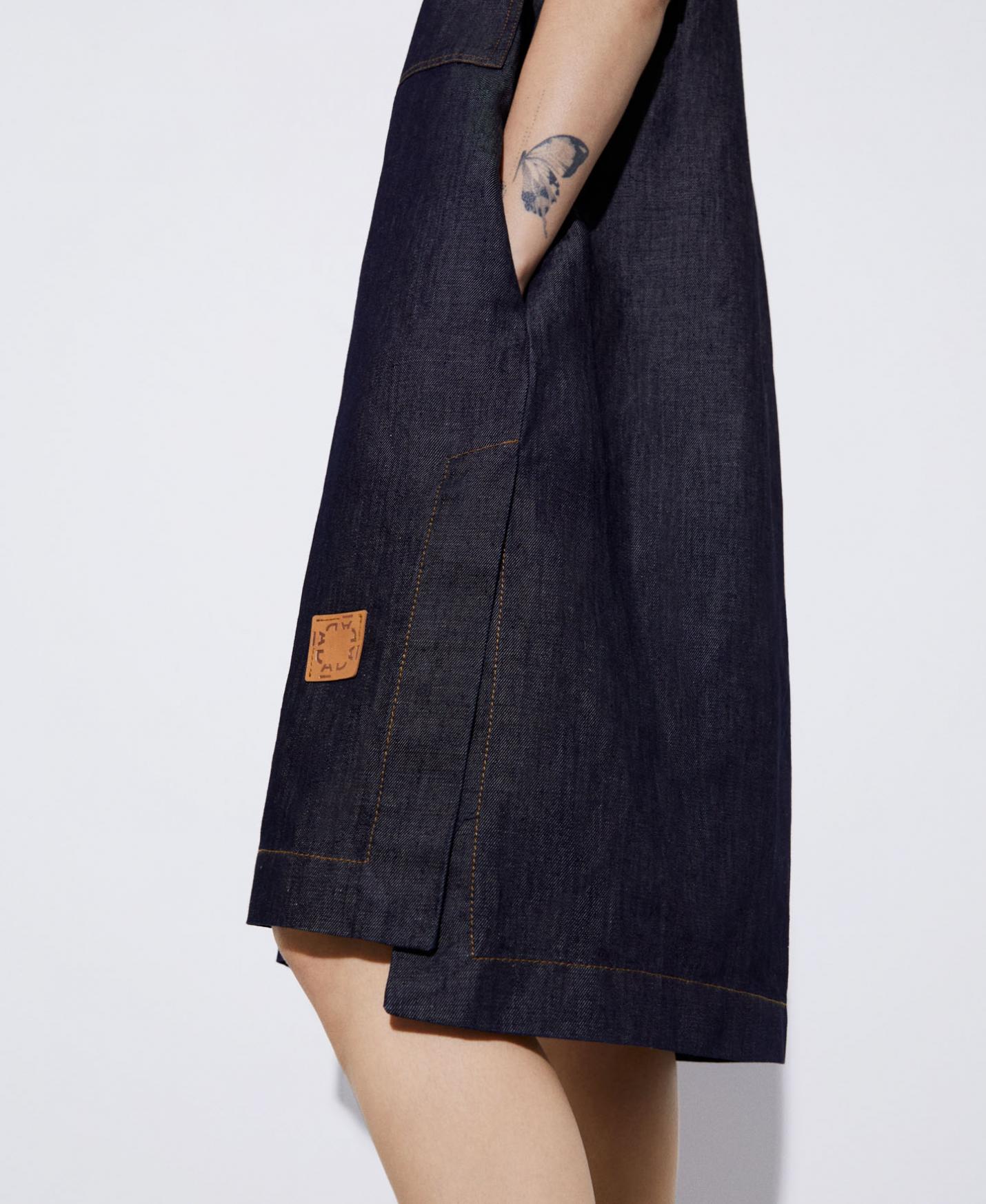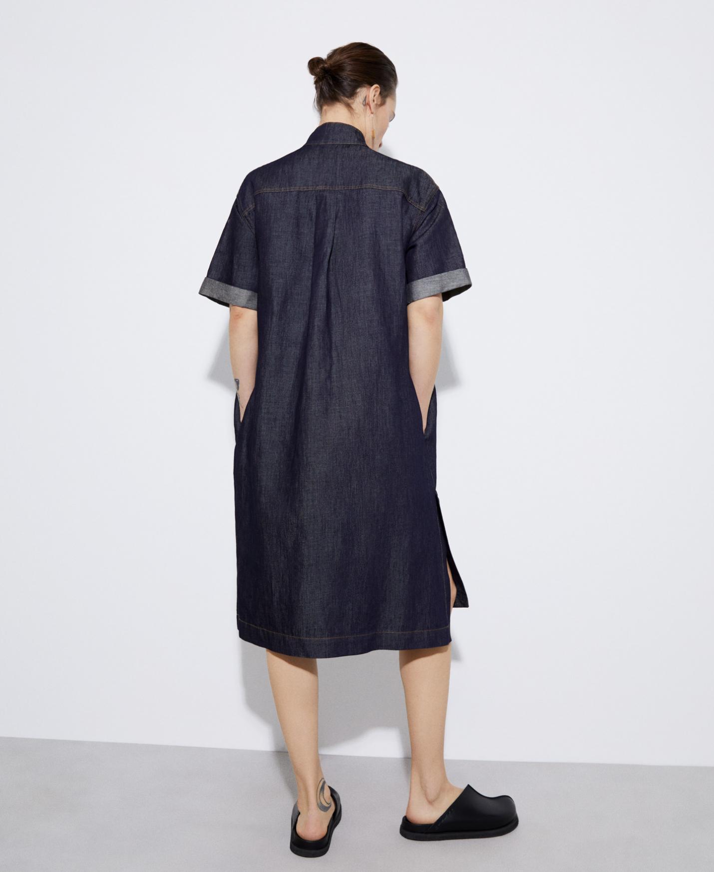 Vestido camisero en tejido de algodón y lino. Tiene cuello solapa, textura denim con aspecto de lavado medio, pespuntes vistos y aberturas en costado. Manga corta ligeramente acampanada y largo rodilla