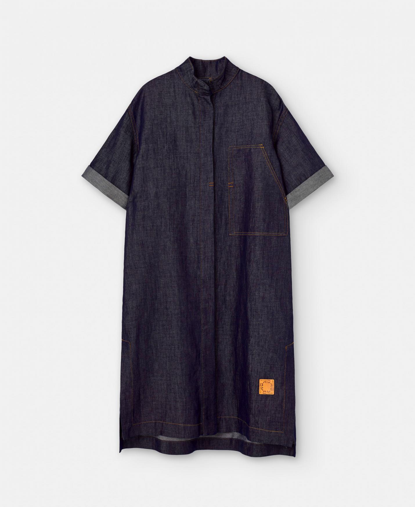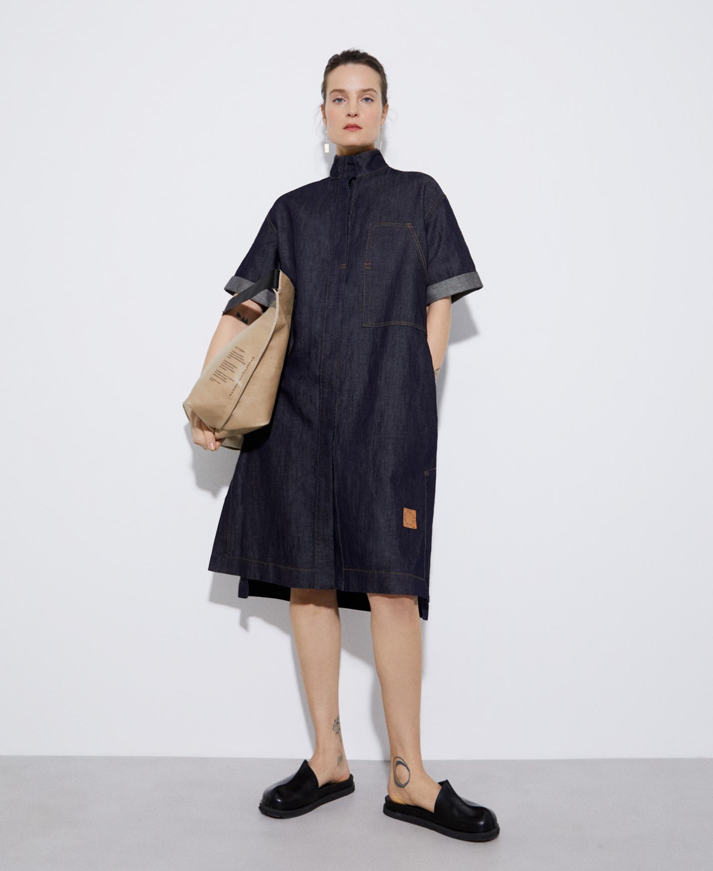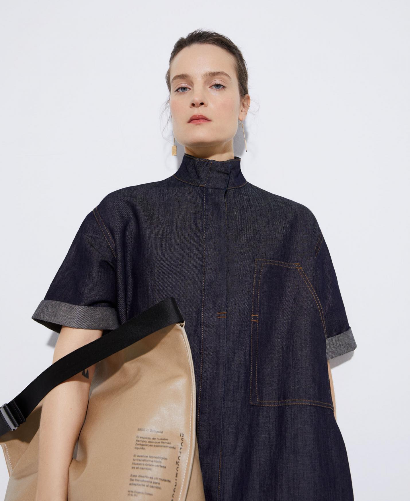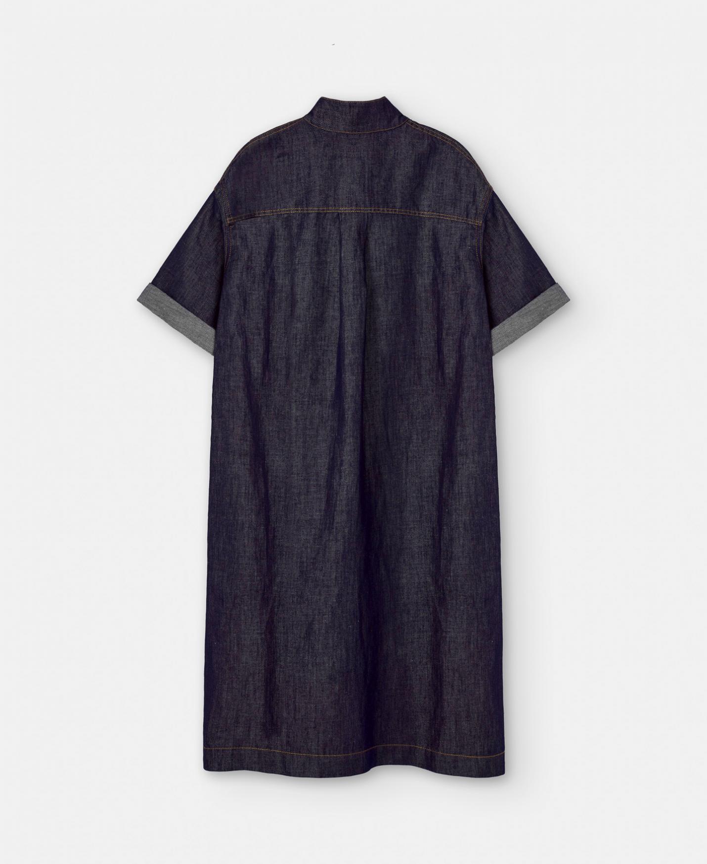 Vestido camisero en tejido de algodón y lino. Tiene cuello solapa, textura denim con aspecto de lavado medio, pespuntes vistos y aberturas en costado. Manga corta ligeramente acampanada y largo rodilla
