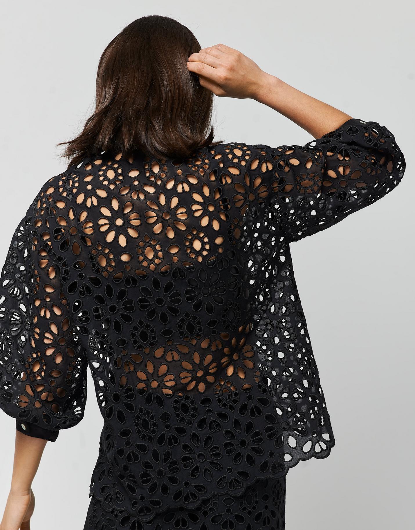 Blusa de manga ¾ abullonada en tejido con bordado suizo color negro sin forro con cuello camisero y cierre con botonadura central a la vista. Corte recto y ancho. Tapeta, cuello y puños rematados con tejido liso a tono.