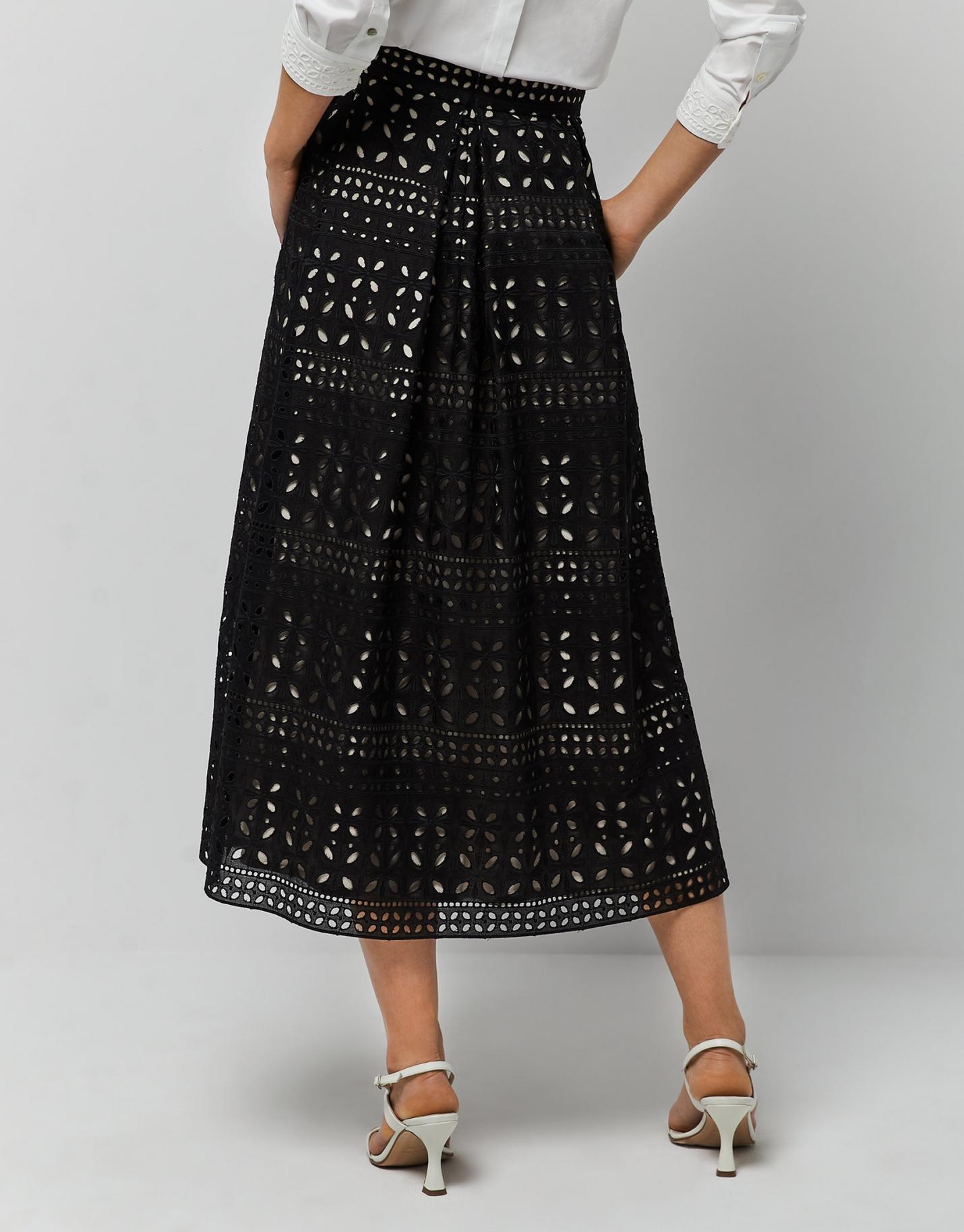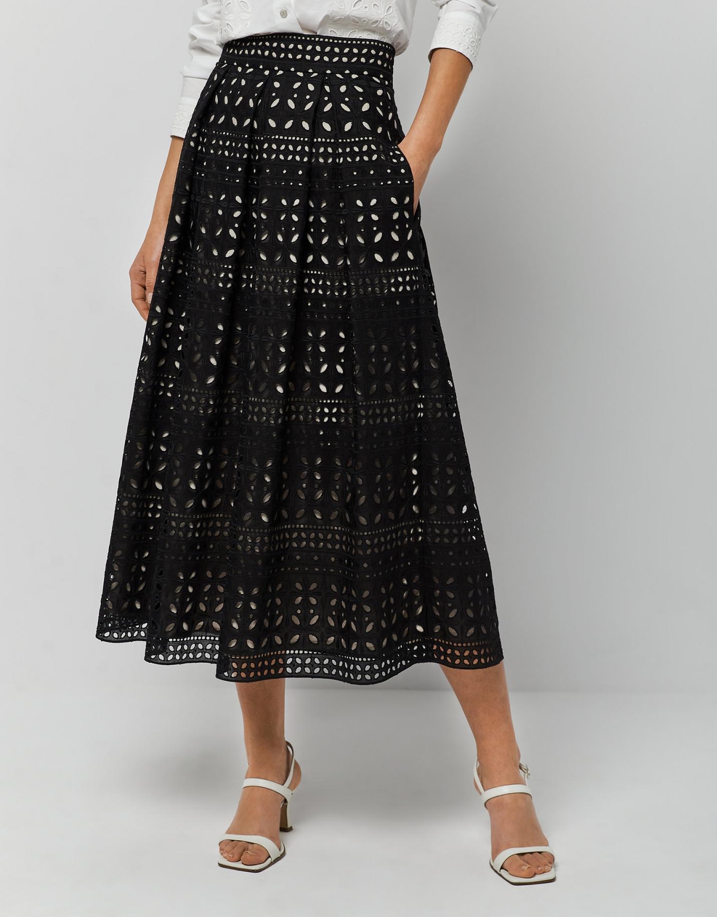 Falda midi en tejido con bordado suizo color negro con forro en tono crudo. Bolsillos en costura lateral y cierre mediante cremallera en centro espalda.