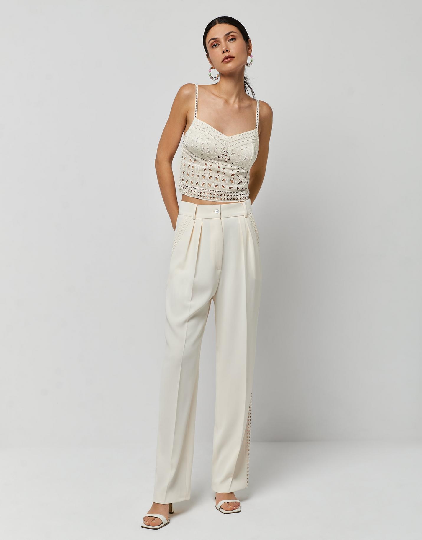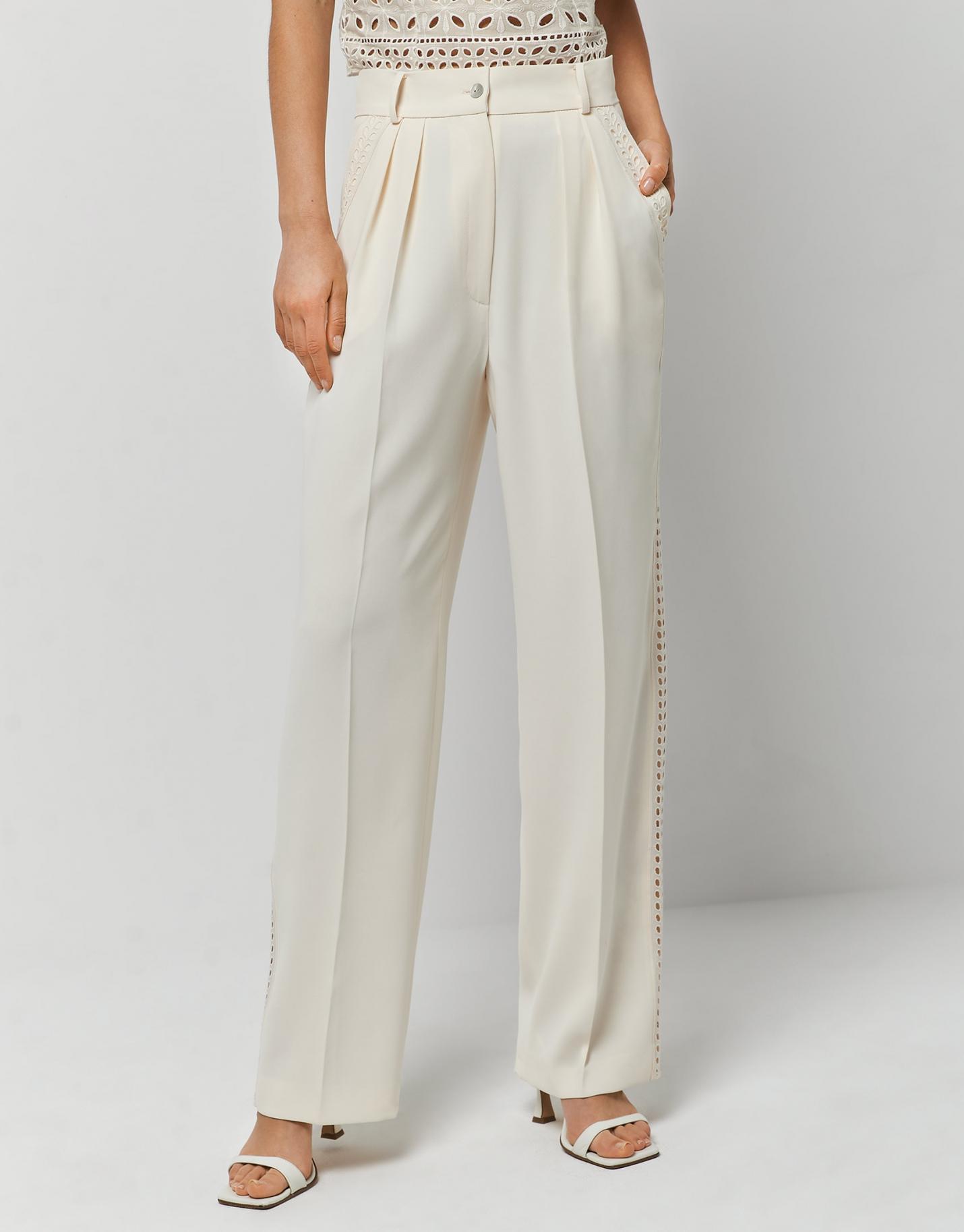 Pantalón recto en crepé beige claro con cintas de bordado suizo en laterales desde los bolsillos al bajo. Cintura alta con trabillas, pinzas en delantero y cierre con dos botones y cremallera oculta.
