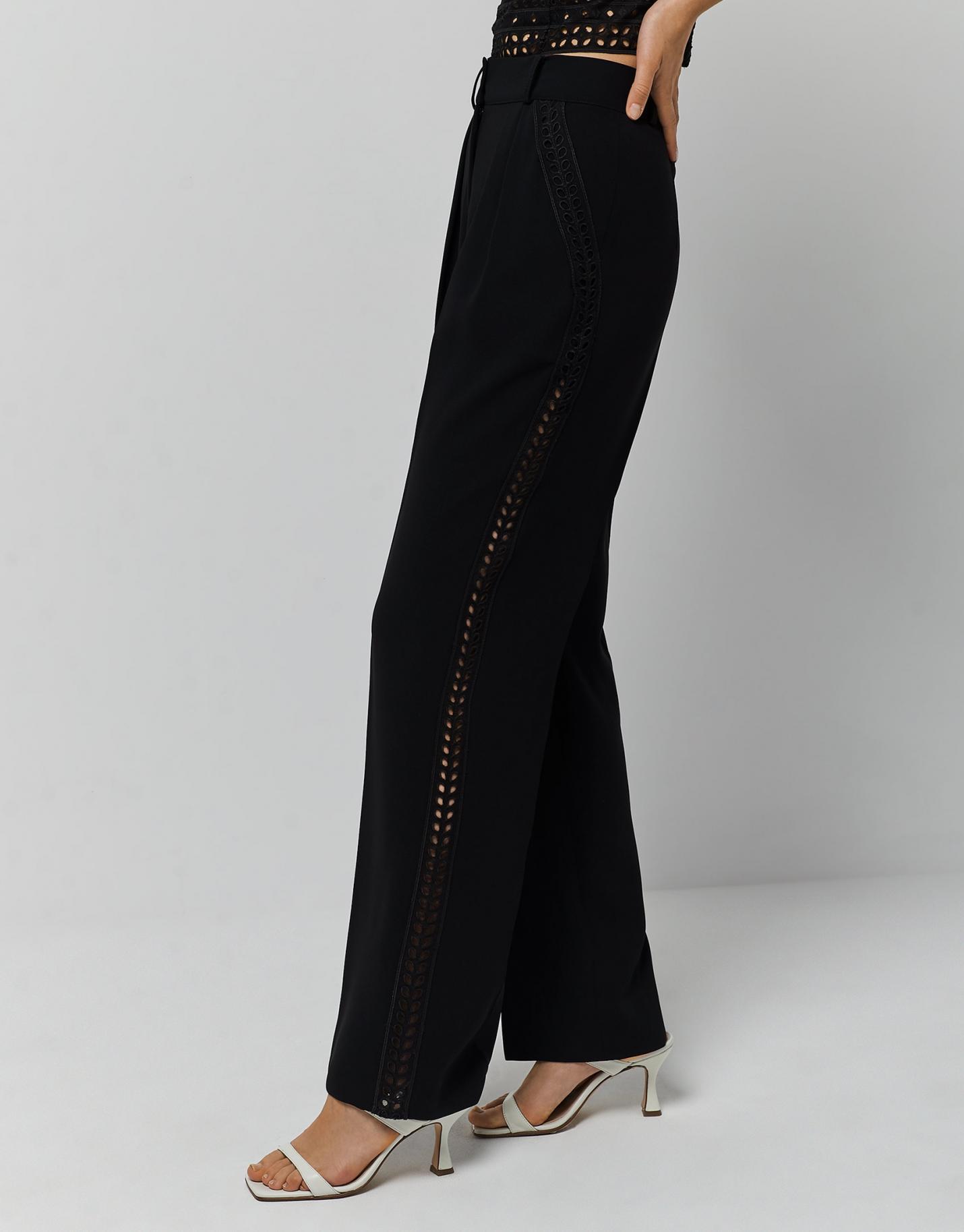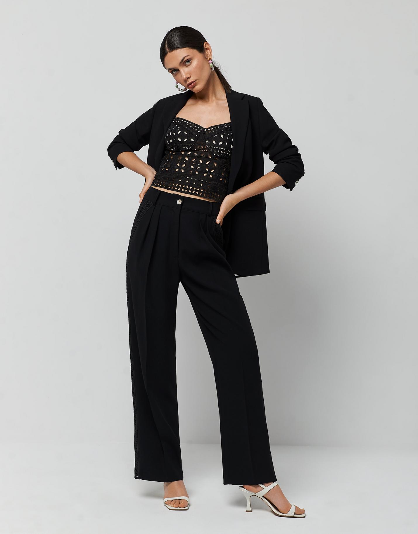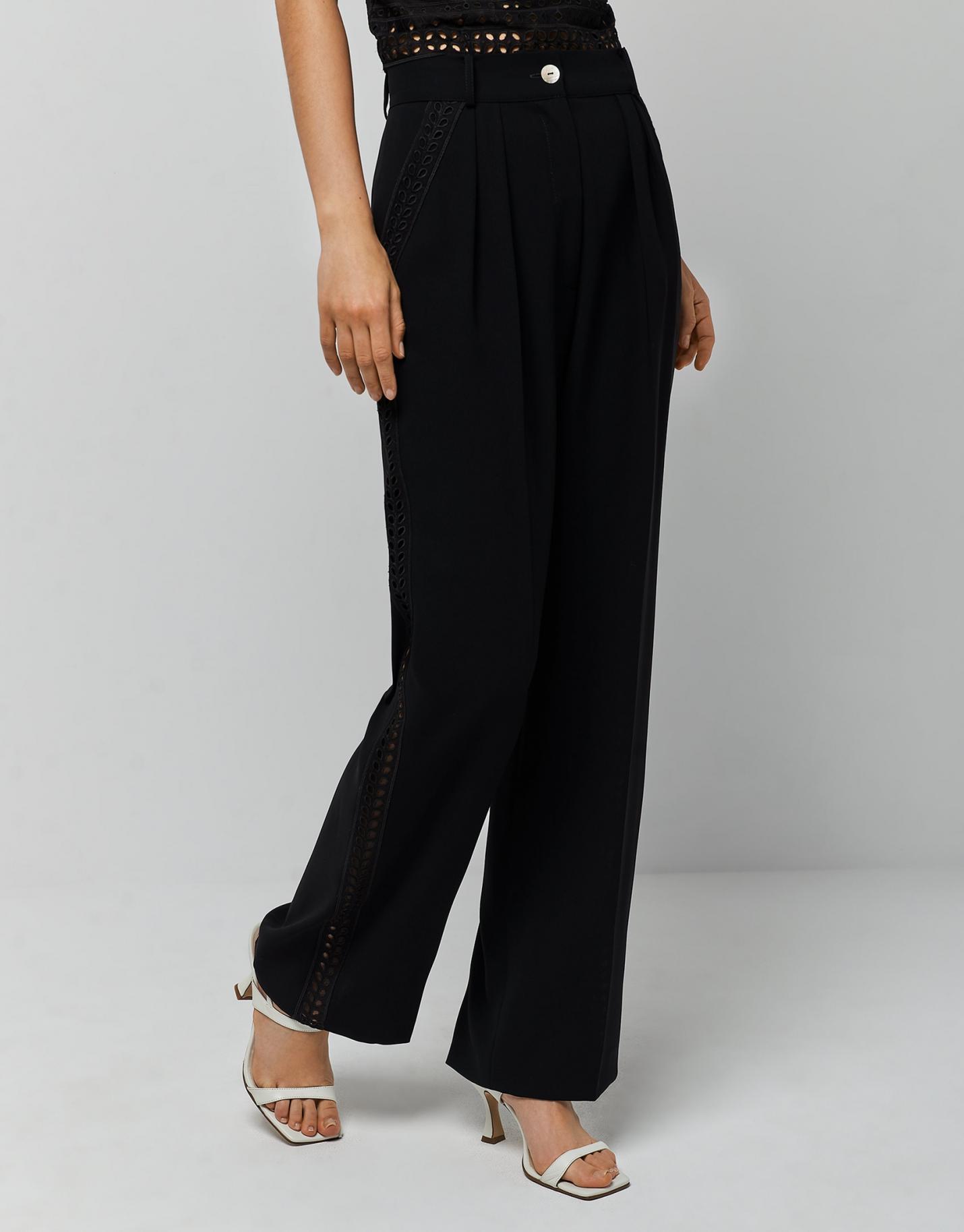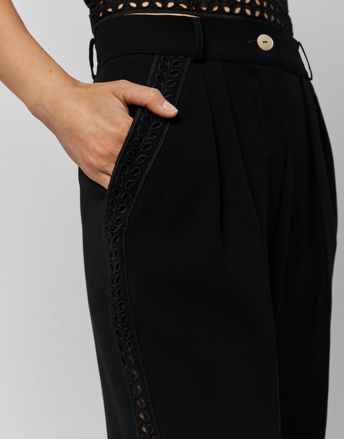 Pantalón recto en crepé negro con cintas de bordado suizo en laterales desde los bolsillos al bajo. Cintura alta con trabillas, pinzas en delantero y cierre con dos botones y cremallera oculta.