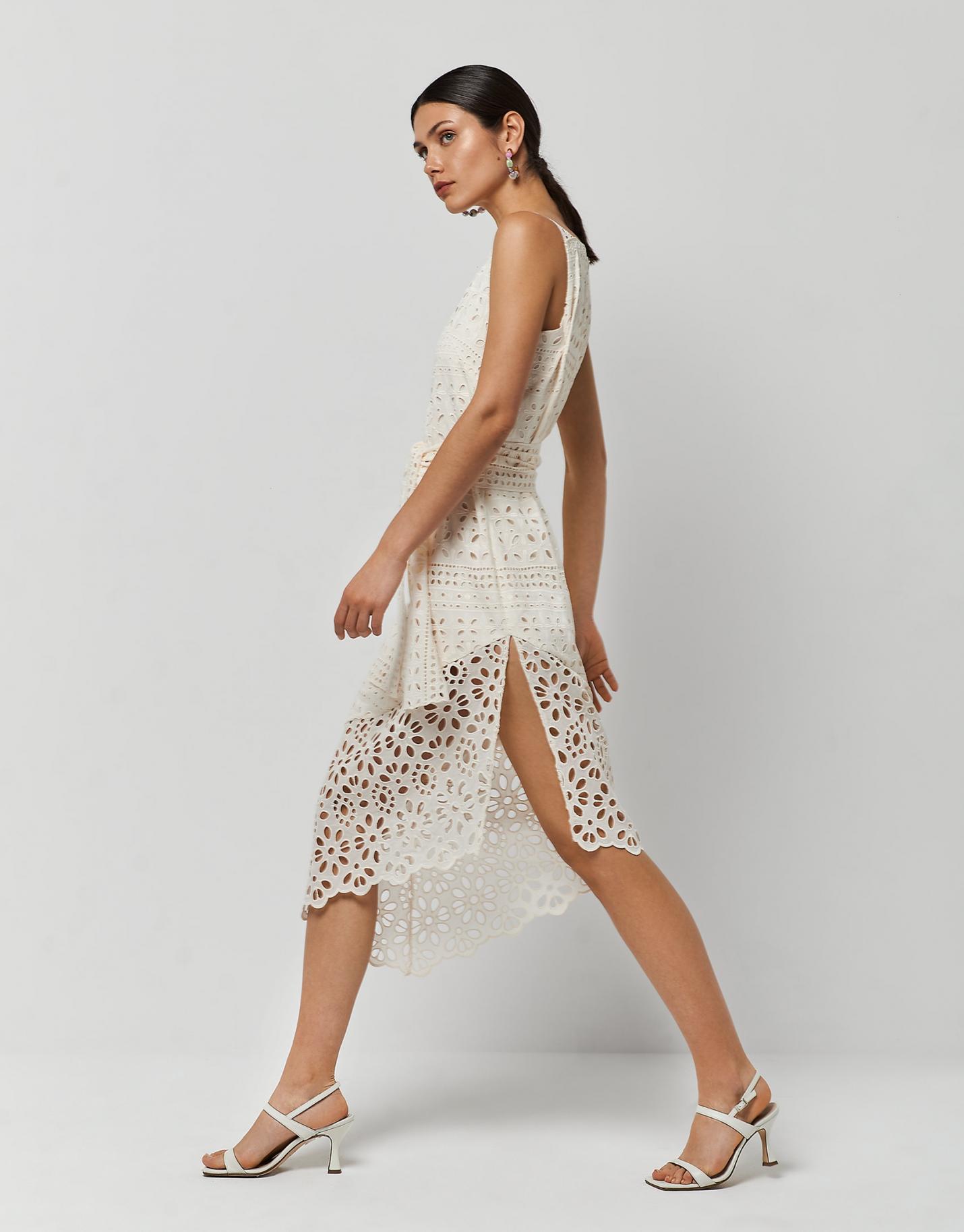 Vestido de sisas en tejido con bordado suizo color beige claro con forro interior en tono natural. Cintura ceñida con cinturón del mismo tejido y falda con bajo asimétrico.