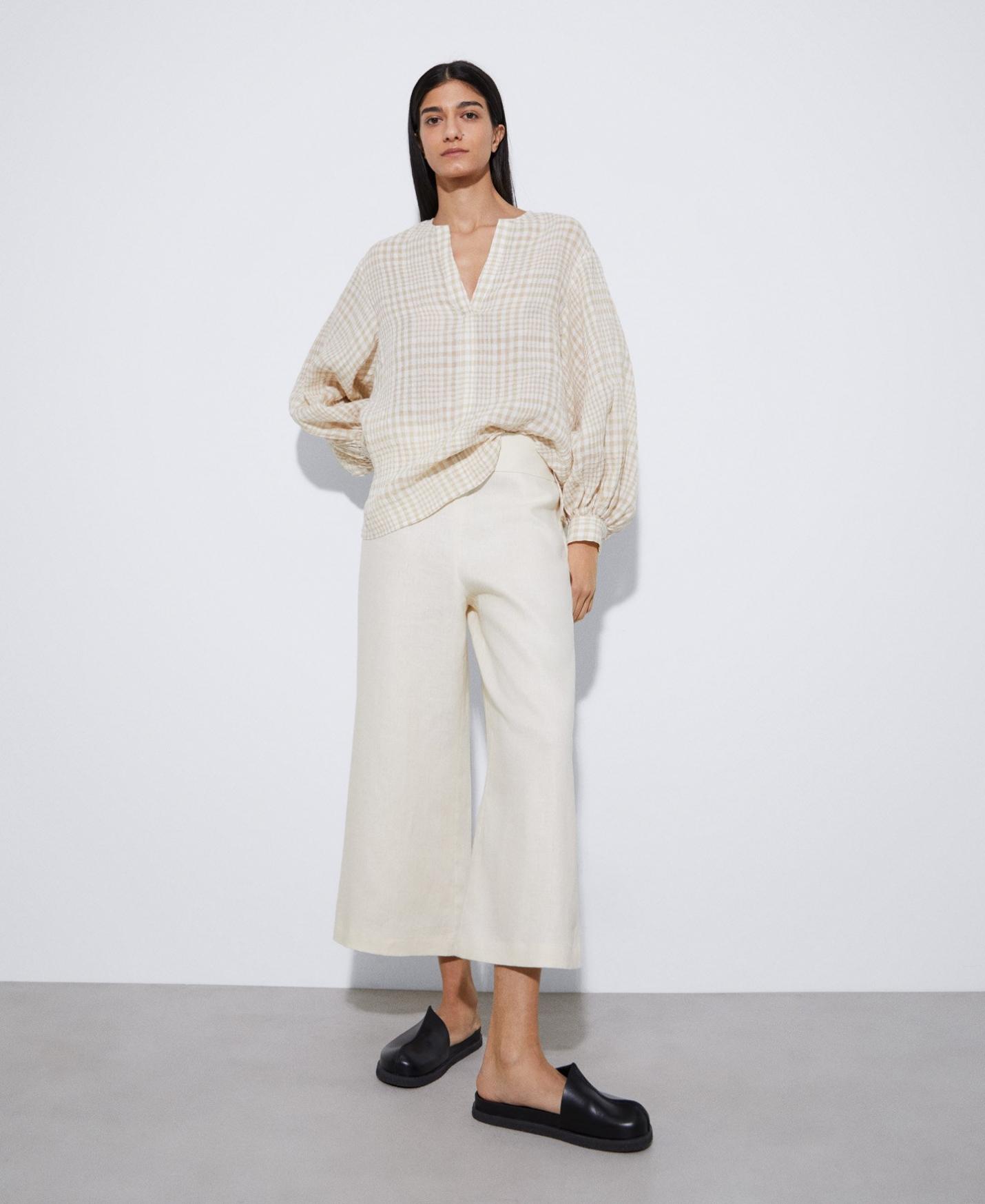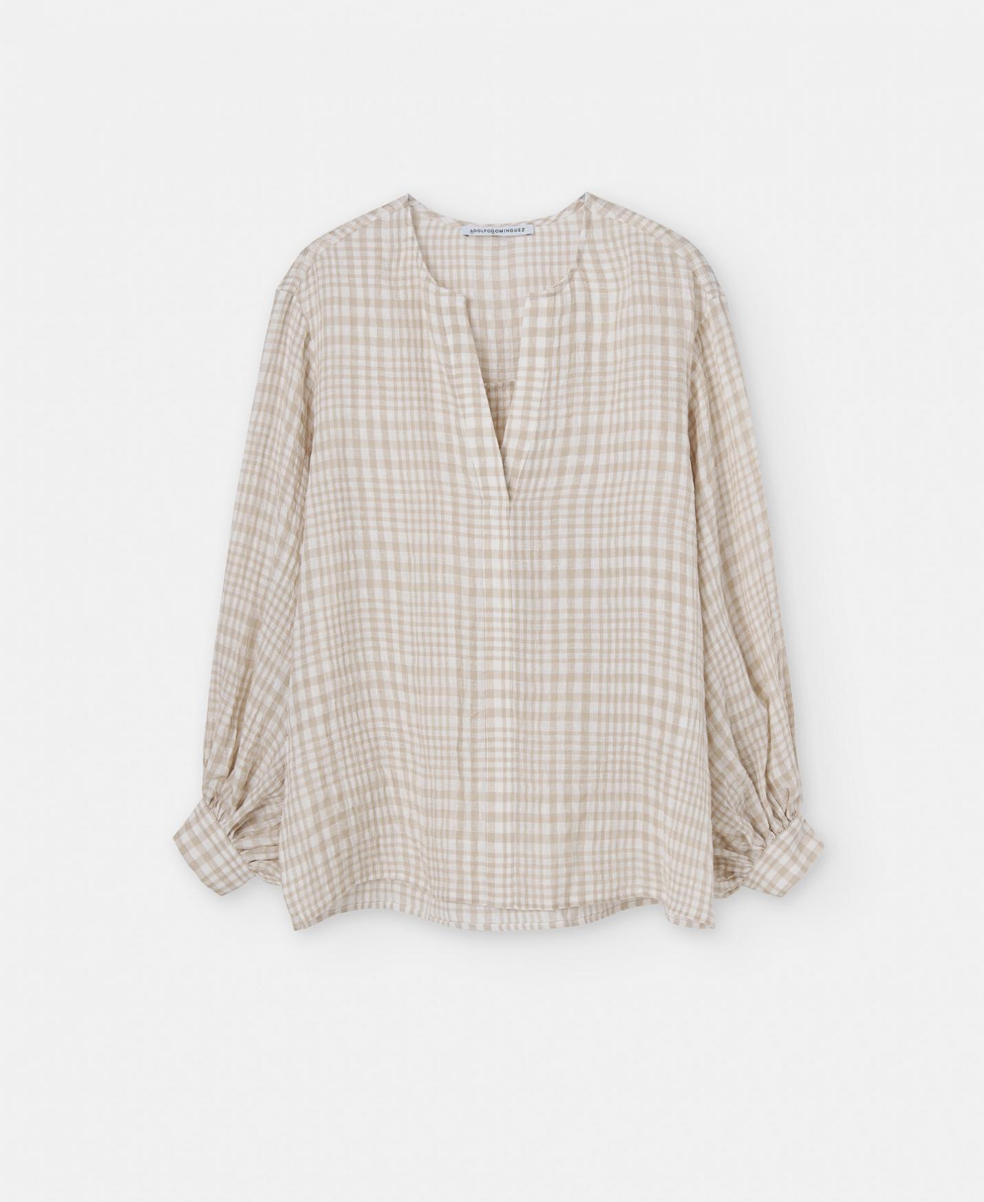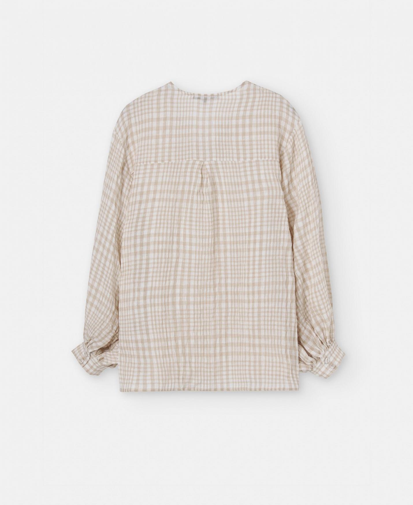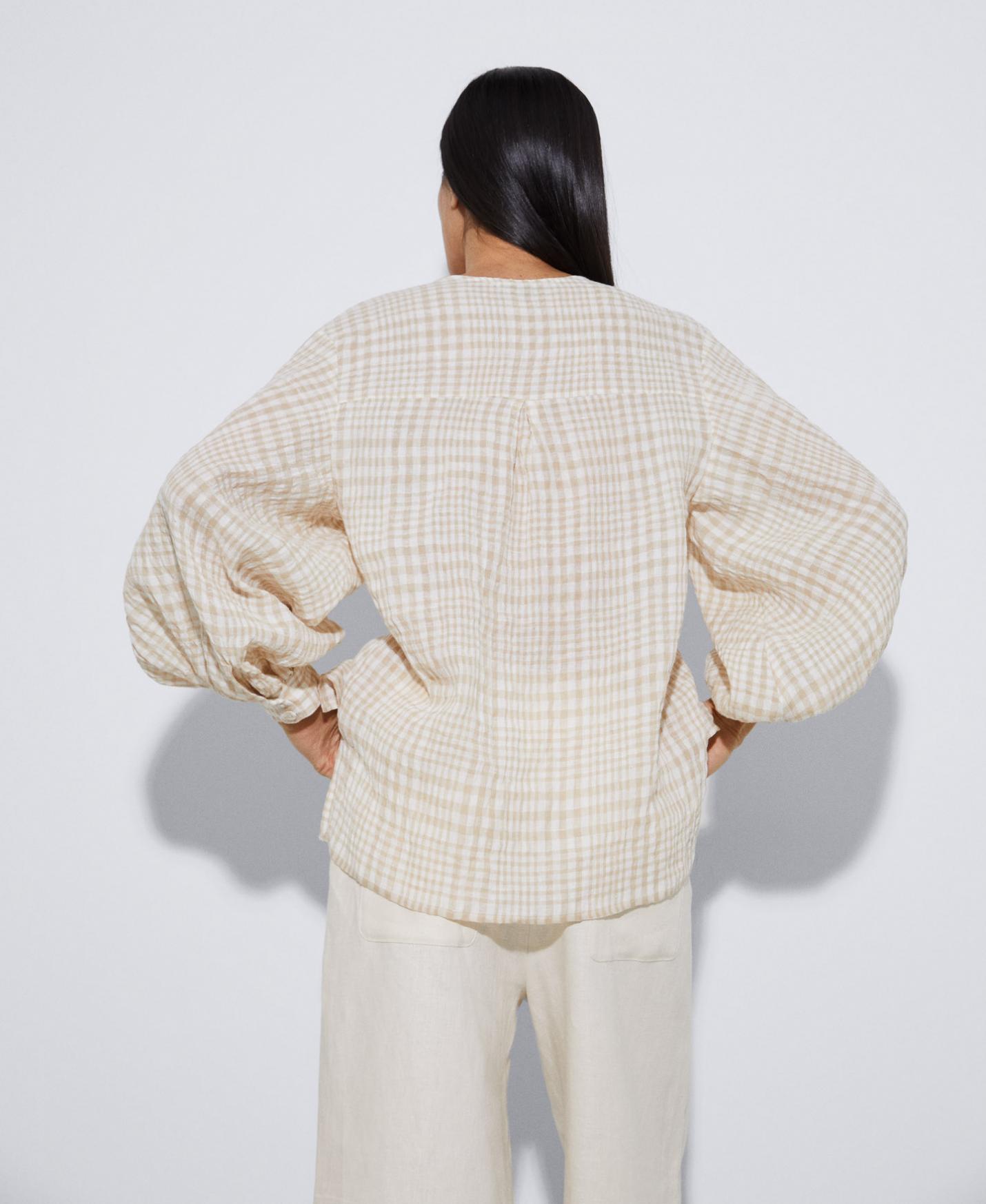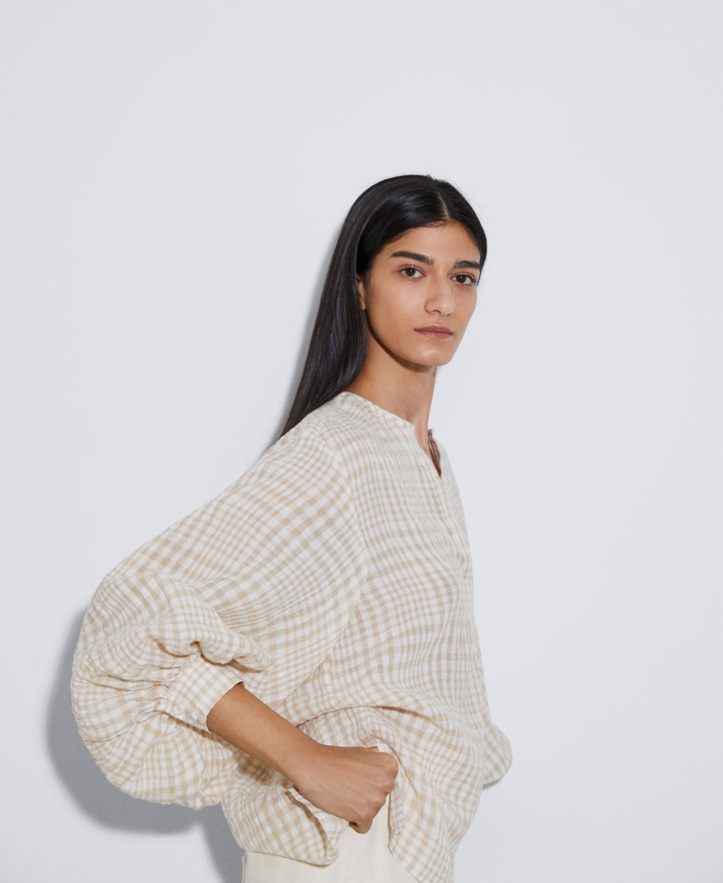 Blusa de cuadros en lino y algodón. Tiene tapeta frontal, mangas volumétricas recogidas por puño y botón forrado.